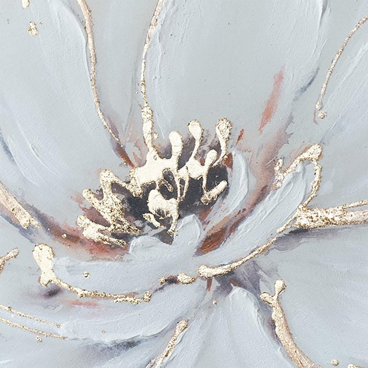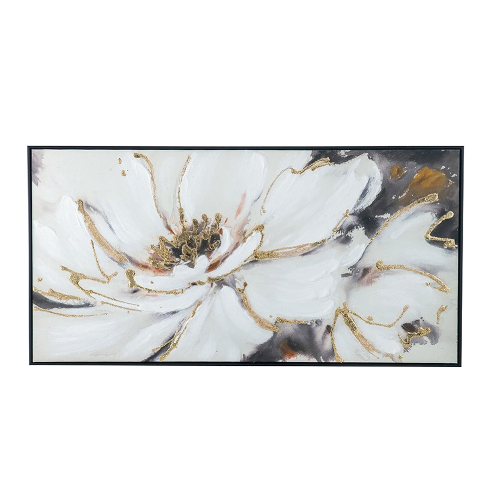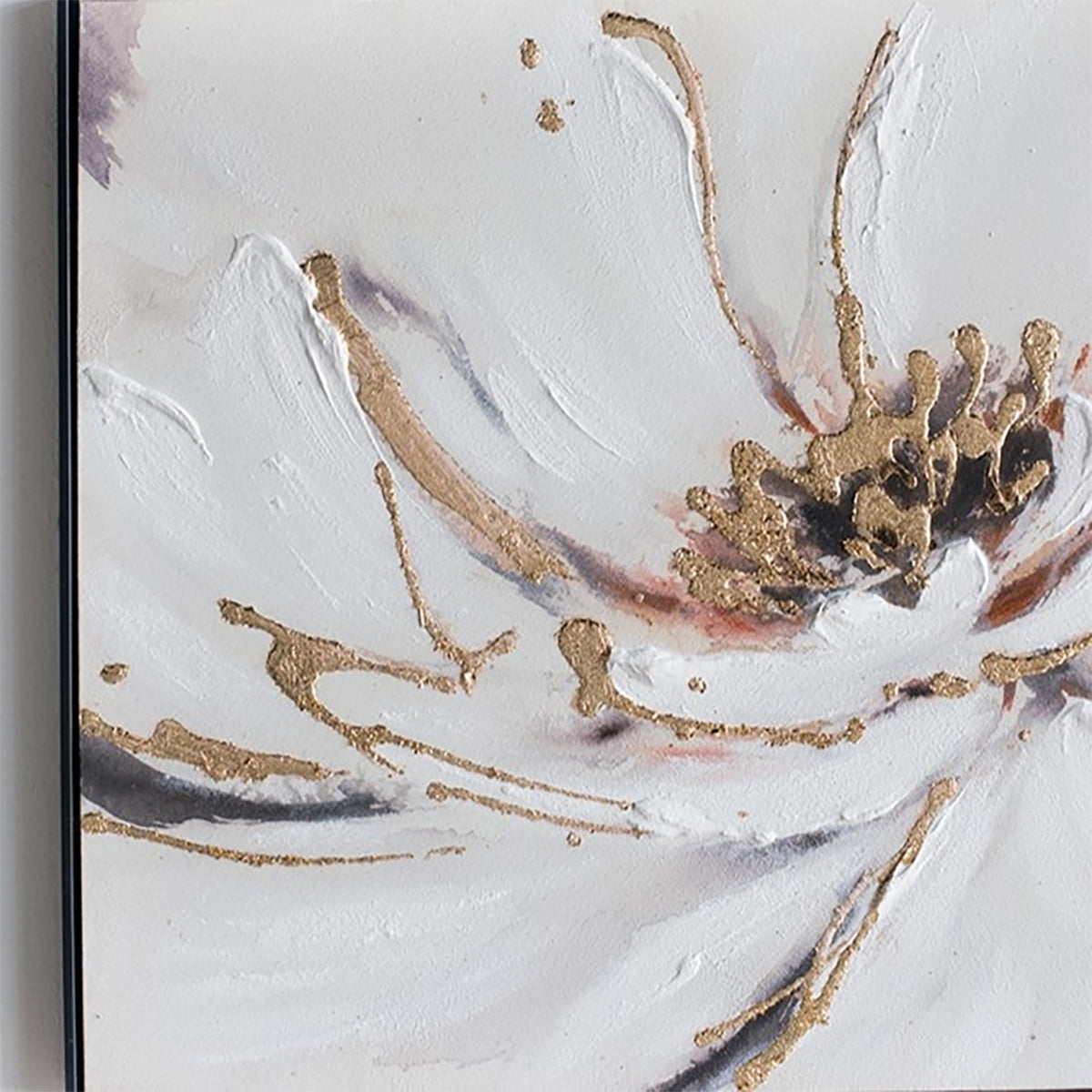 大きなホワイトフラワーを中心に、グレーの柔らかな陰影とメタリックゴールドのハイライトがバランス良く配置されたデザインです。自然の優雅さとモダンな要素が融合し、どんなお部屋にも調和する洗練されたアート作品に仕上がっています。