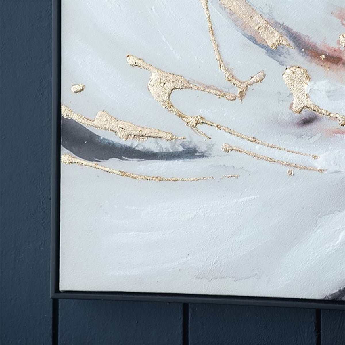 キャンバスの上に油絵風のテクスチャーを施し、本物の絵画のような凹凸を表現。メタルゴールドのアクセントがハイライトとなり、アートに深みを表現しています。