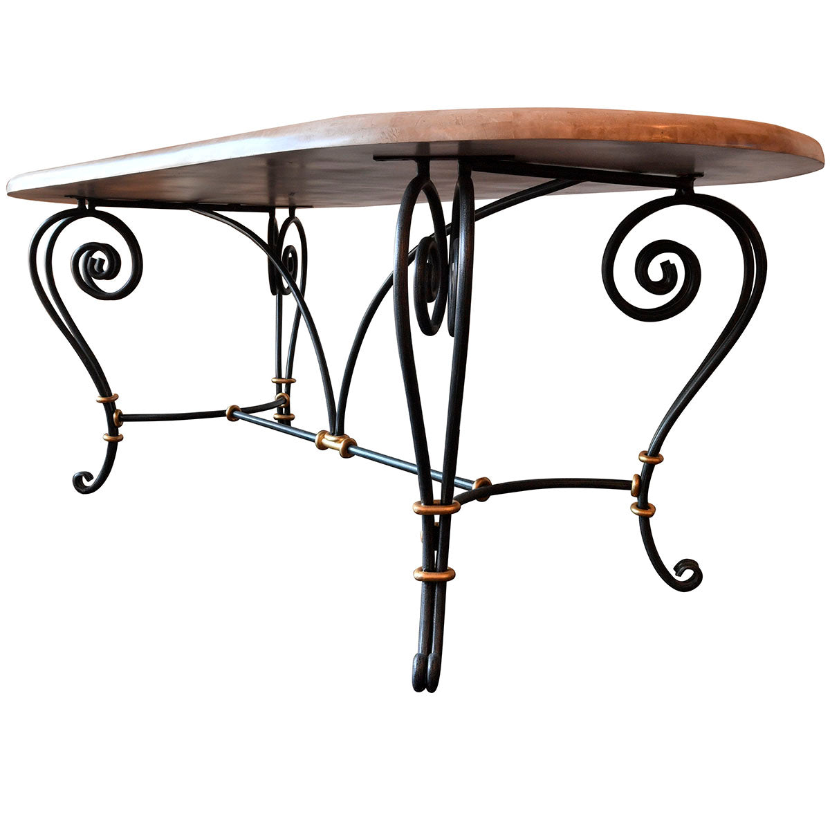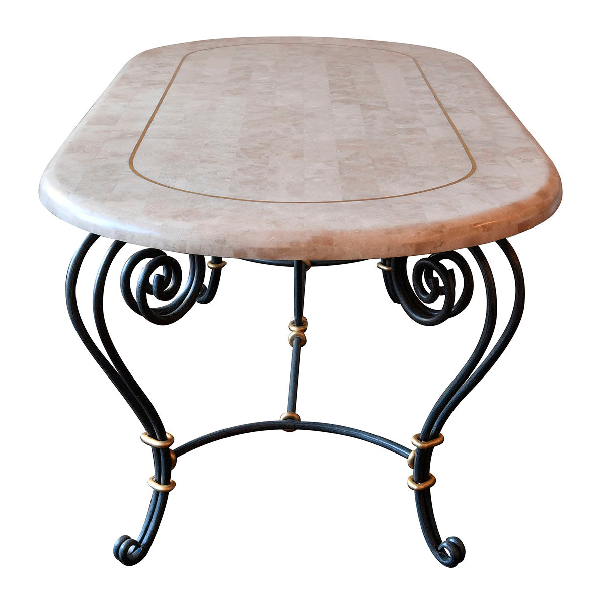 ラッフルズ楕円テーブルは、悠々としたリゾートホテルを思わせるような高級感あふれるダイニングテーブルです。180㎝×100㎝のゆったりとした楕円型のサイズは、4人から6人までゆったりとお掛けいただけます。天板には真鍮素材のゴールドの象嵌ラインが、曲線デザインの美しいアイアン脚には、ゴールドリングのパーツがアクセントに入っており、優雅で洗練された雰囲気をお楽しみ頂けます。