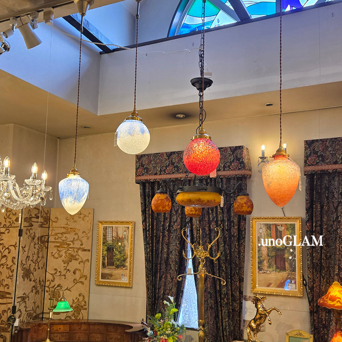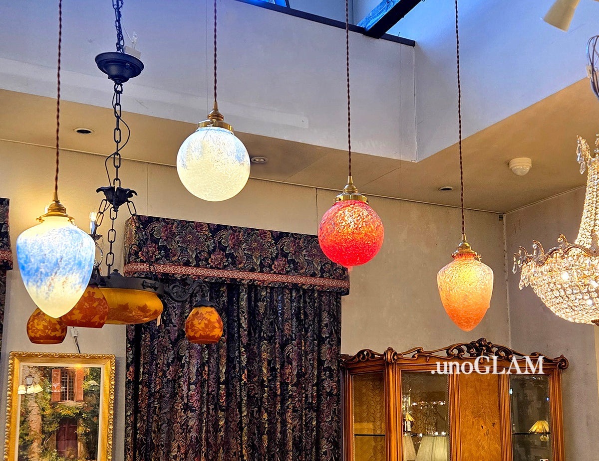 その名の通り、本格的なアンティーク感が楽しめるルーマニア製の手作りガラスペンダントライト。電気をつけると、やわらかな光がガラスを透かし、まるでキャンドルのよう。