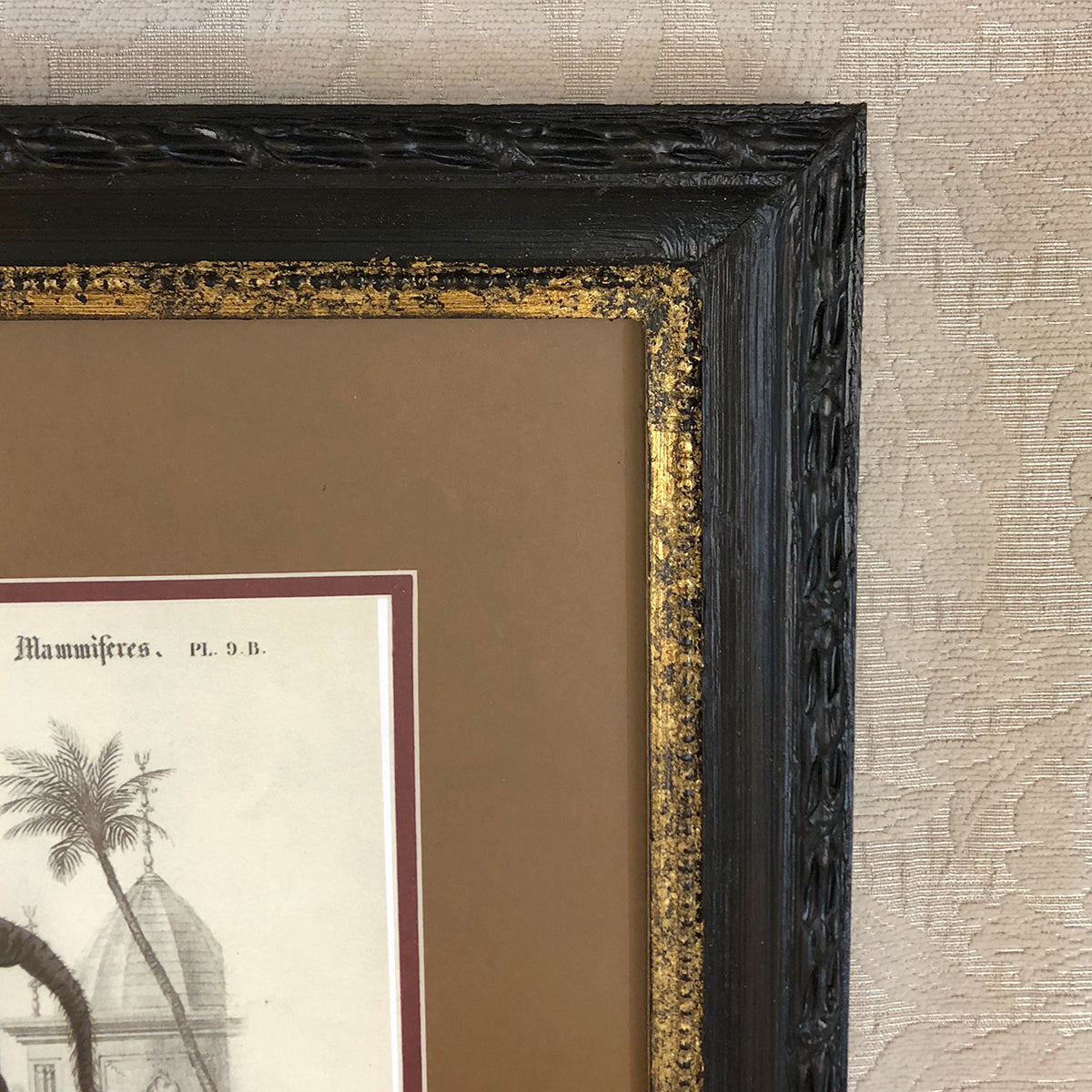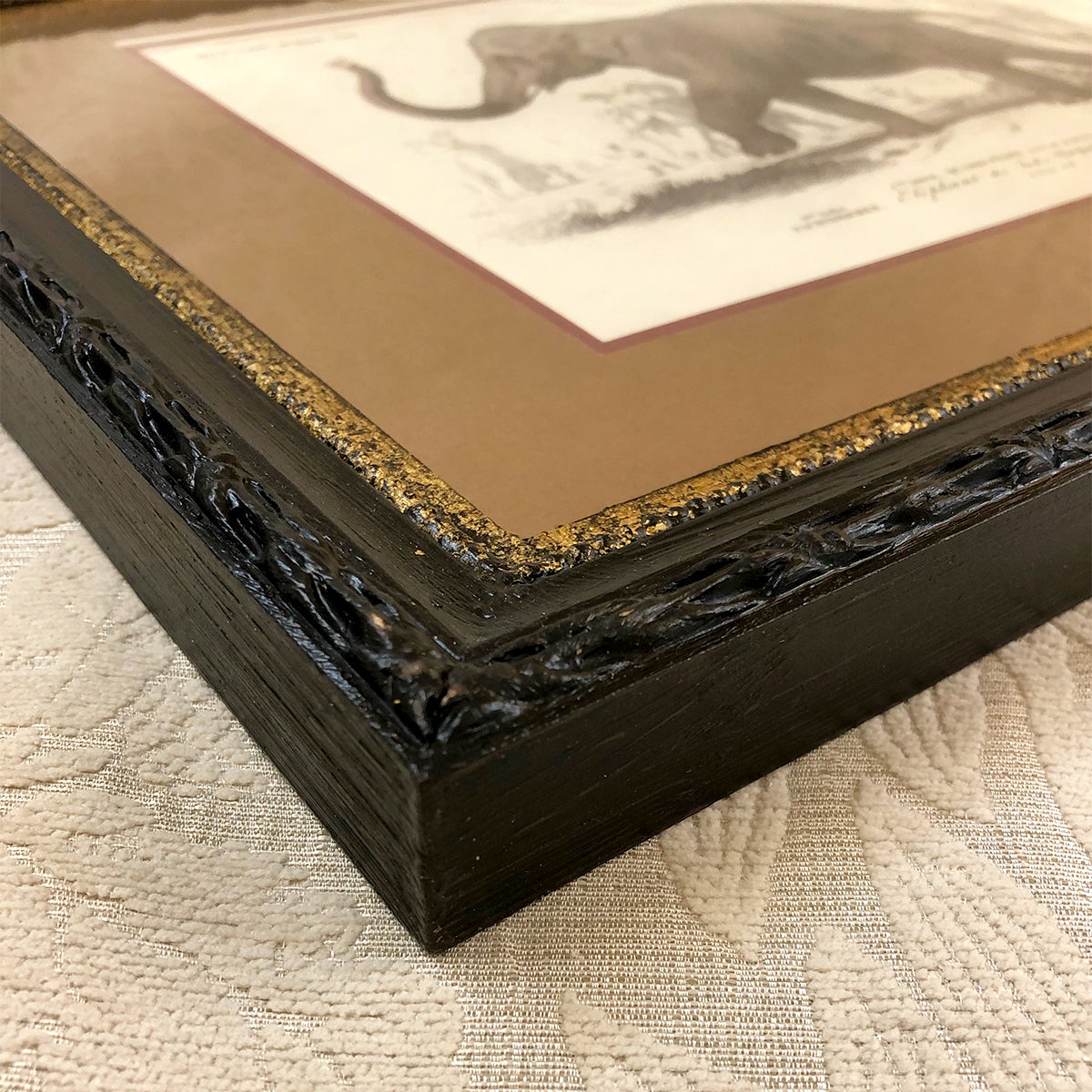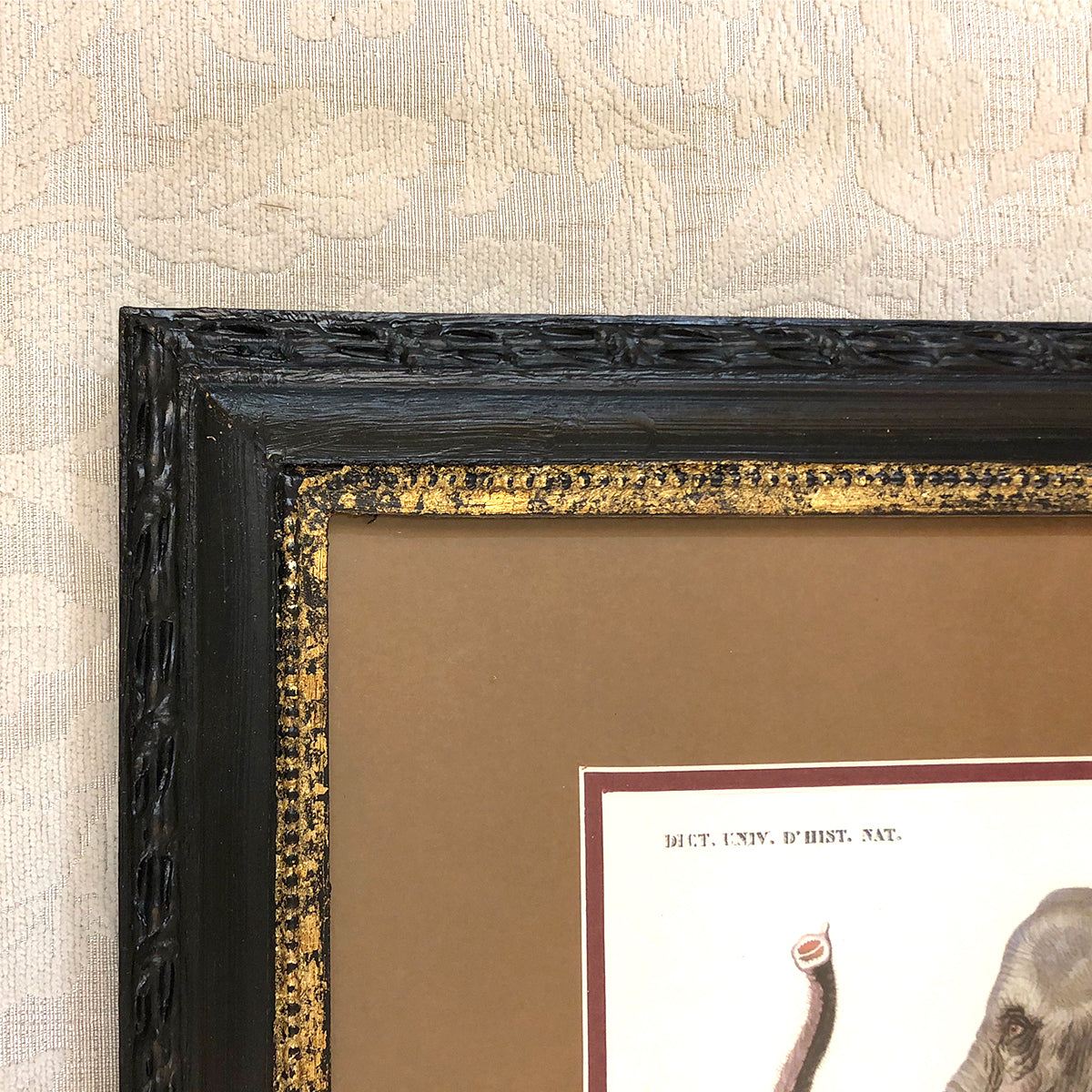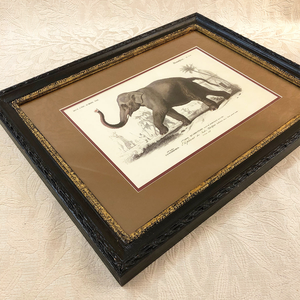 ヴィンテージな象の額絵の登場です。フレームには木材を使用、絵のベースは生成り色、黒フレームにゴールドのラフな装飾を施した味わいのある額絵です。
