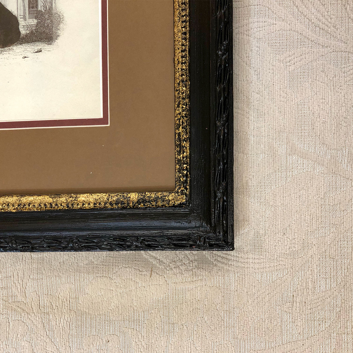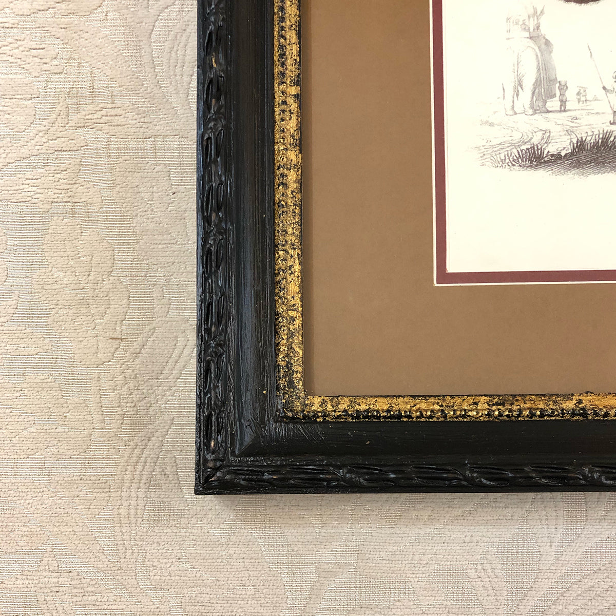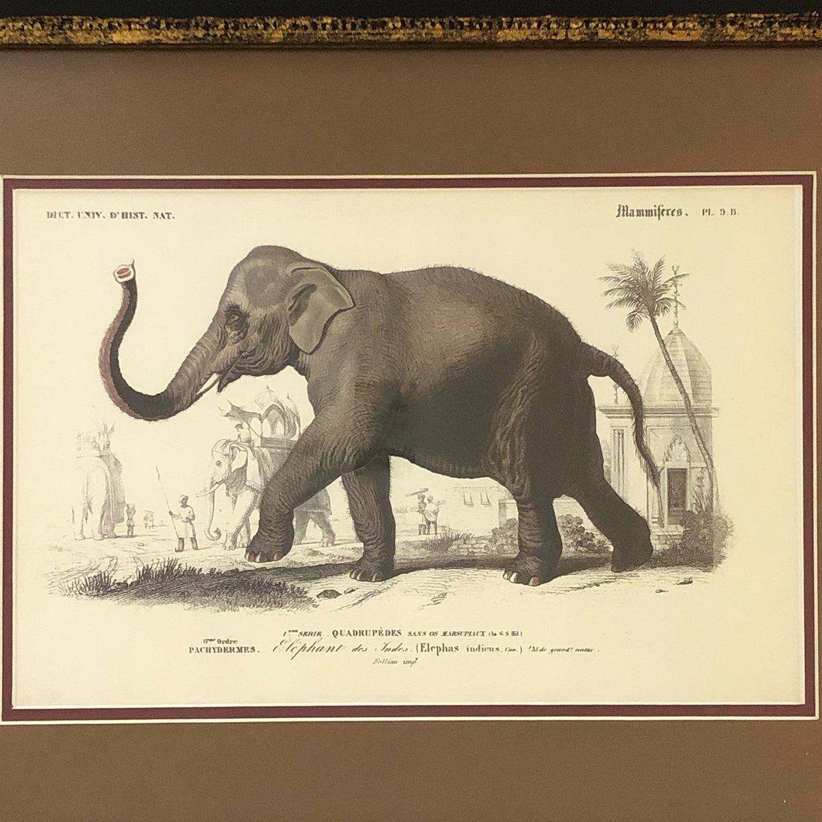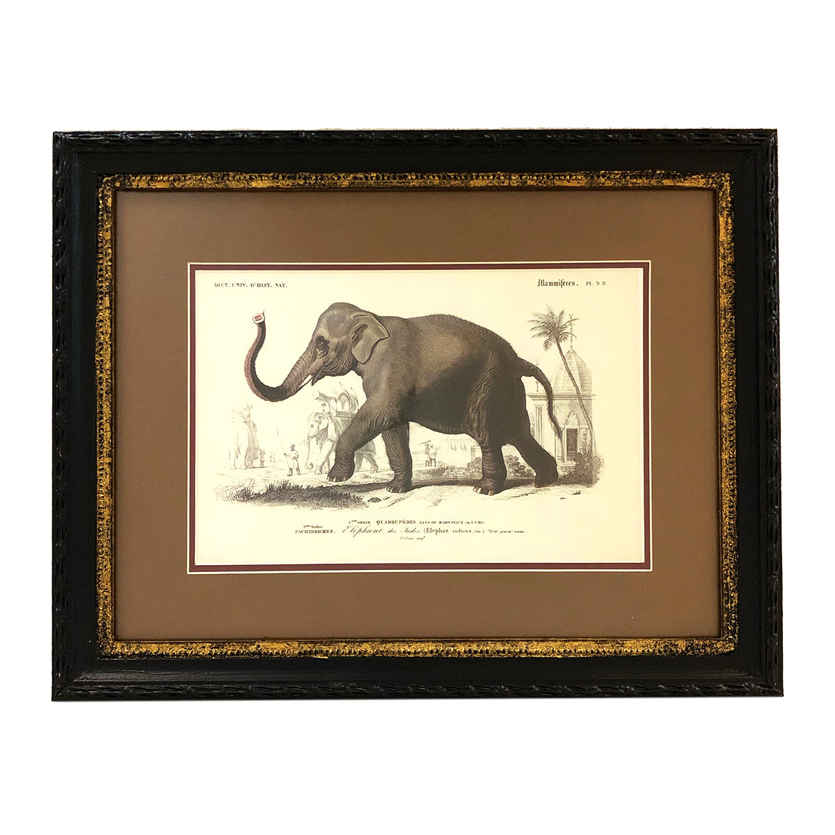 ヴィンテージな象の額絵の登場です。フレームには木材を使用、絵のベースは生成り色、黒フレームにゴールドのラフな装飾を施した味わいのある額絵です。