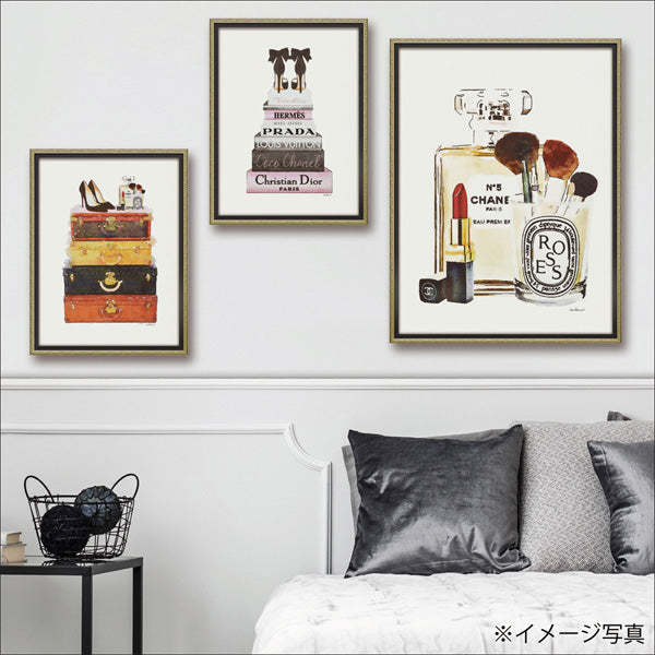 華やかでセレブリティなアート額はインテリアにマッチし高級感がありながら、一方で肩ひじを張らないカジュアルでラフなテイストも絵の中に盛り込まれています。花や動物、BOOK、ファッションモチーフなどを用いて、女性らしい繊細で柔らかな世界観を表現した人気のアート額です。様々なテイストにマッチングしやすいアート額はセレブリティ、モダンインテリアやスタイリッシュ、メルヘン、ヨーロピアン等どこに飾るかはあなた次第。パロディ感満載の乙女心をくすぐるオマージュアート額です。