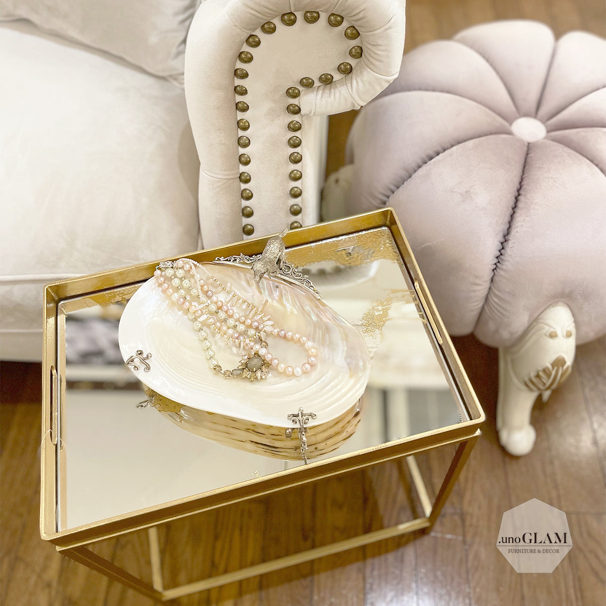 ミラーに施されたゴールドの模様がおしゃれ
