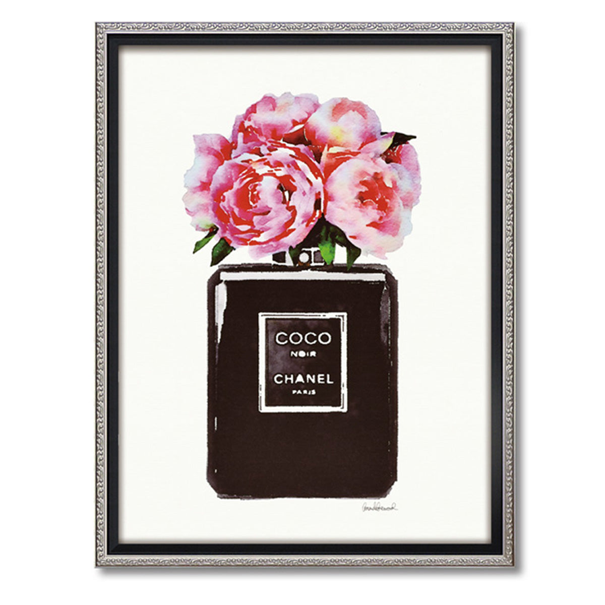 セレブリティなインテリアアート額。ココシャネルのパヒュームボトルに華やかなピオニーの絵がセレブリティなアート額は、ファッショナブルで乙女心をくすぐるパロディアートです。