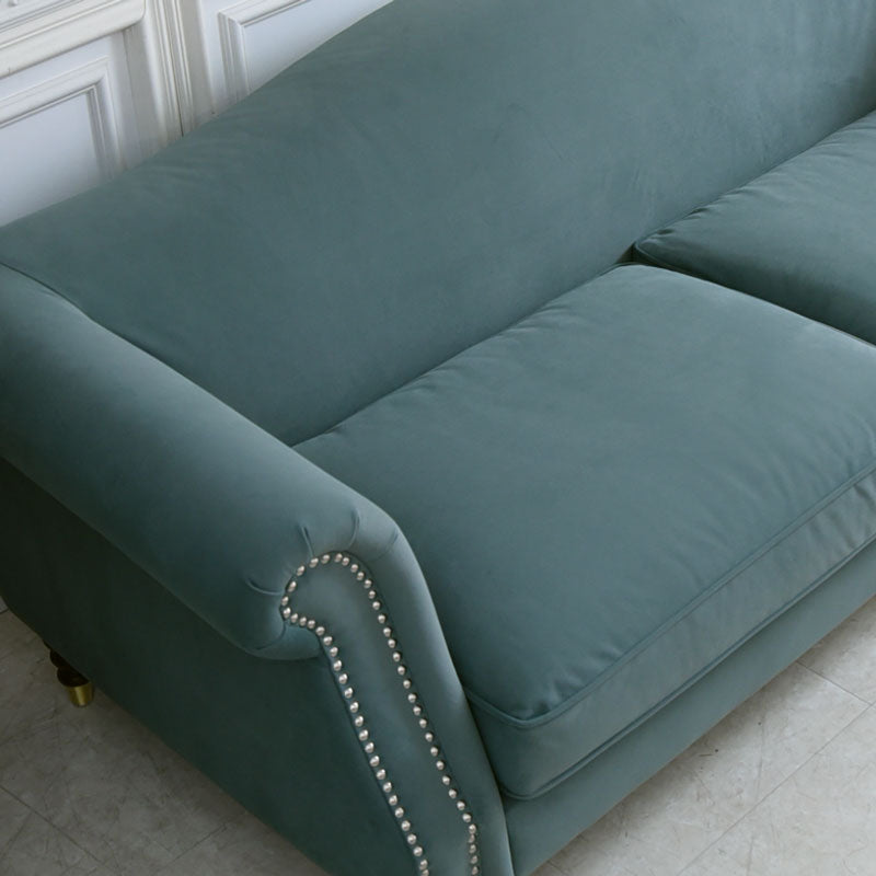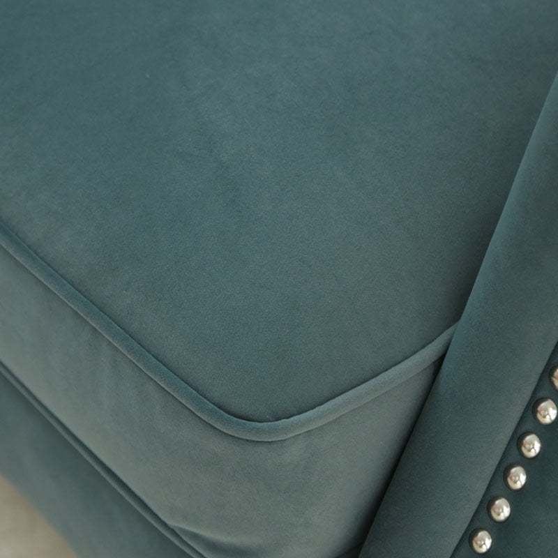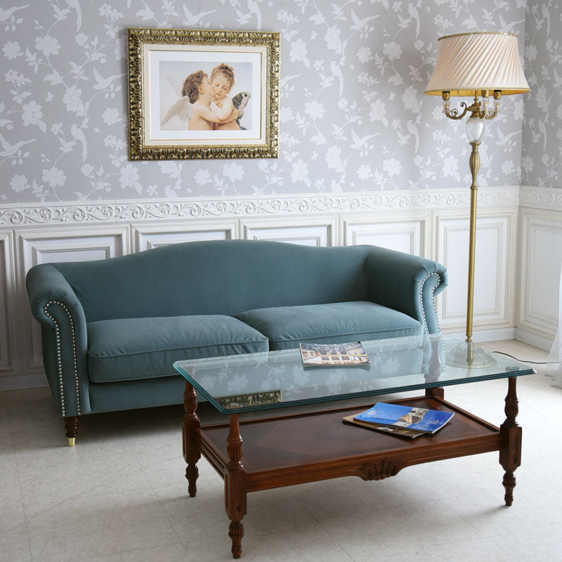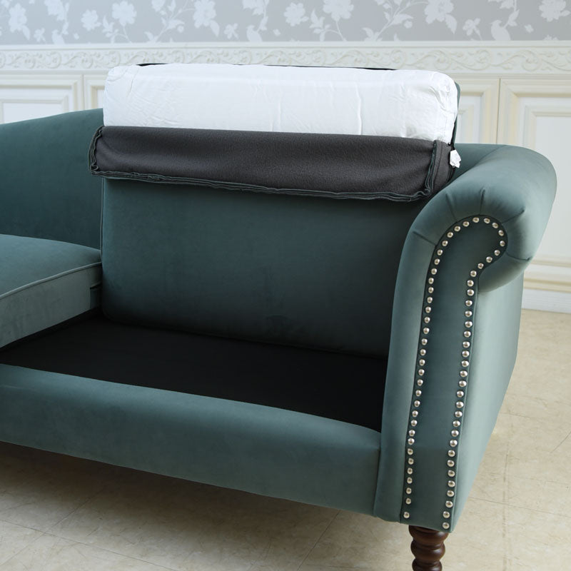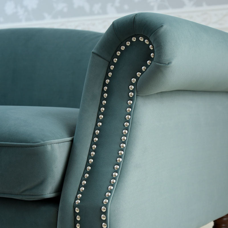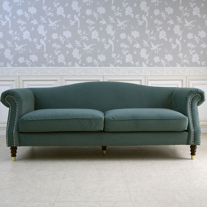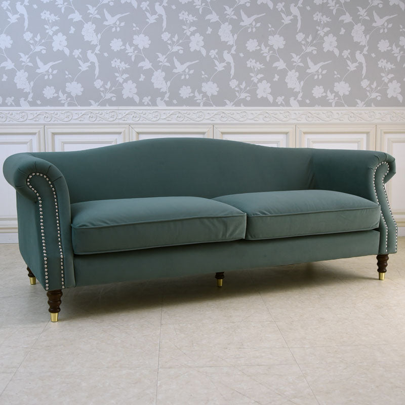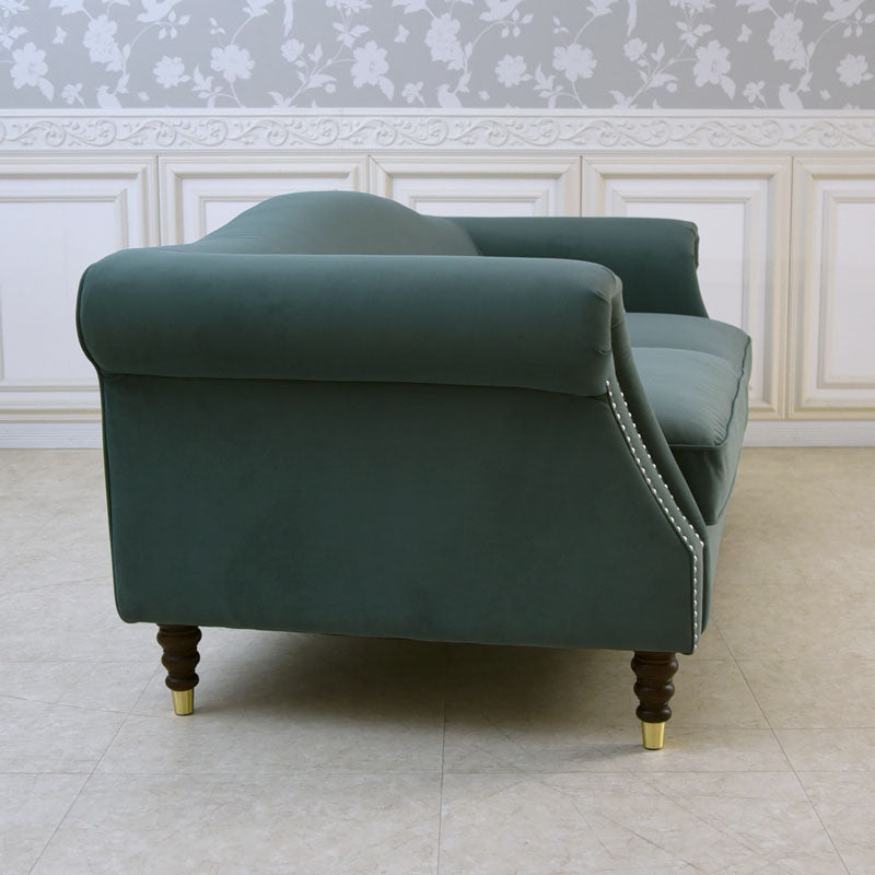 深みのあるグリーンが美しい、クラシックモダンな3人掛けソファ。アーム部分にあしらわれたスタッズがさりげない高級感を演出し、大人の空間にしっくりと馴染みます。