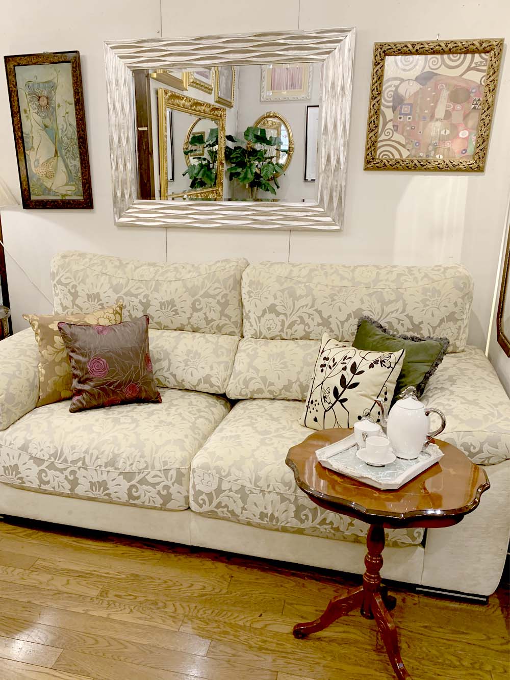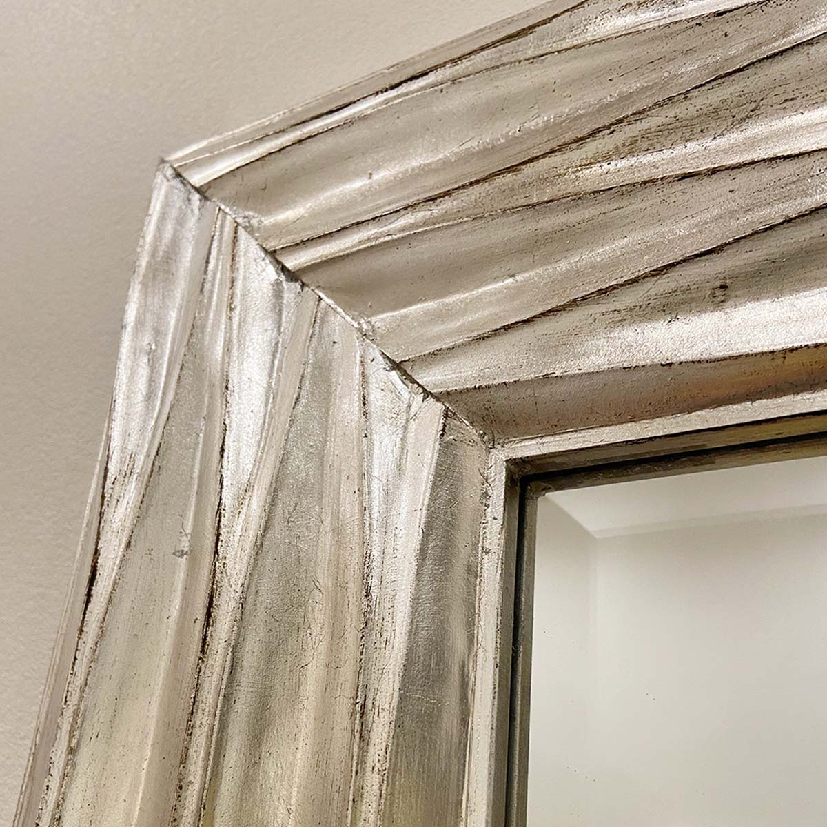 シルバーフレーム部分にはアンティーク加工が施されており、あえてラフなこなれた雰囲気に仕上げています。また、ミラー面には面取り加工が施され高級感のある仕上がりに。インテリア性の高い壁掛けミラーは、空間を広く見せてくれます。