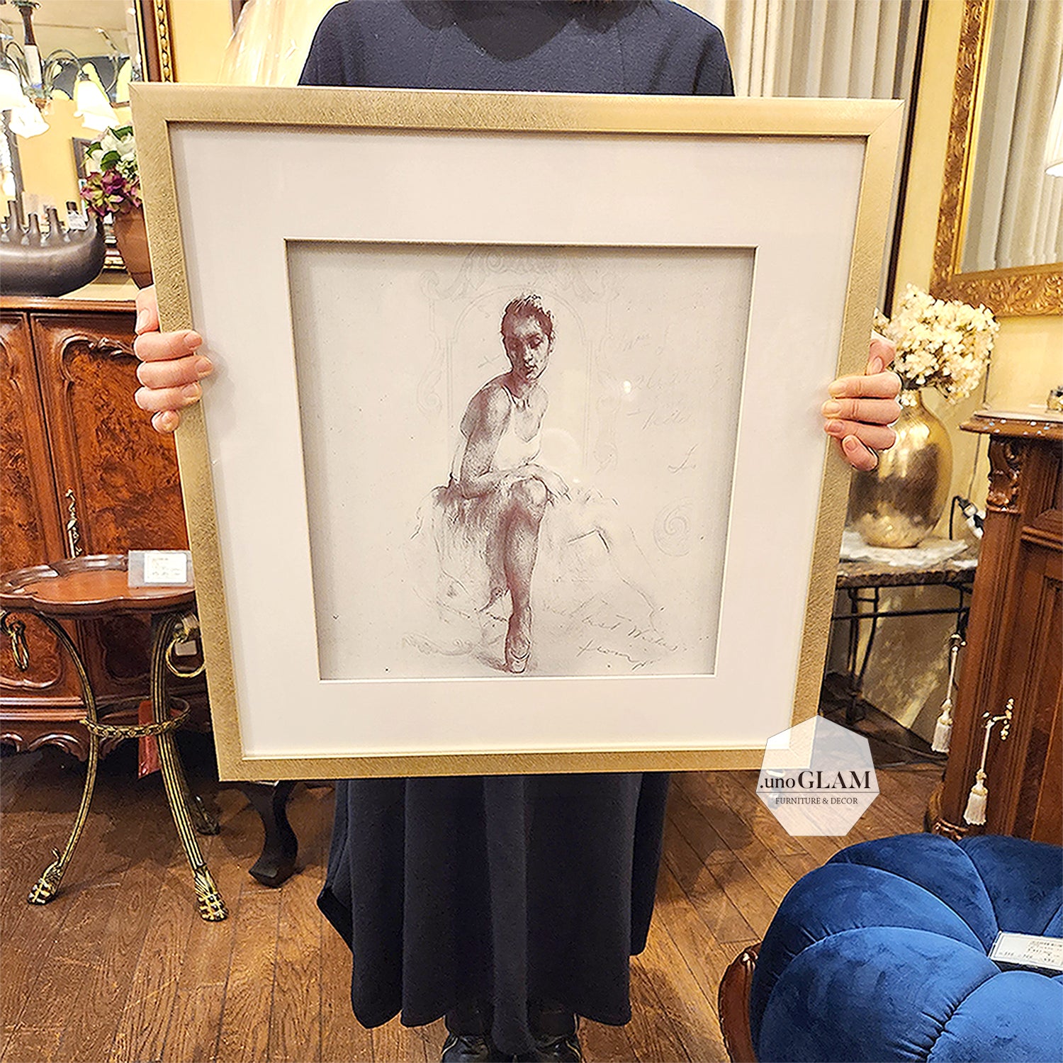 バレリーナの額絵が入荷しました。モダンなゴールドフレームでエッチング技法が美しい絵画です。バレリーナの静かな佇まいが繊細に描かれており、内面的な美しさが見る人を虜にします。