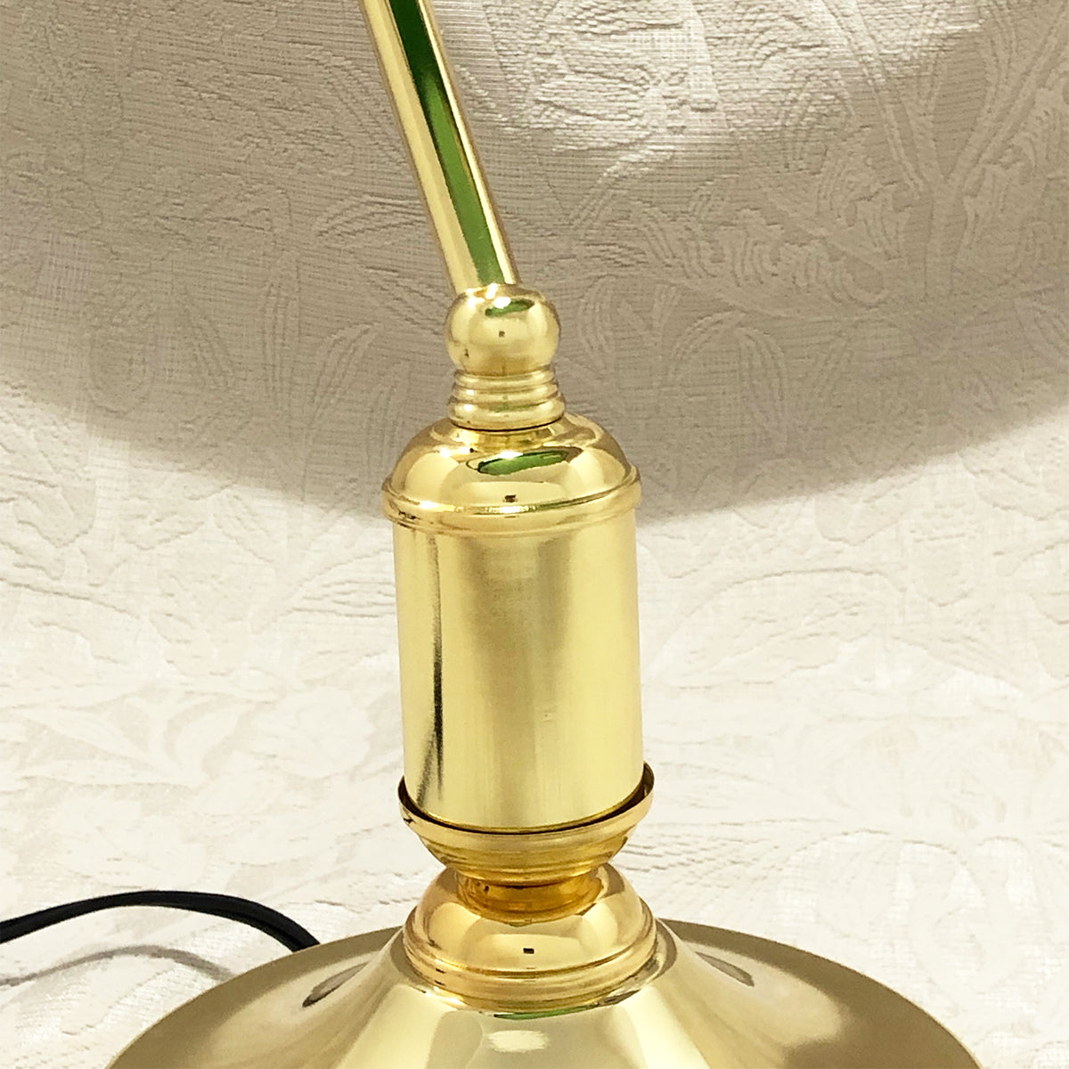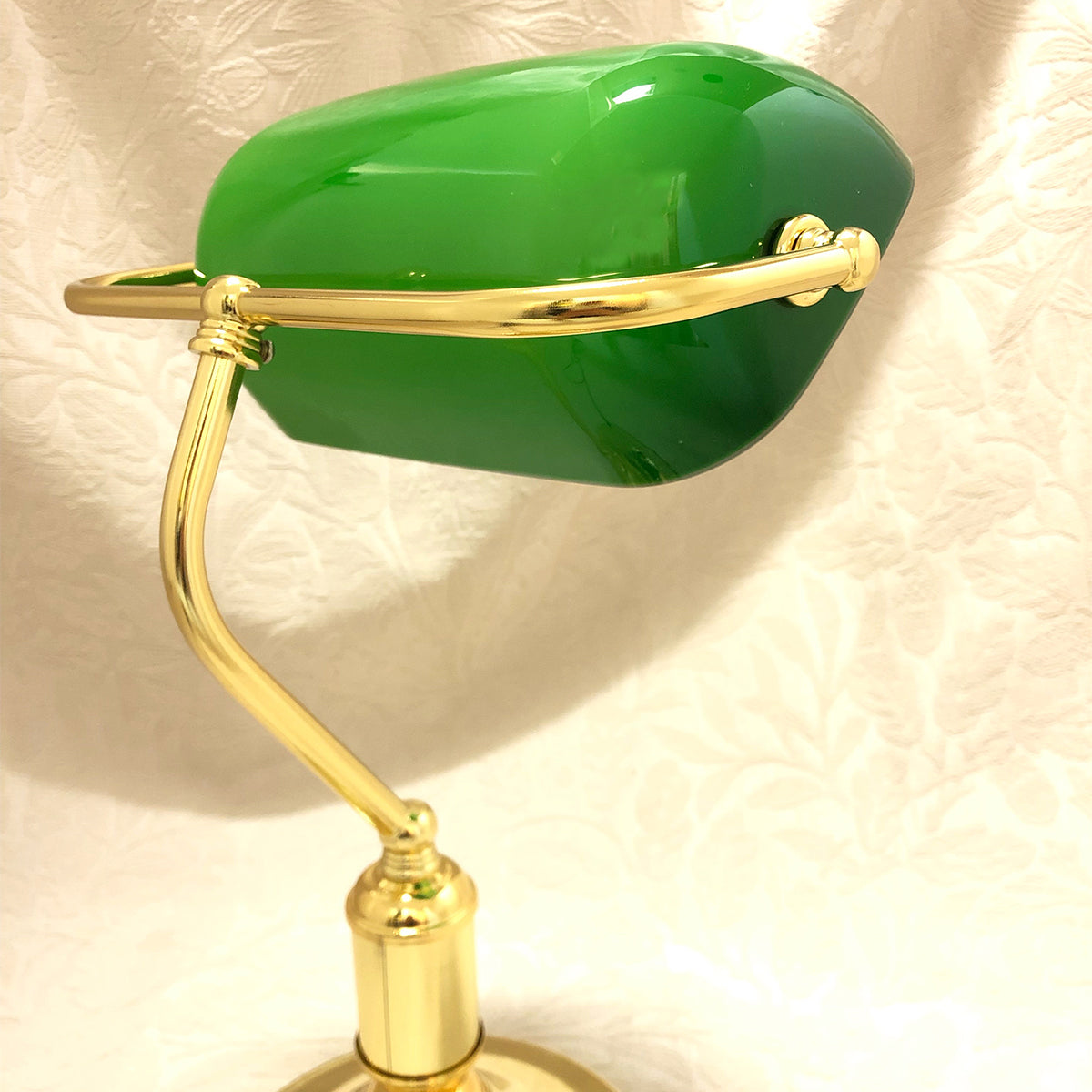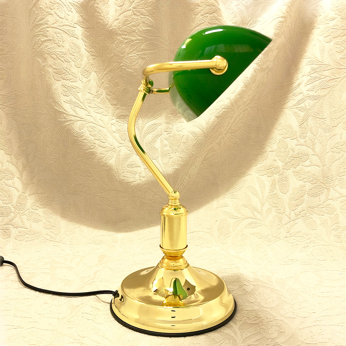 実店舗でも憧れのランプとして人気の高いバンカーズランプは、海外の映画やドラマでも社長室や会議室、図書館や裁判官のデスク前などでよく見かけることがありますね。真鍮のフレームにグリーンのガラスシェードが特徴です。