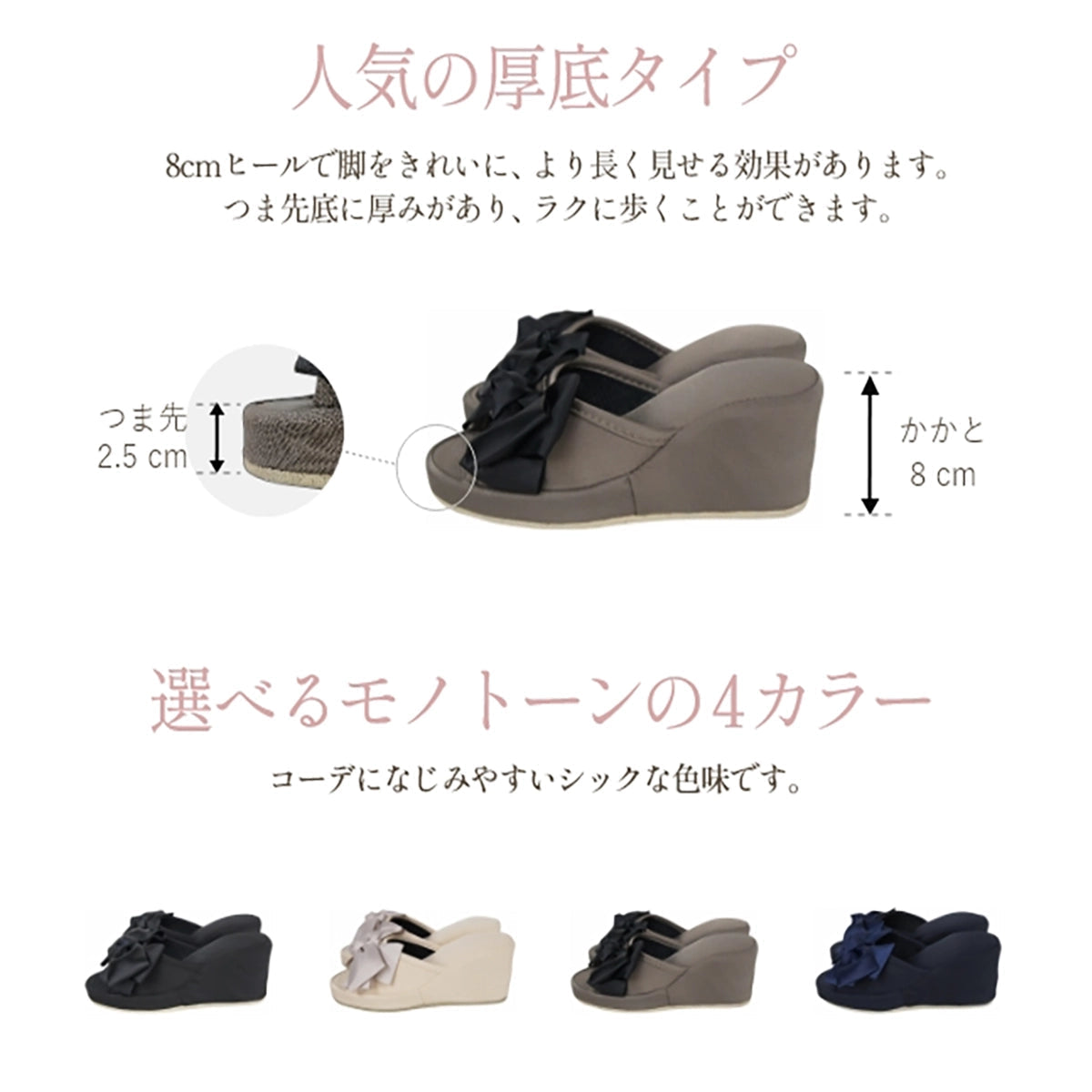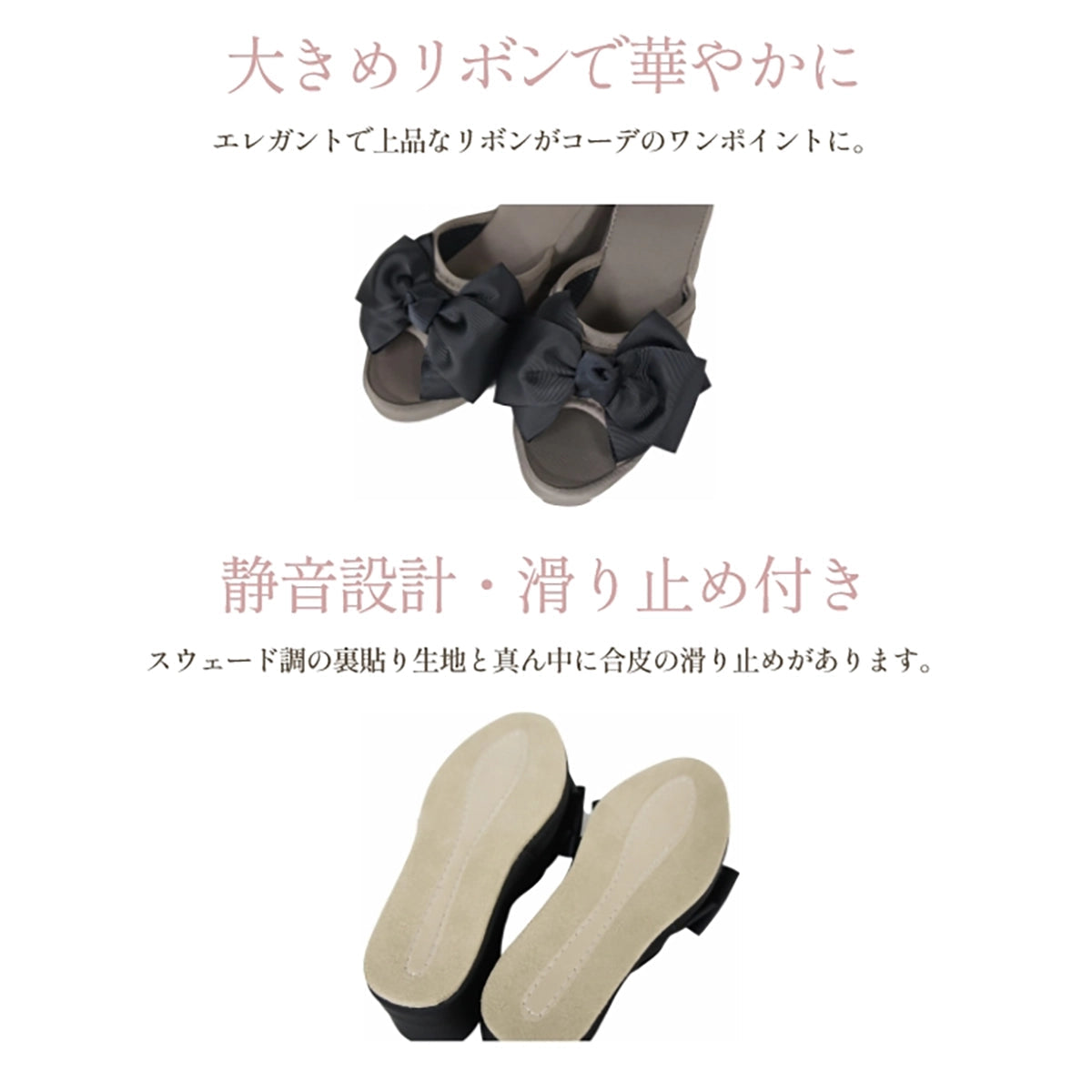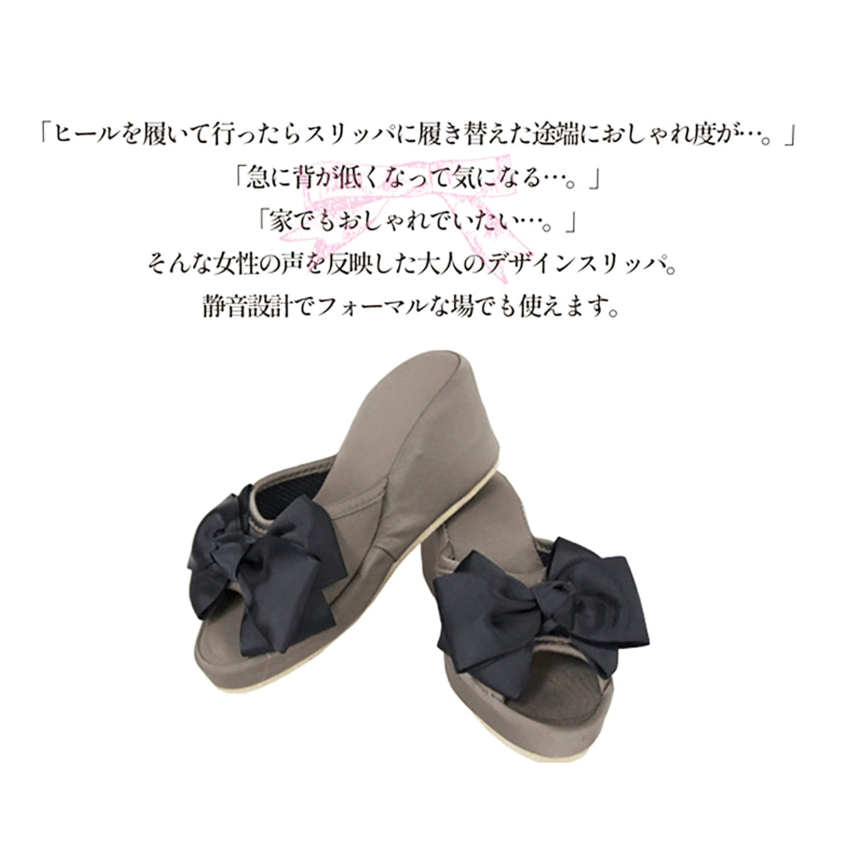 脚長効果絶大な高ヒールのフ厚底フォーマルスリッパです。大きなリボンと高いヒールが体型をバランスよく見せてくれる美脚効果大の優秀スリッパです。お家履きはもちろん、入学式や卒業式、参観日など、エレガントな装いのコーディネートにもファッションのイメージをくずさず履いて頂けます。またサロンやエステなど、上質な空間でのスタッフ用のスリッパとしても最適です。