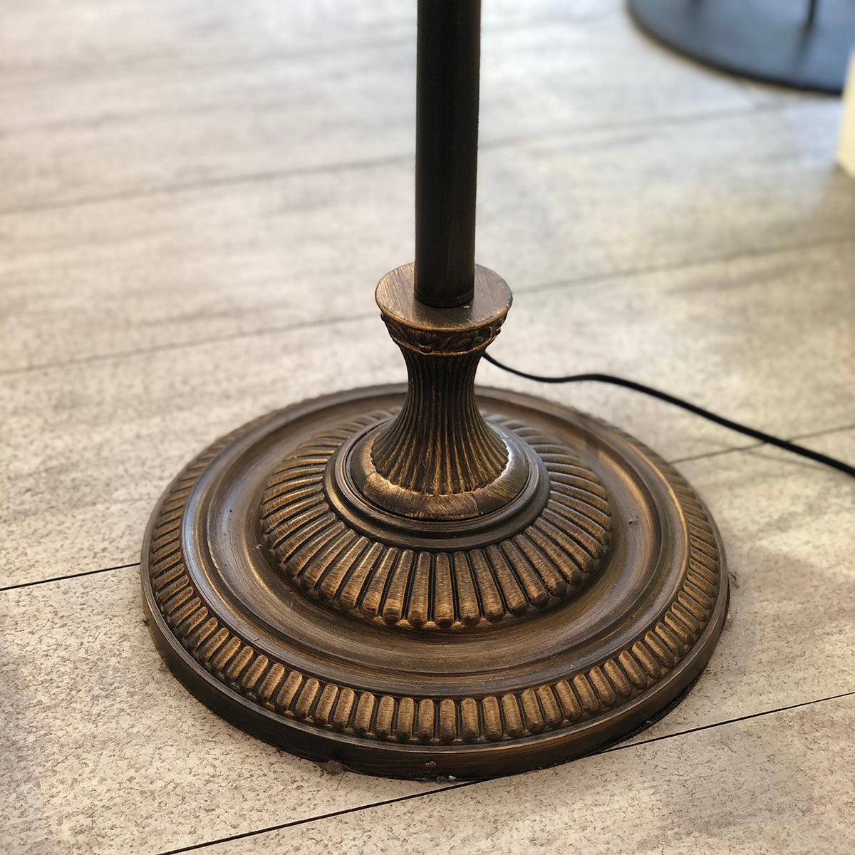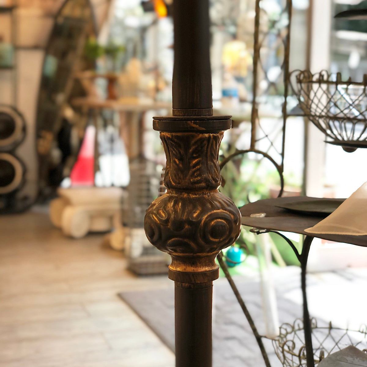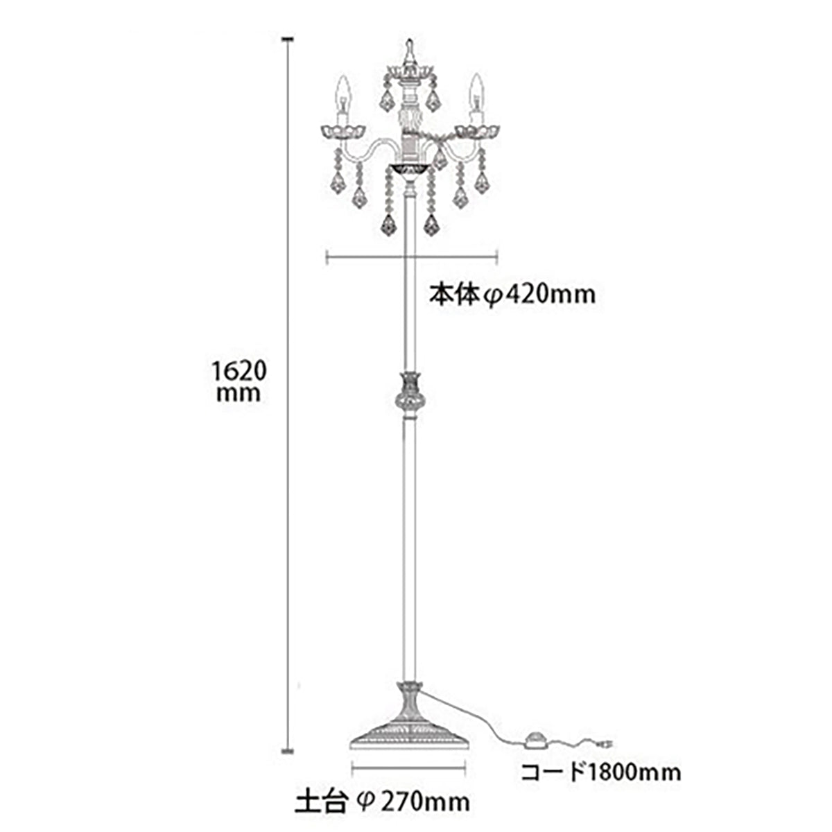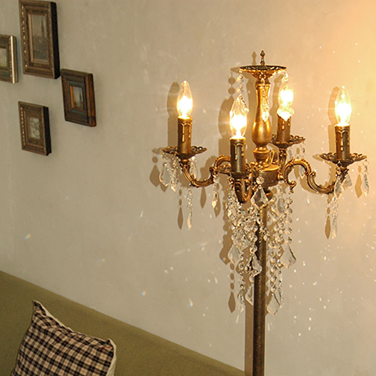 フロアランプ型のシャンデリアのアンティーク色です。置き式(フロアランプ型)のシャンデリアは、照明の中でもラグジュアリーで非日常的な雰囲気をお楽しみいただけるおすすめのアイテムです。置くだけで手軽にインテリアをプチゴージャスに格上げしてくれます。