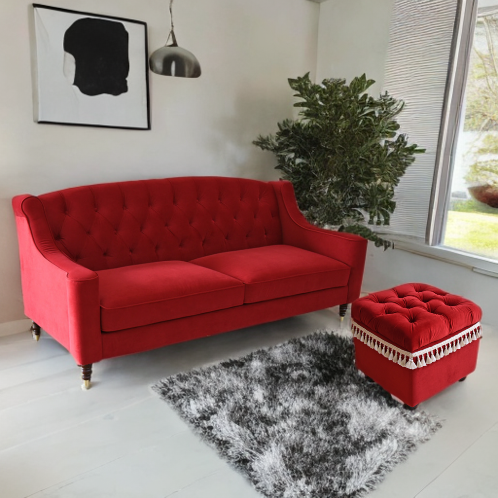ビンテージのある赤いベルベッドが印象的な、クラシックテイストのスツール。コロンとしたフォルムに、ボタン留めを施した贅沢なベルベッドスツールです。
