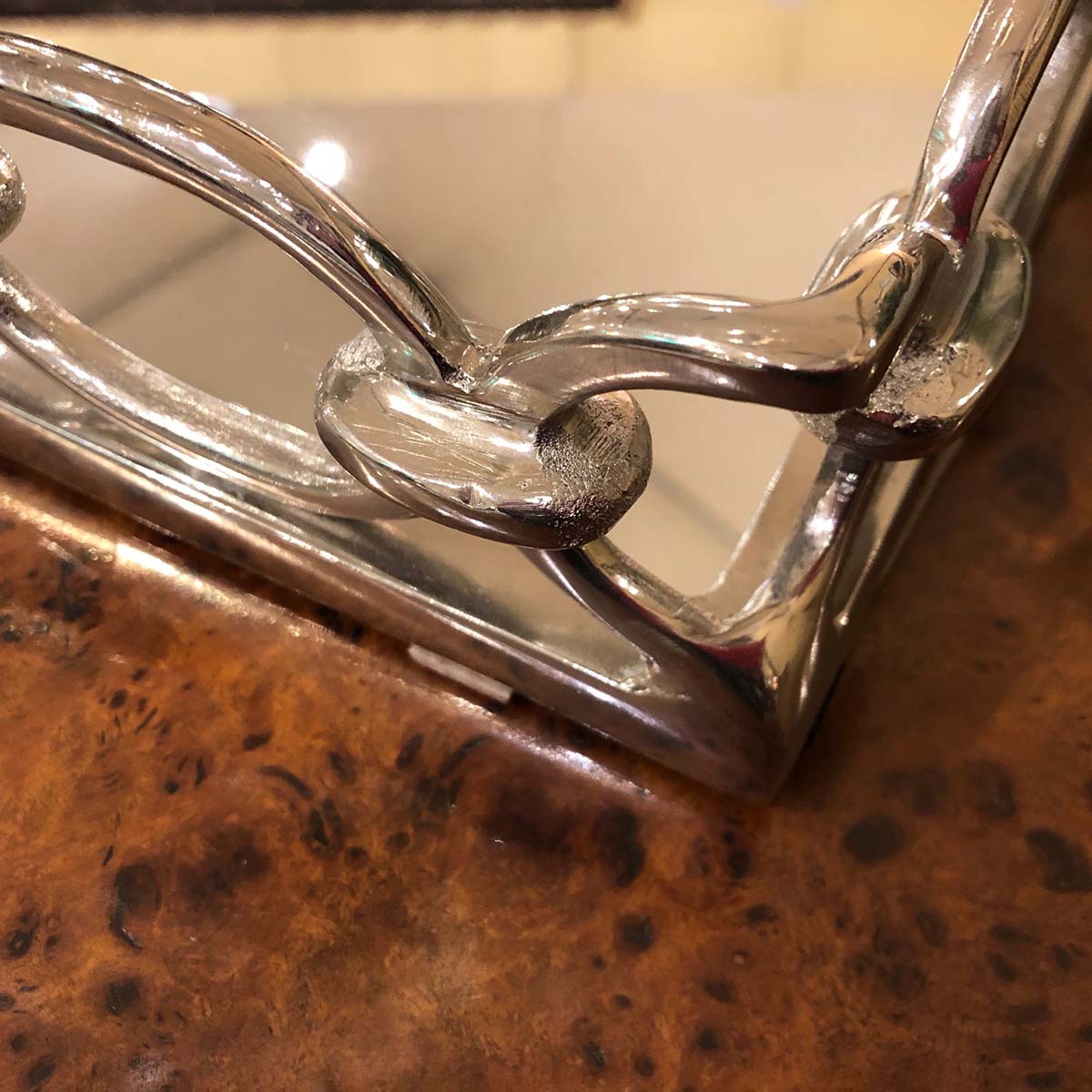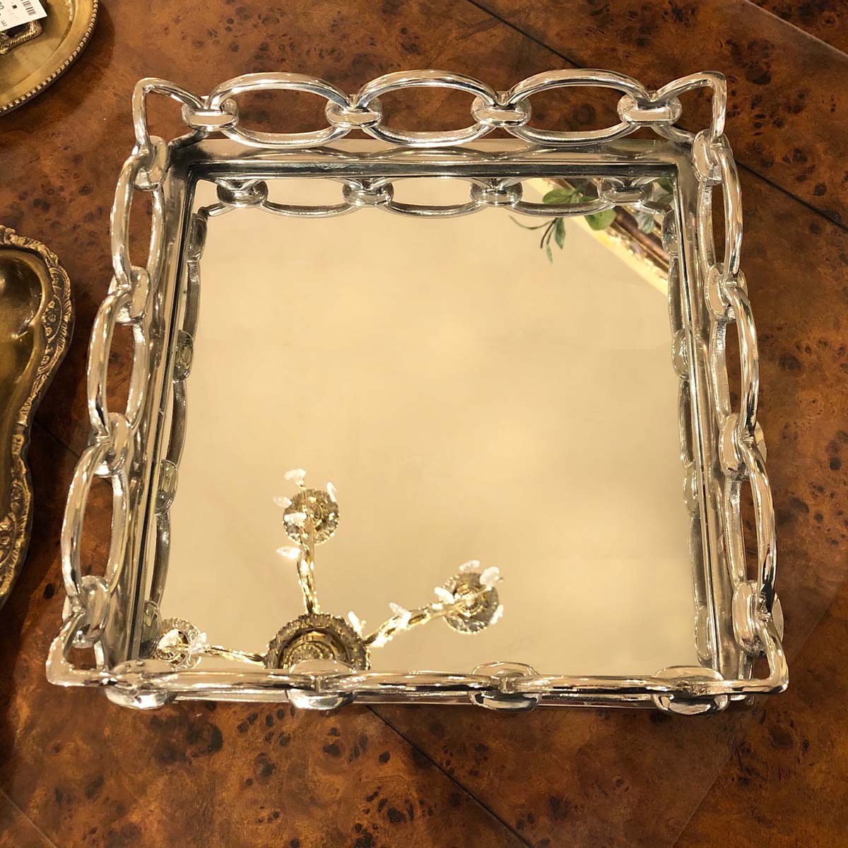 おもてなしシーンで活躍し、テーブルコーディネートに最適なミラートレー。シルバーとミラーのクールでかっこいい組み合わせが、ダイニングのアクセントとしてキマります。モダンインテリアにもピッタリ。小物やアクセサリーのディスプレイトレーとしてもおしゃれな魅せ方ができます。ホテルライクなインテリアにもモダンインテリアにも、トレイのコーディネートはおススメです。
