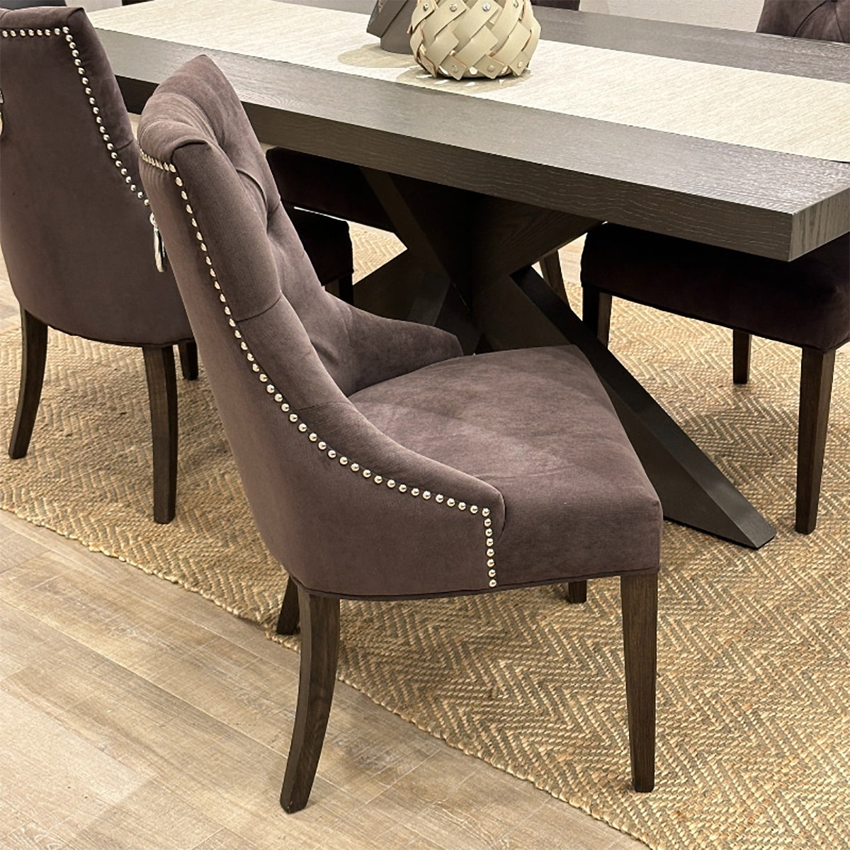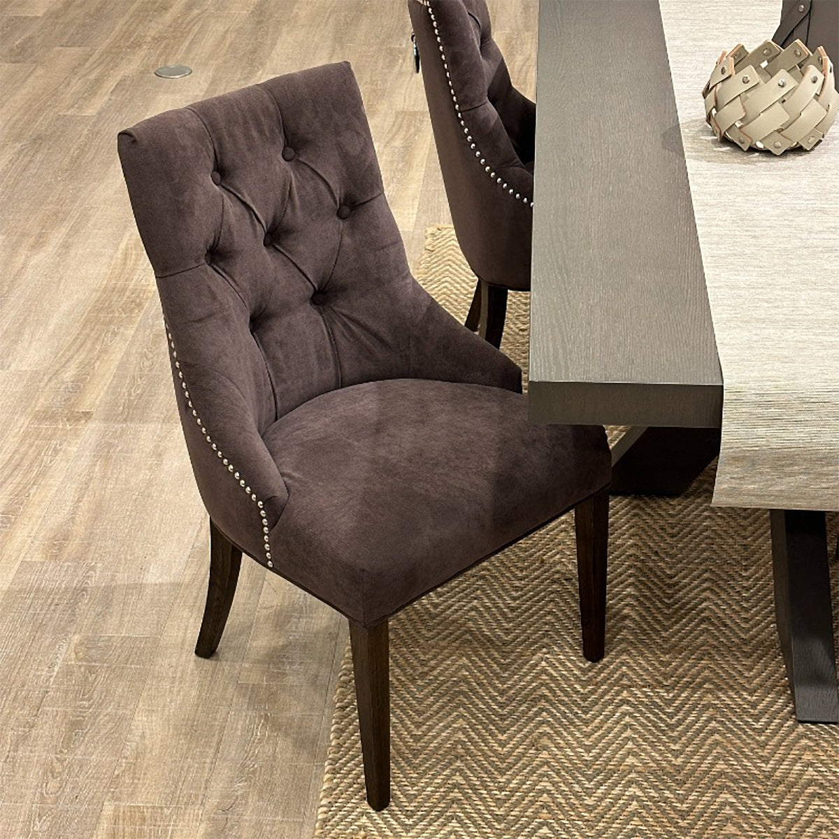 柔らかな光沢を纏ったベルベット調ファブリックがラグジュアリーに映えるダイニングチェアです。