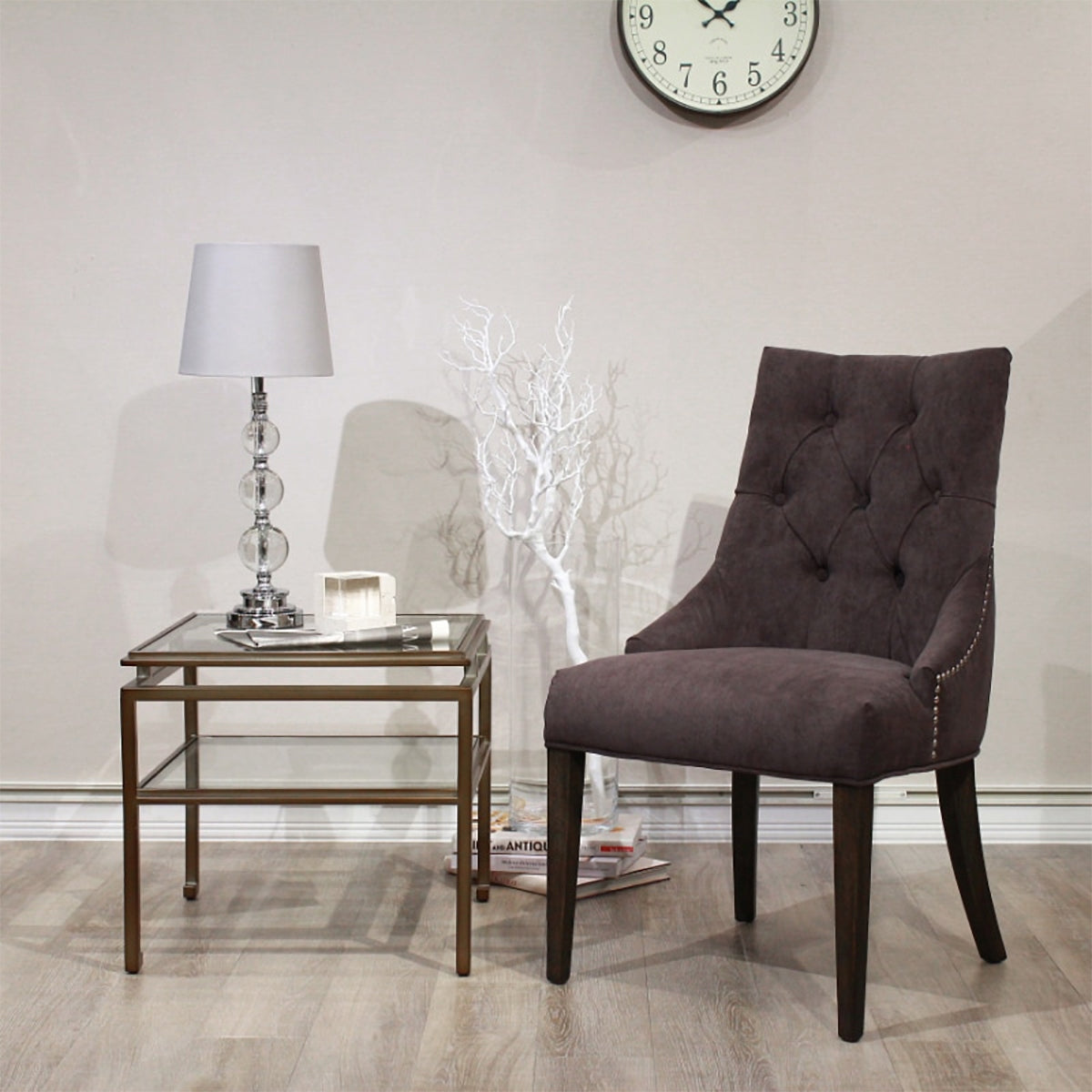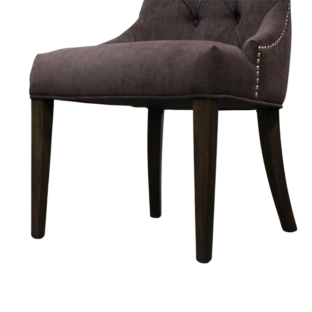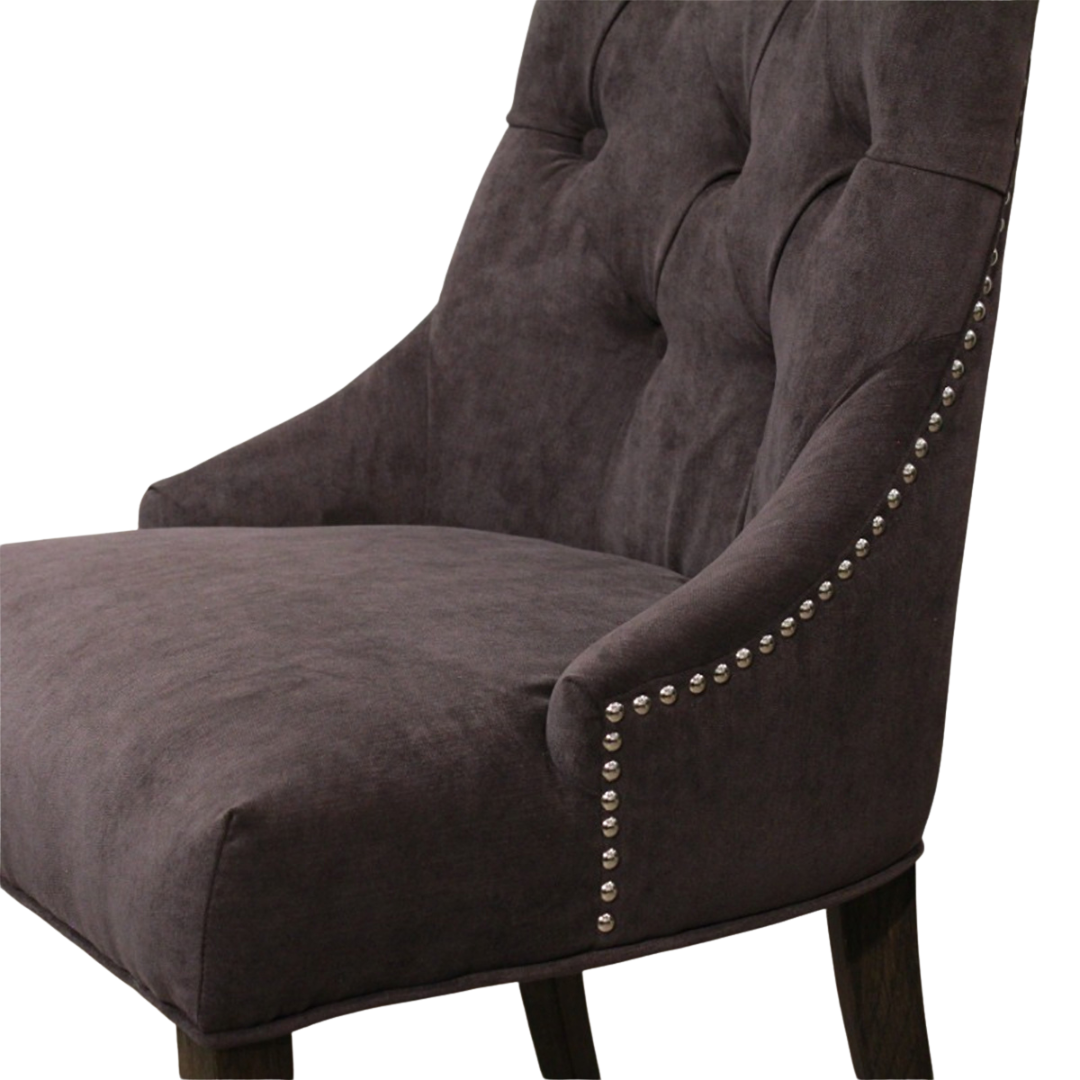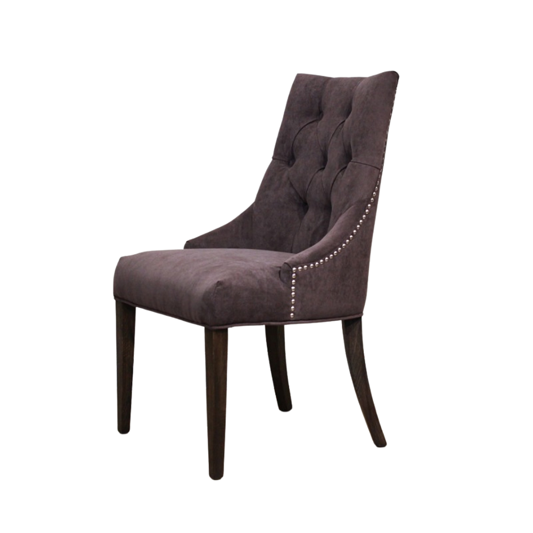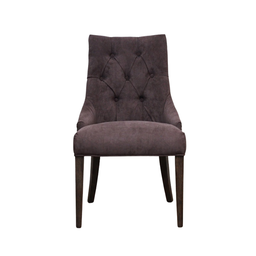 ゆるやかなカーブを描くフォルムと、ボタン留めのクラシカルなデザインが印象的なチェア。