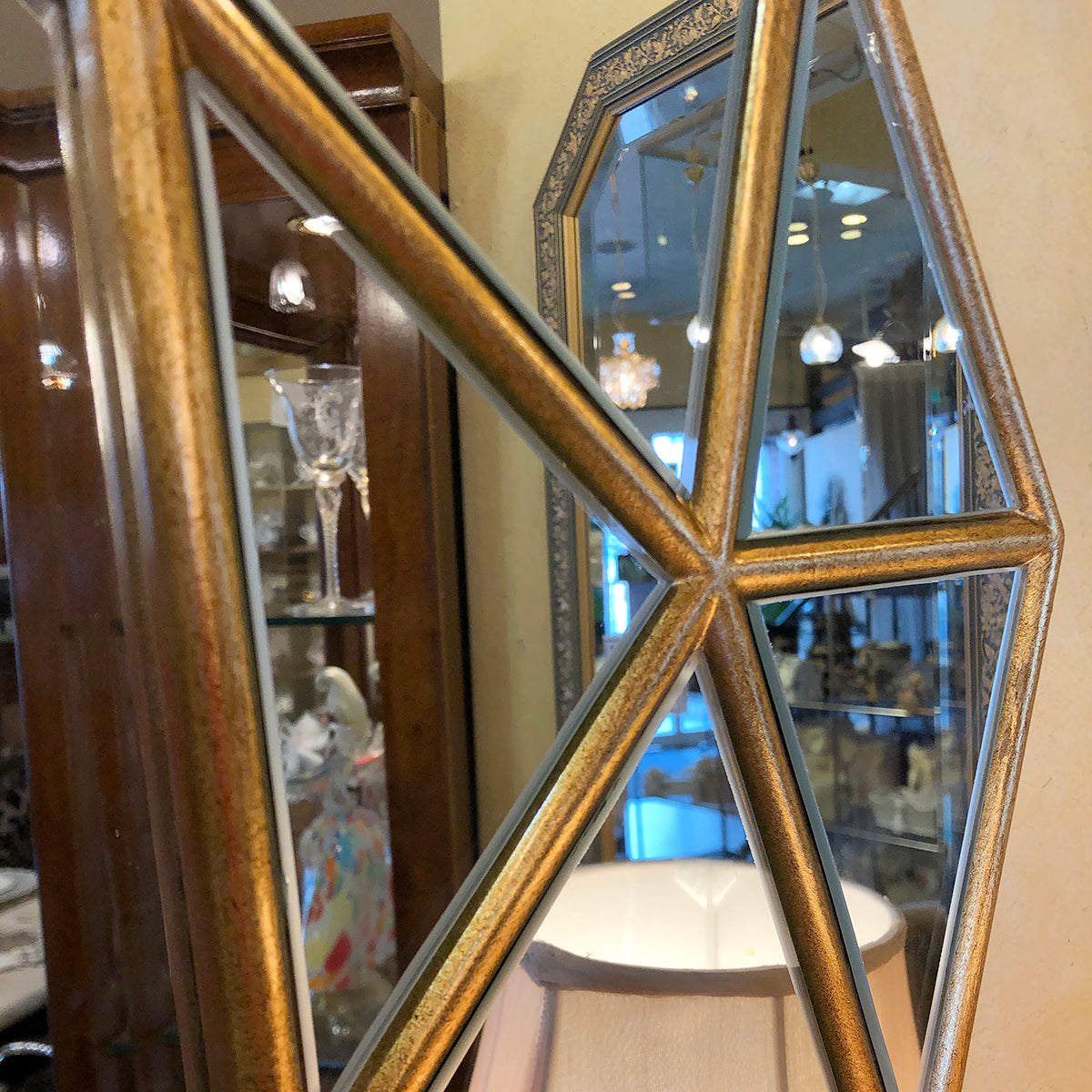 モダンデザインのウォールミラーです。風水でも縁起がよいとされる八角形型のゴールドミラーは、他面型でいくつもの細かなミラーピースから出来上がっている、おしゃれでインパクトのあるデザインミラーです。