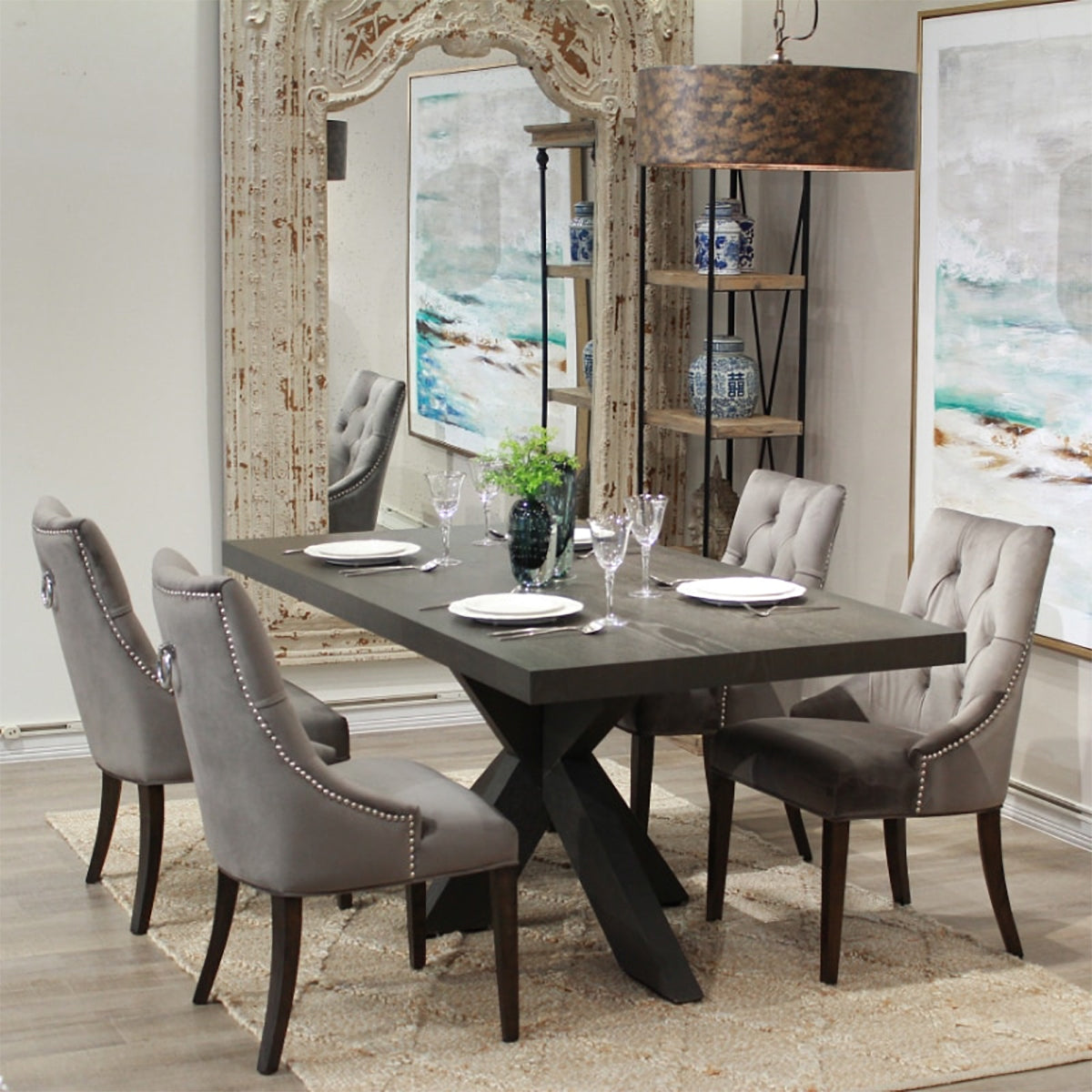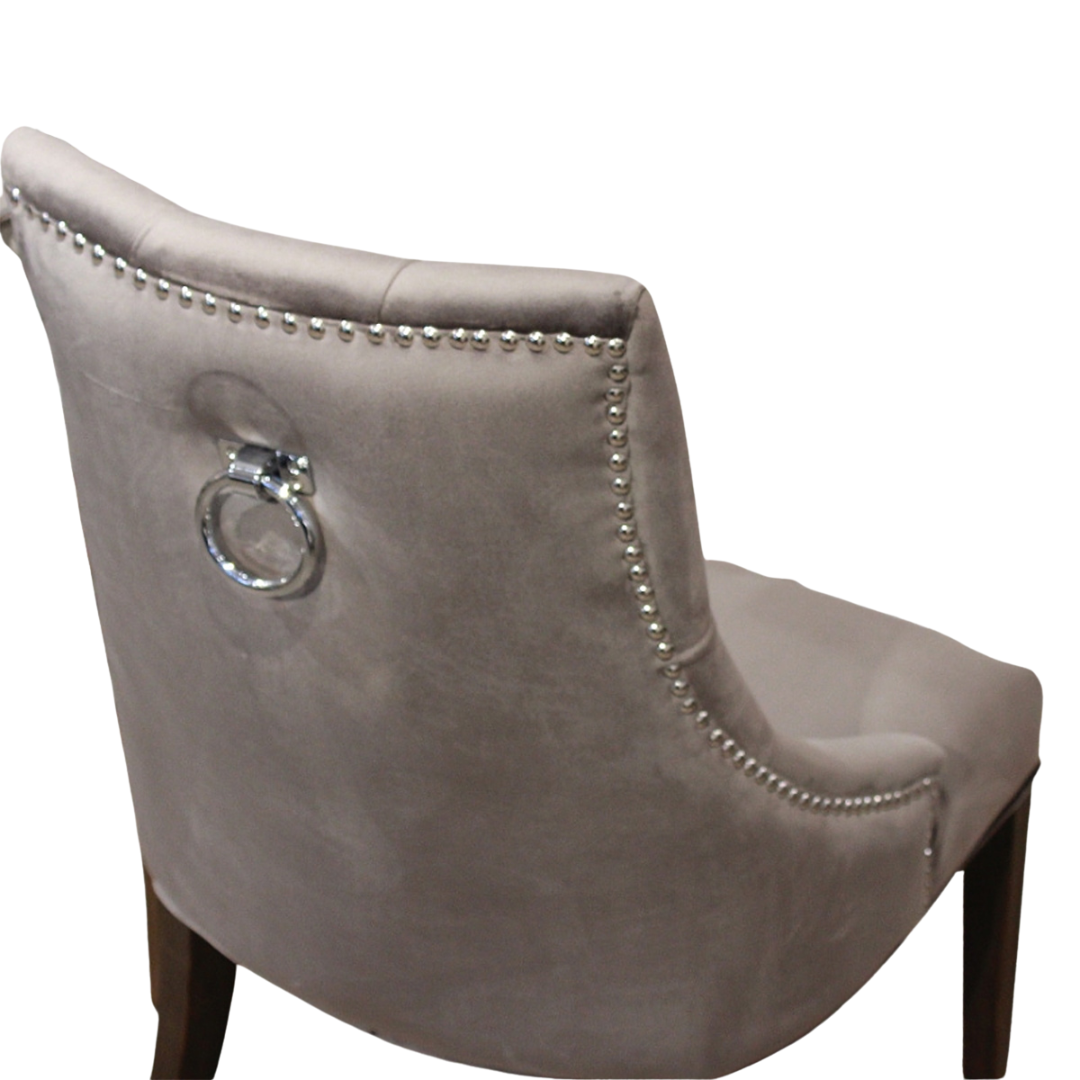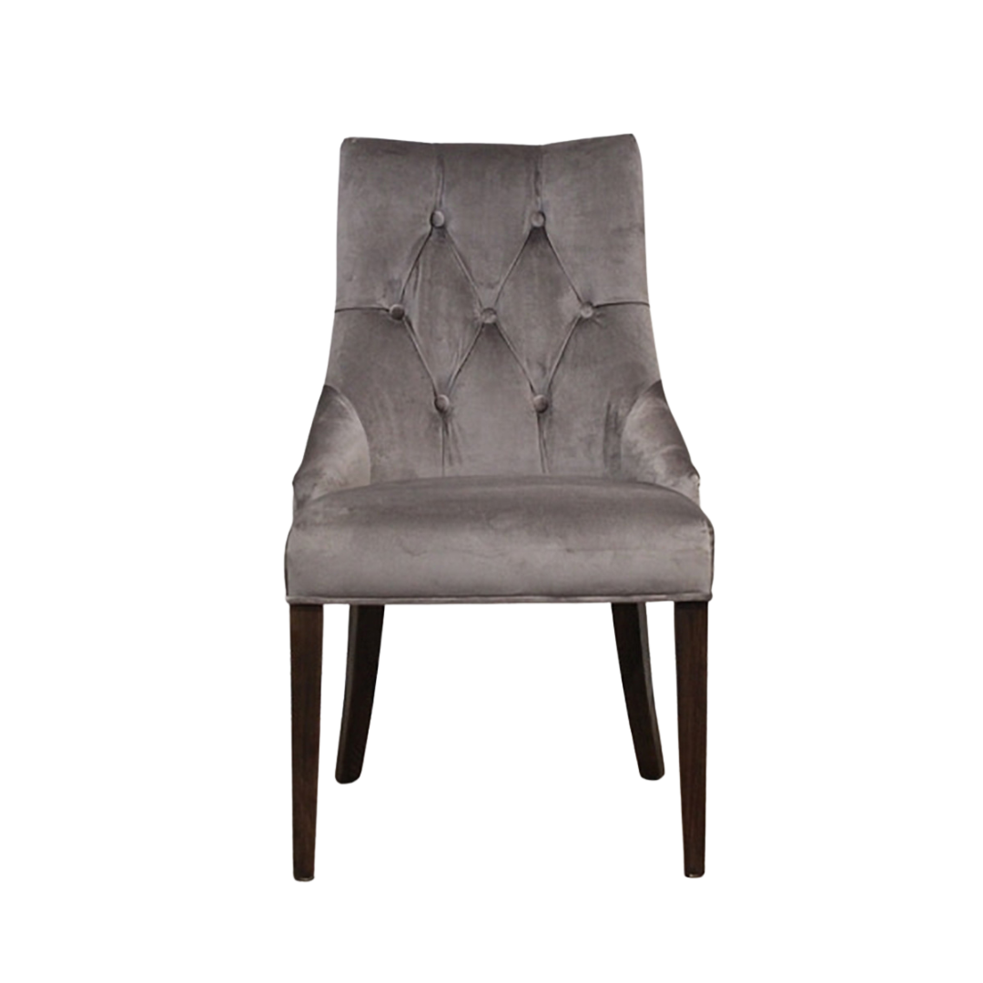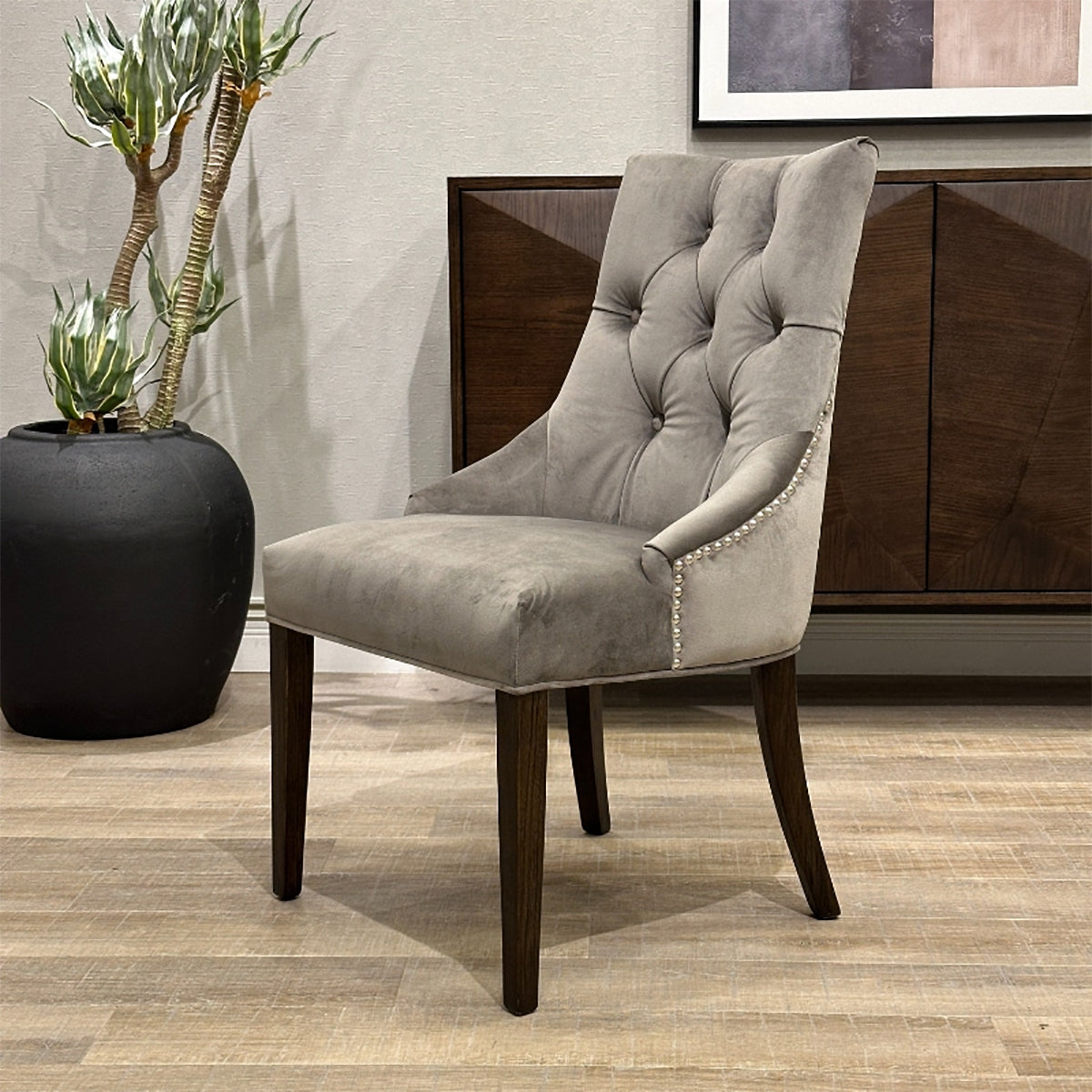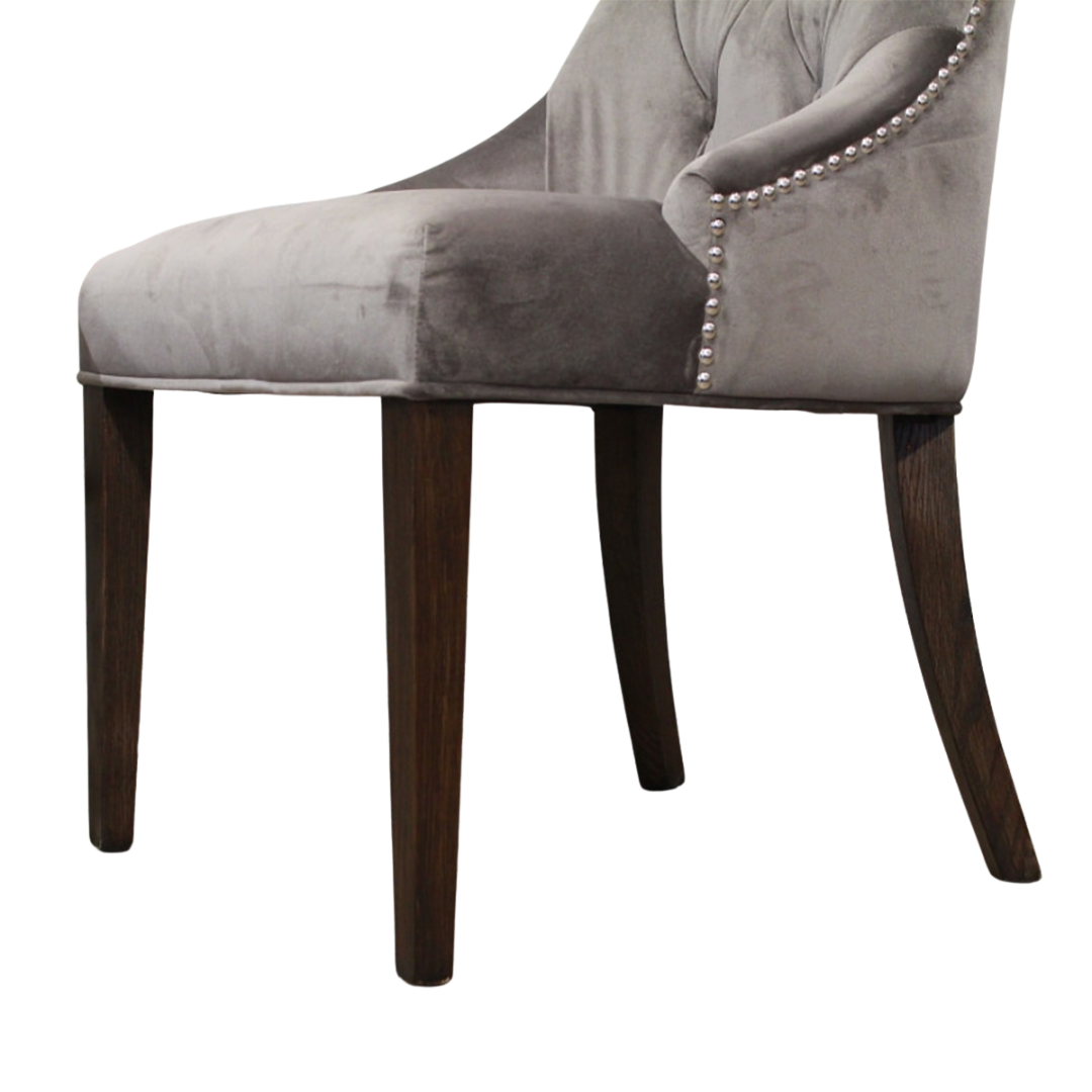 椅子やチェアでおしゃれなリビングを演出したい方へ。上品なベルベットグレーの生地が魅力のモダンクラシックチェアが入荷しました。