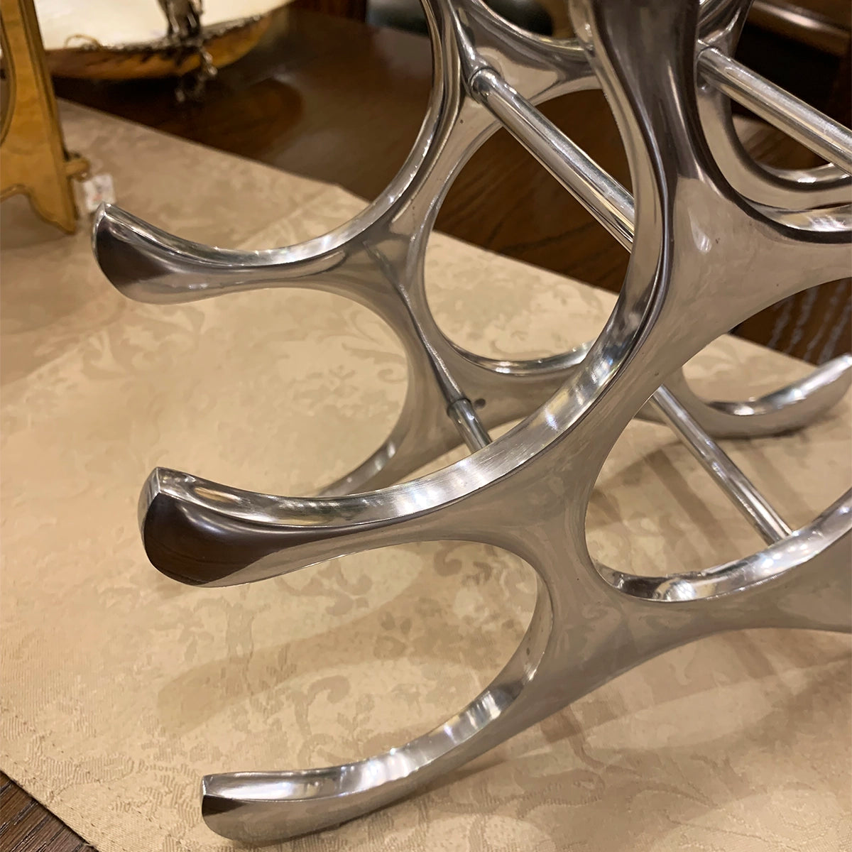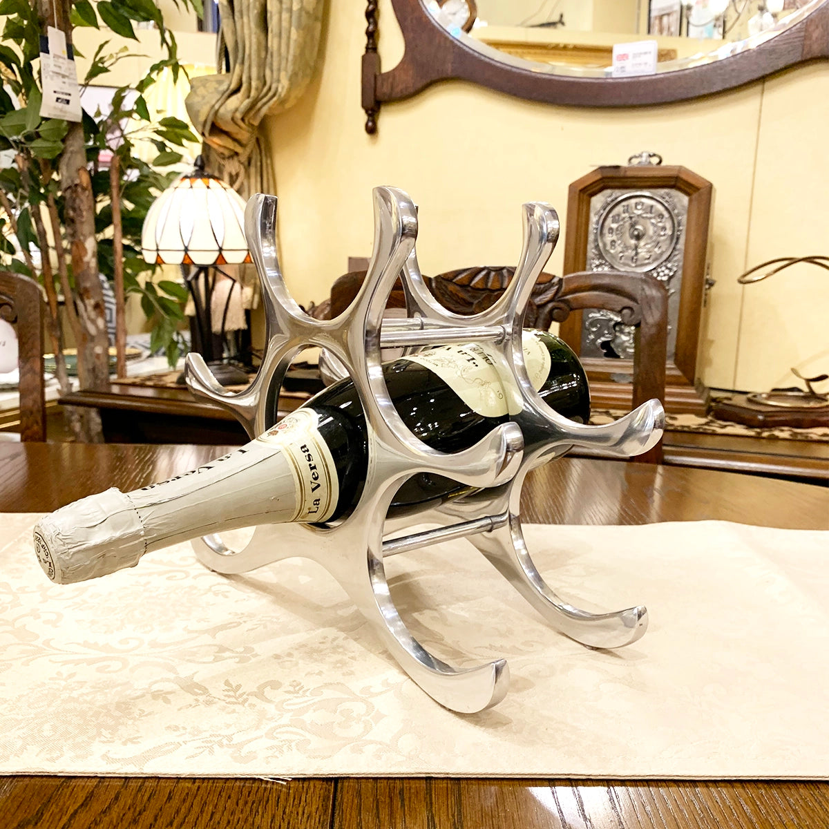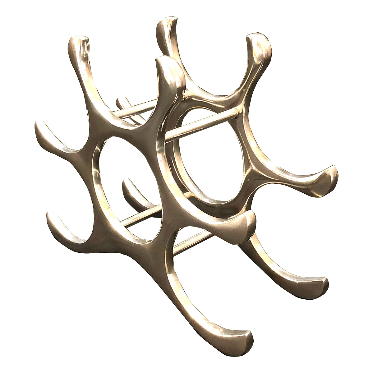 ワインラックの6本用です。ワインをおしゃれにディスプレイしながら収納できるシンプルなワインボトルホルダーです。シルバーメッキの艶やかなフレームは、ほどよいボリューム感がありシンプルながら躍動的なデザインです。真ん中のサークル部分にはワインボトルを挿して収納、周りはカーブがボトルを支える形で合計6本の収納が出来ます。