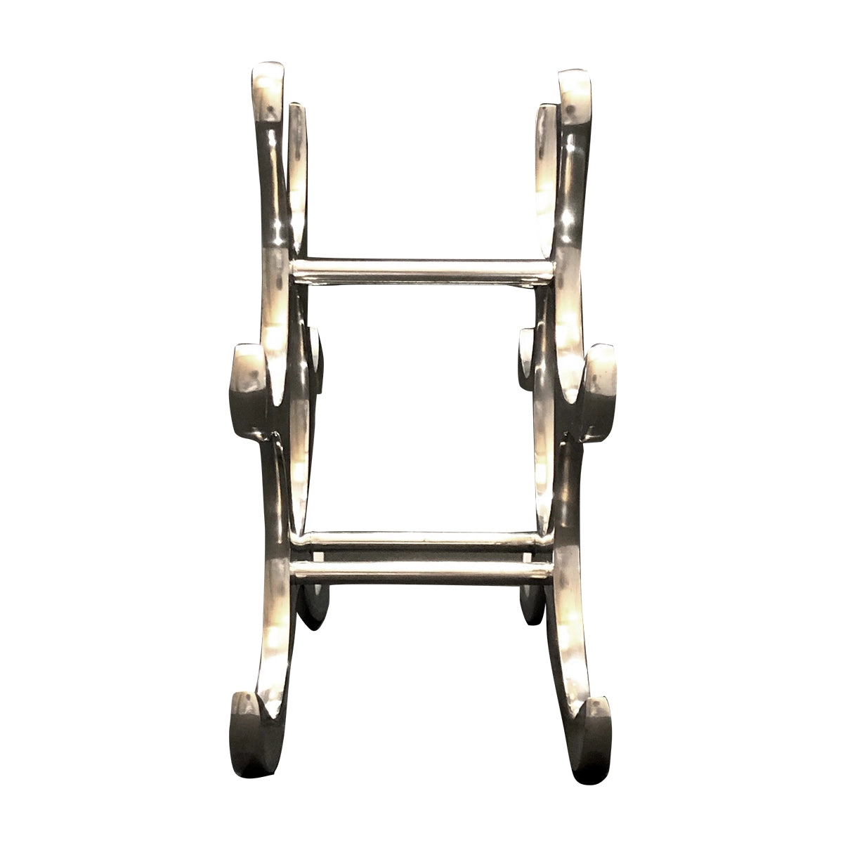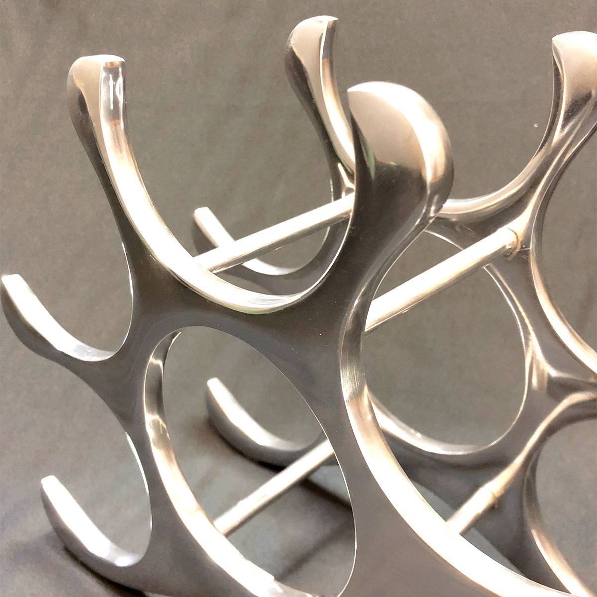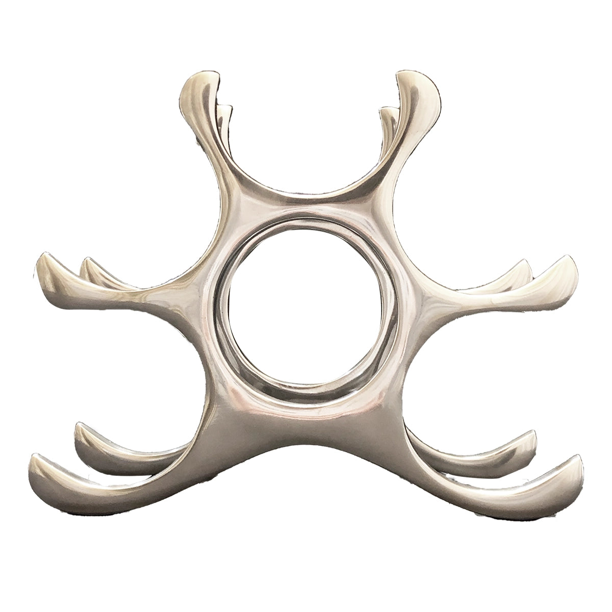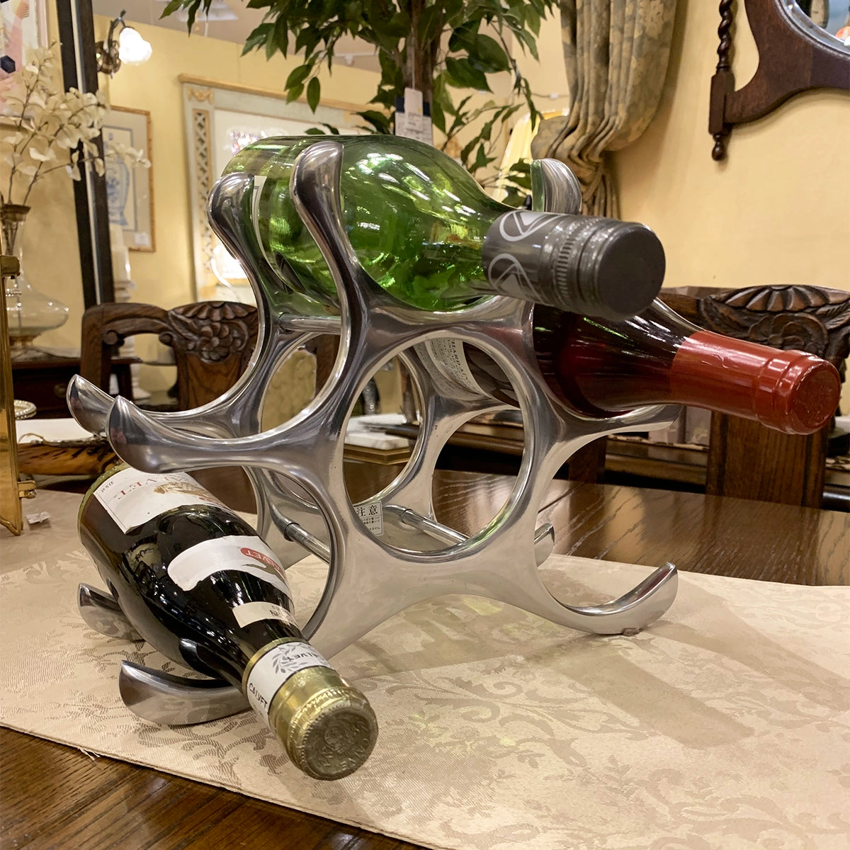 ワインラックの6本用です。ワインをおしゃれにディスプレイしながら収納できるシンプルなワインボトルホルダーです。シルバーメッキの艶やかなフレームは、ほどよいボリューム感がありシンプルながら躍動的なデザインです。真ん中のサークル部分にはワインボトルを挿して収納、周りはカーブがボトルを支える形で合計6本の収納が出来ます。