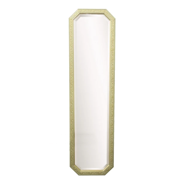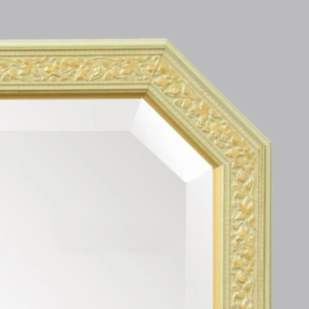 八角形の姿見 ミラー(ウォールミラー)です。風水で縁起が良いとされ人気の八角形型のウォールミラーはイタリア製で、優しいアイボリーカラーのフレームに繊細なゴールドのリーフ柄がイタリアらしい品格のある仕上がりになっています。細かい装飾はさすがといった感じです。面取り加工も施されており、高級感を高めてくれます。
