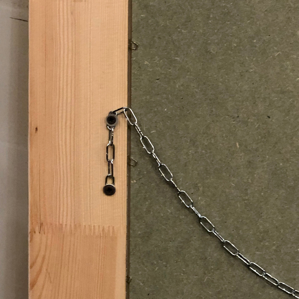 背面には縦横どちらでも吊れるよう、チェーンがついています。縦吊りは幅広の姿見として、横吊りはソファやサイドボードなどの背面の装飾としておすすめです。