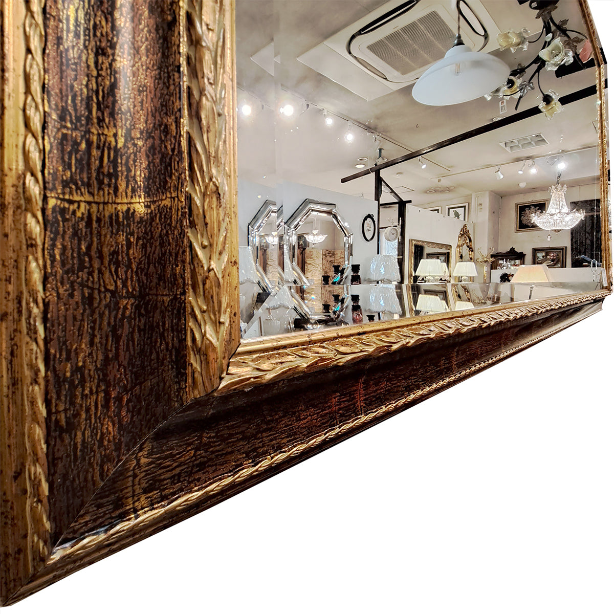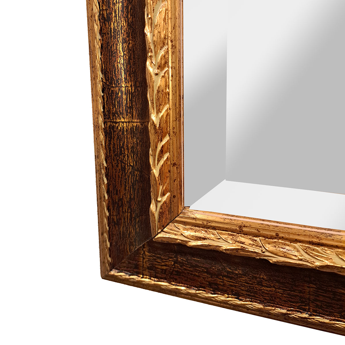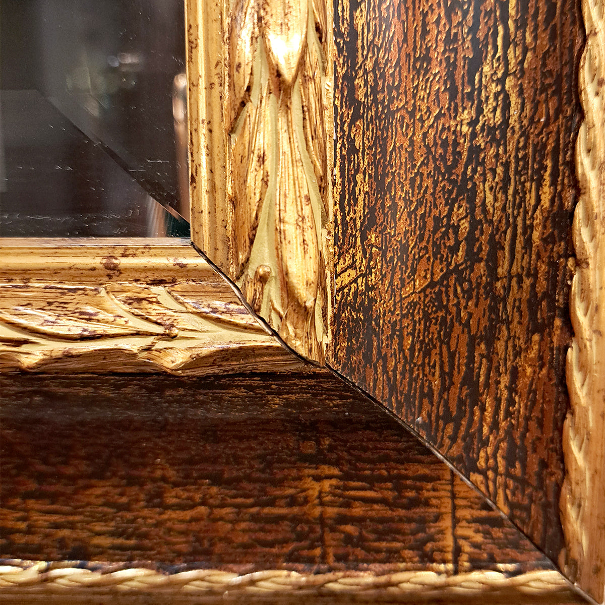 フレームの木製部分には美しいゴールドのクラック模様が入っており、ミラー面には高級感を惹きたてる面取り加工が施された上品な仕上がりになっています。