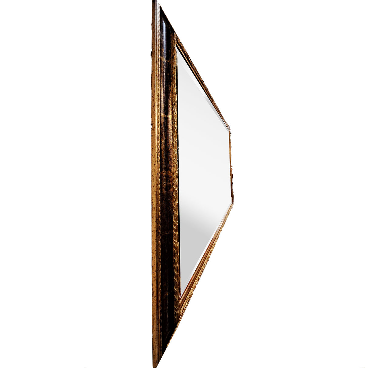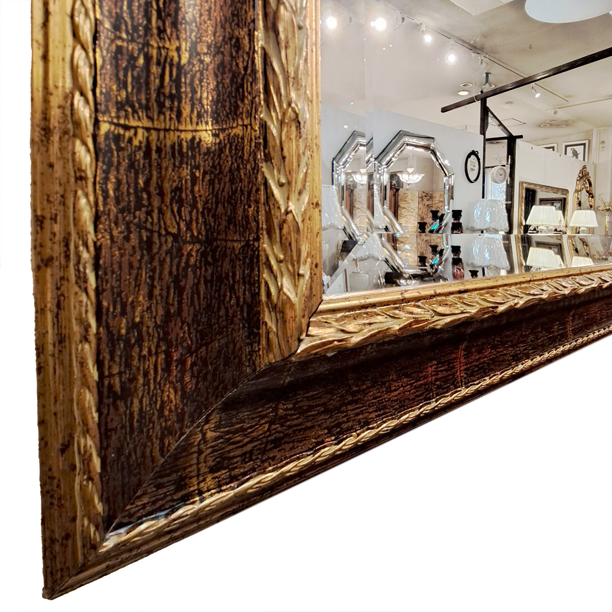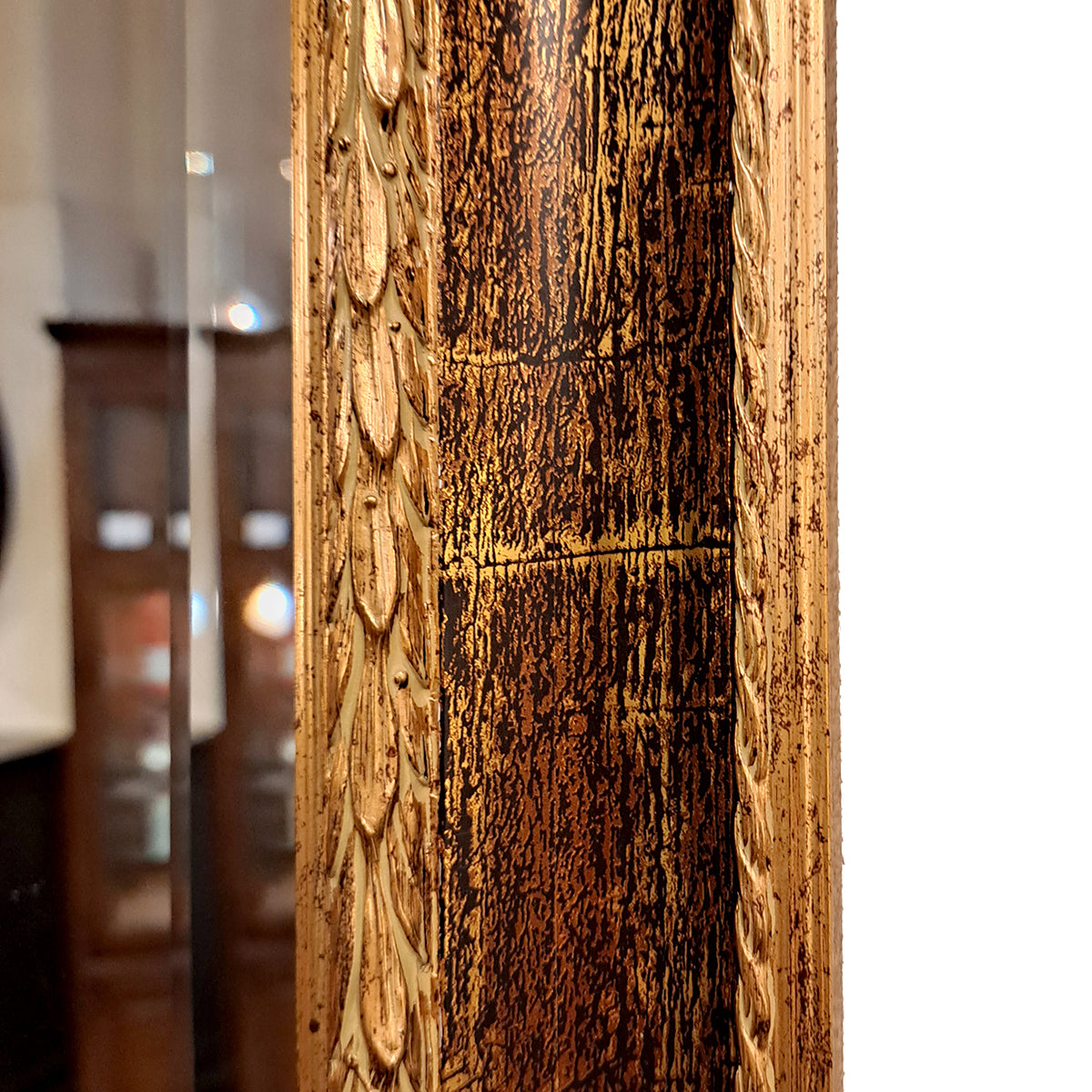 フレームの木製部分には美しいゴールドのクラック模様が入っており、ミラー面には高級感を惹きたてる面取り加工が施された上品な仕上がりになっています。