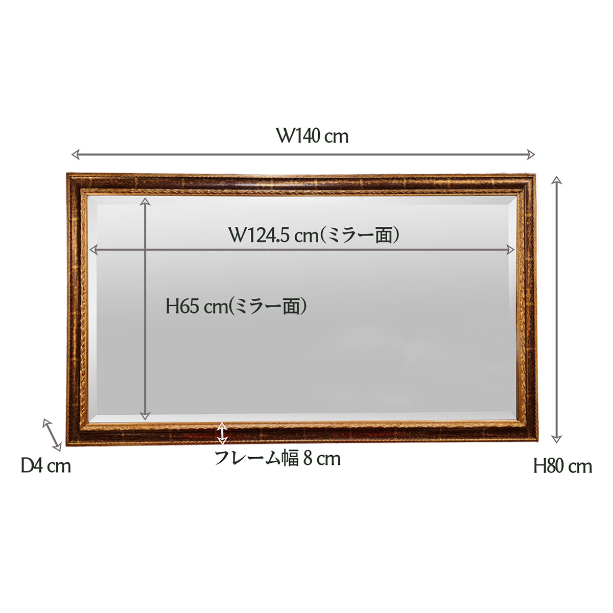 幅140㎝の豪華なクラシックミラーは大型サイズで高級感のある空間演出にたいへんおすすめです。サイドボードなどの箱物家具の上やソファーの背面、また縦吊りで玄関などの姿見として掛けられてもおしゃれです。