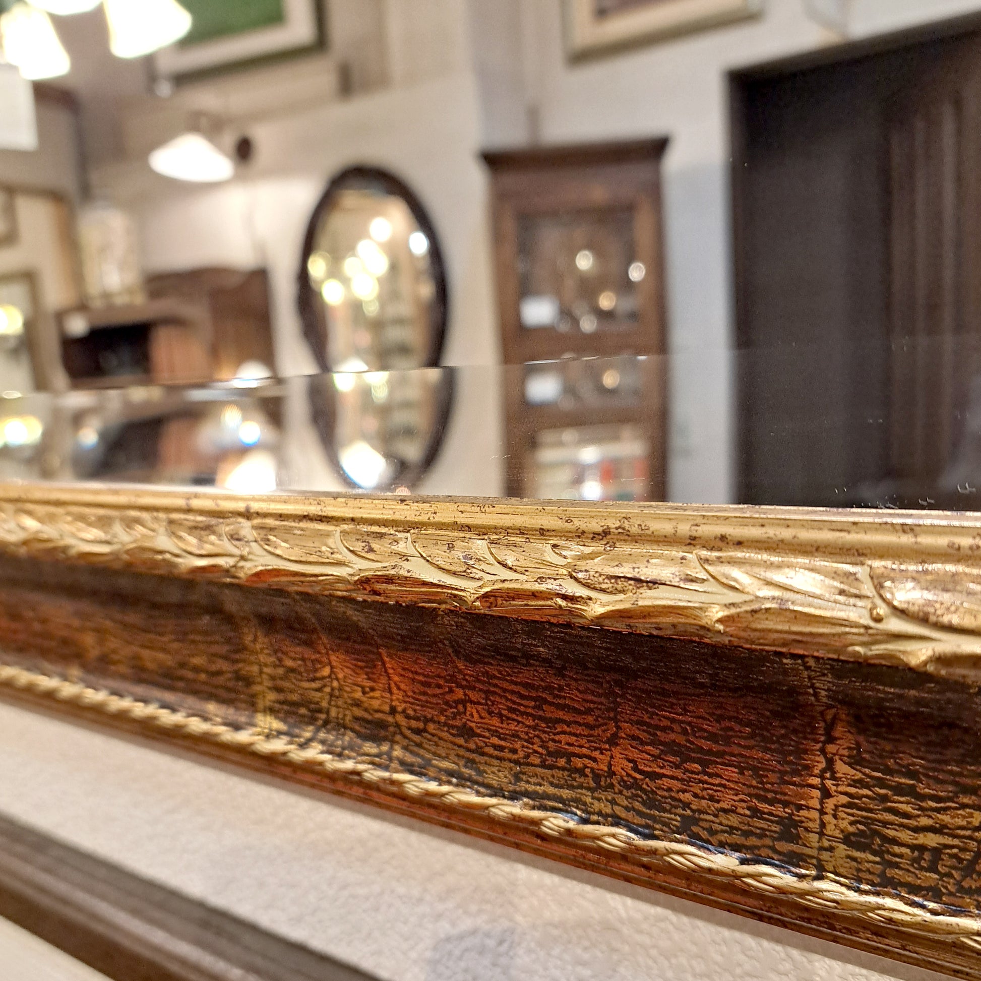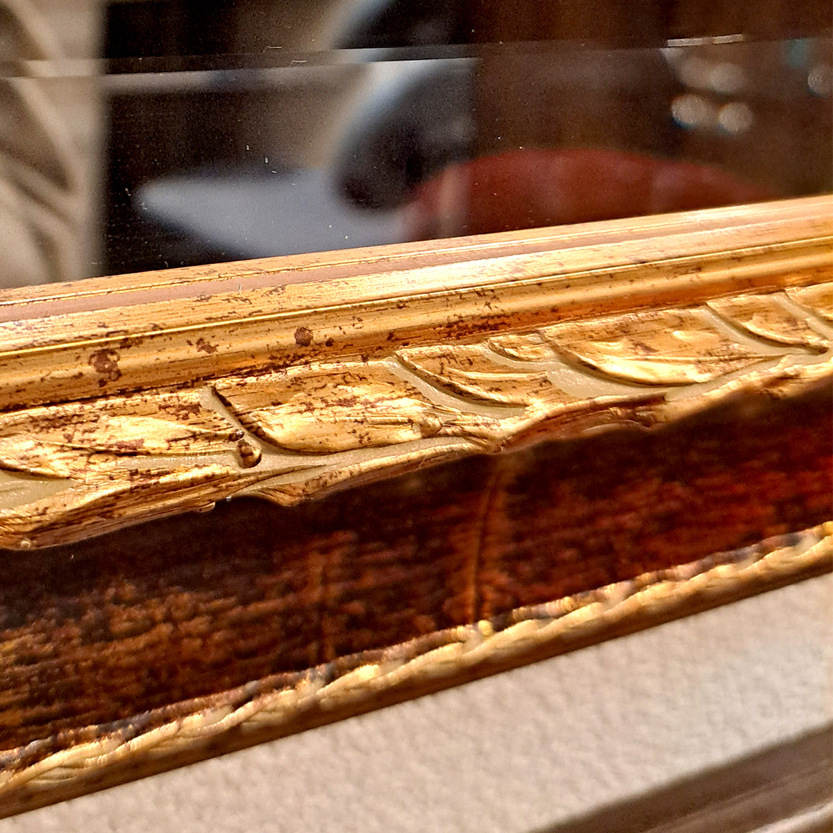 ゴールドのクラック模様が際立つアンティークな仕上がり。フレームは貴重な木製です。落ち着いたブラウンにゴールドのクラック模様が美しく入っています。使い続けているうちにゴールドの塗装が剥げて素敵な風合いになったよう。
