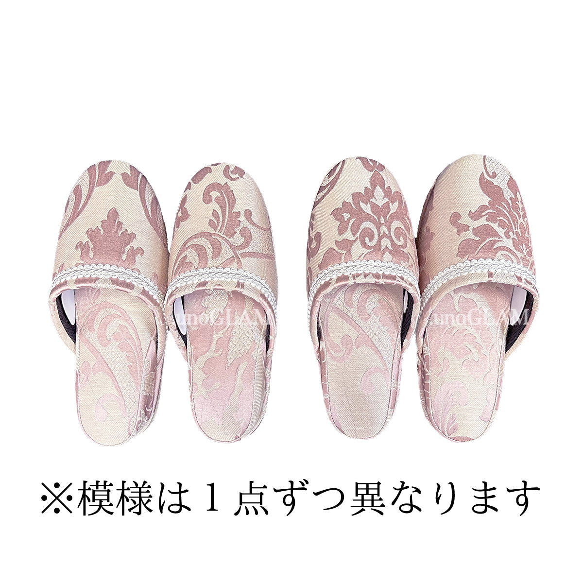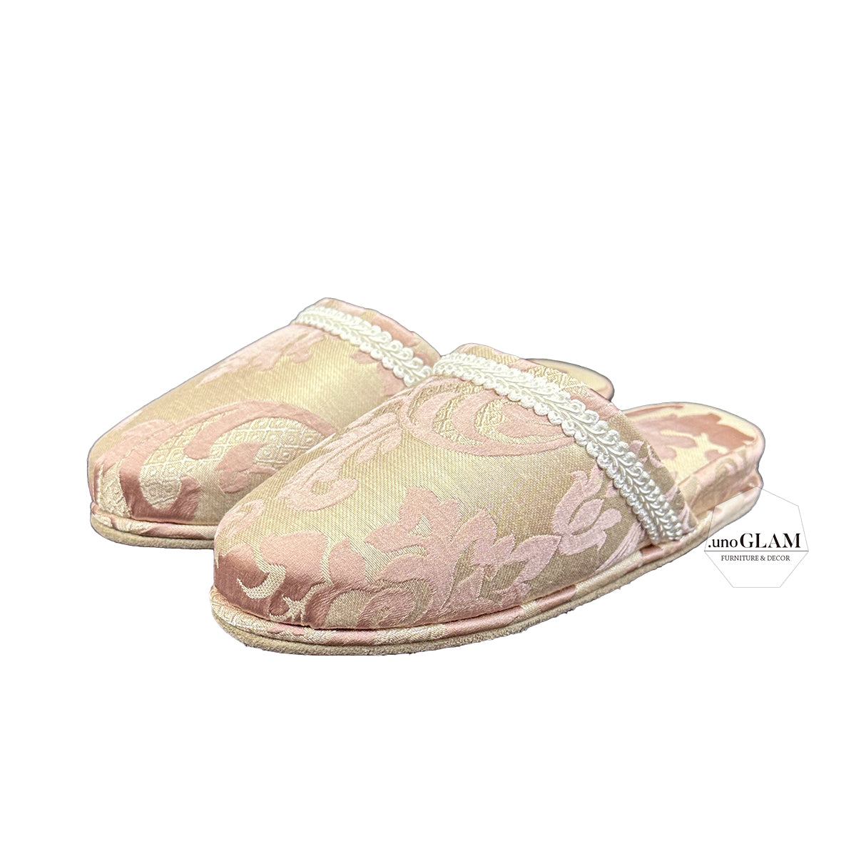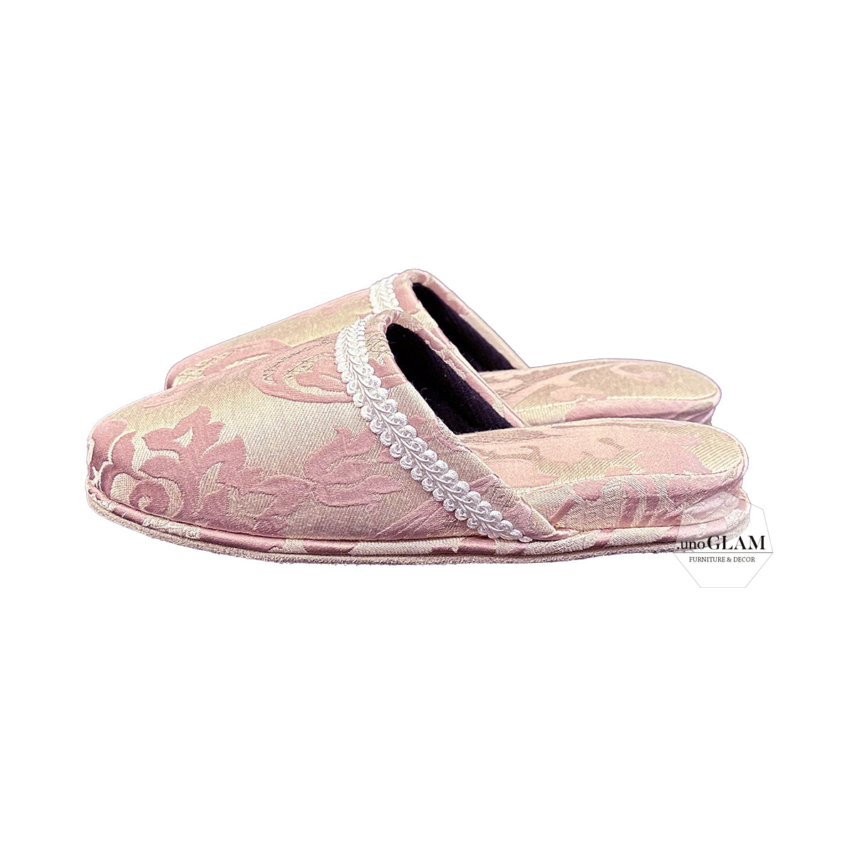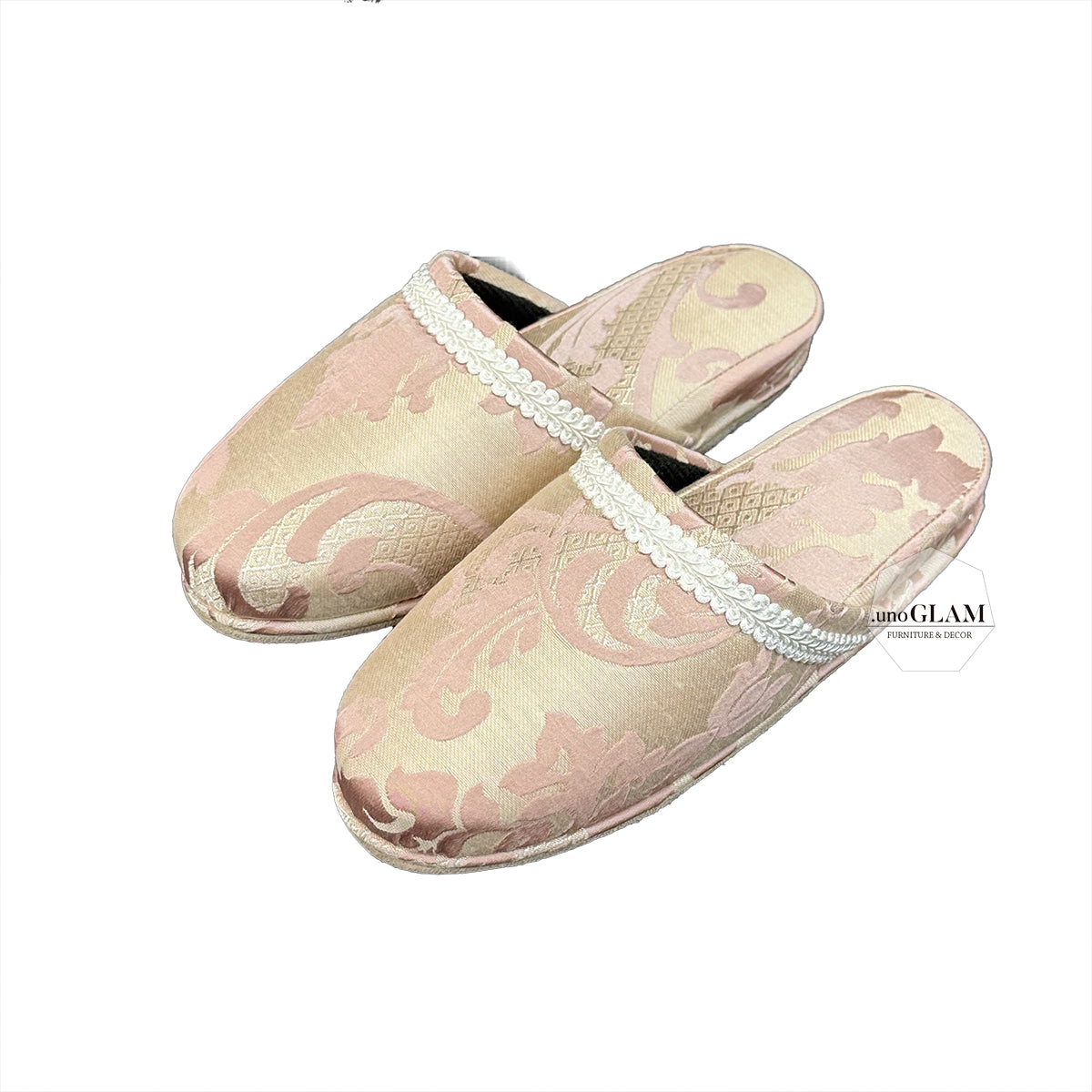 ベースはベビーピンクのアラベスク柄が全体にあしらわれた品格のあるスリッパです。さらにアクセントとしてスリッパの縁にブレードが施され、上品さを醸し出しています。
