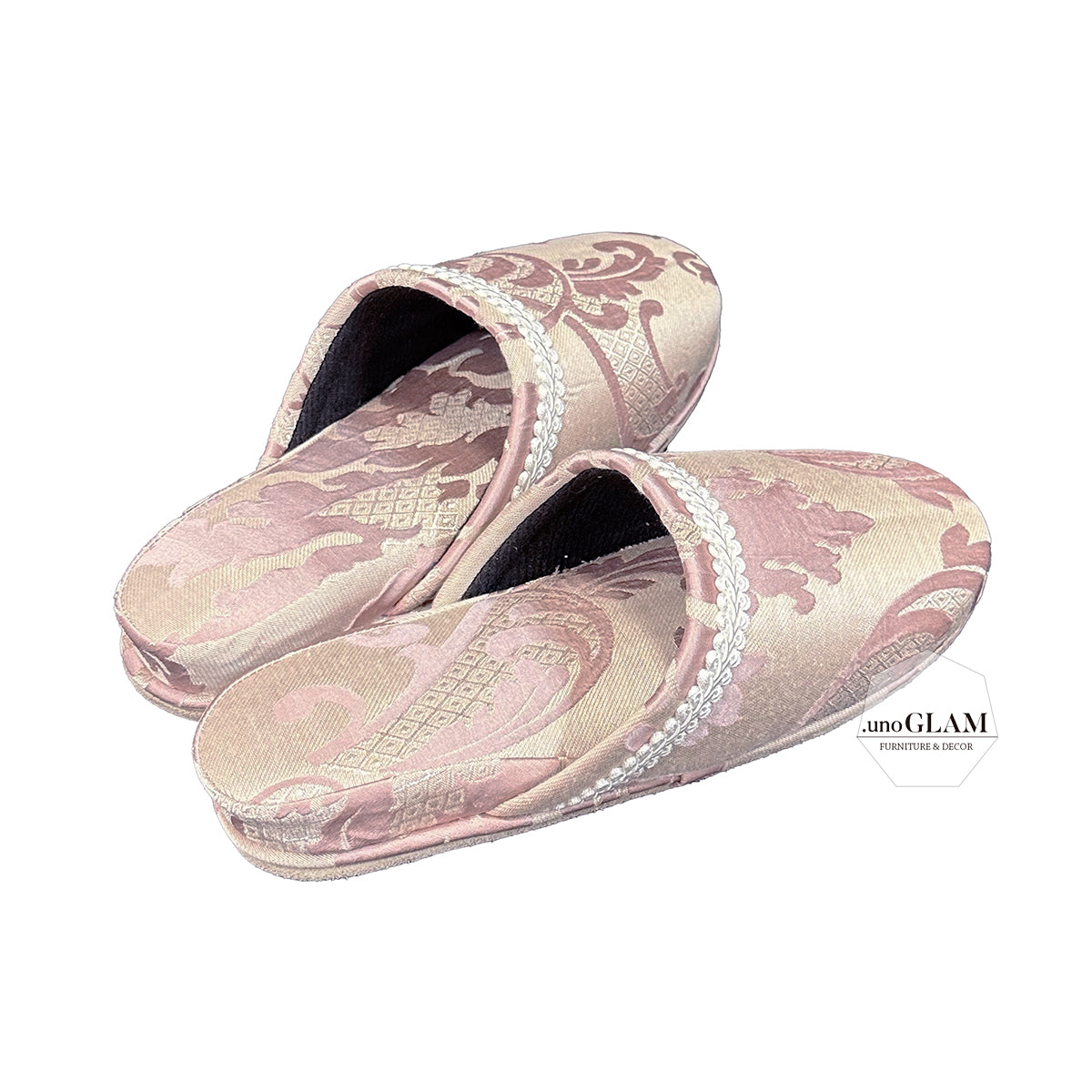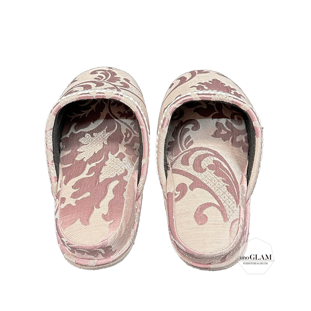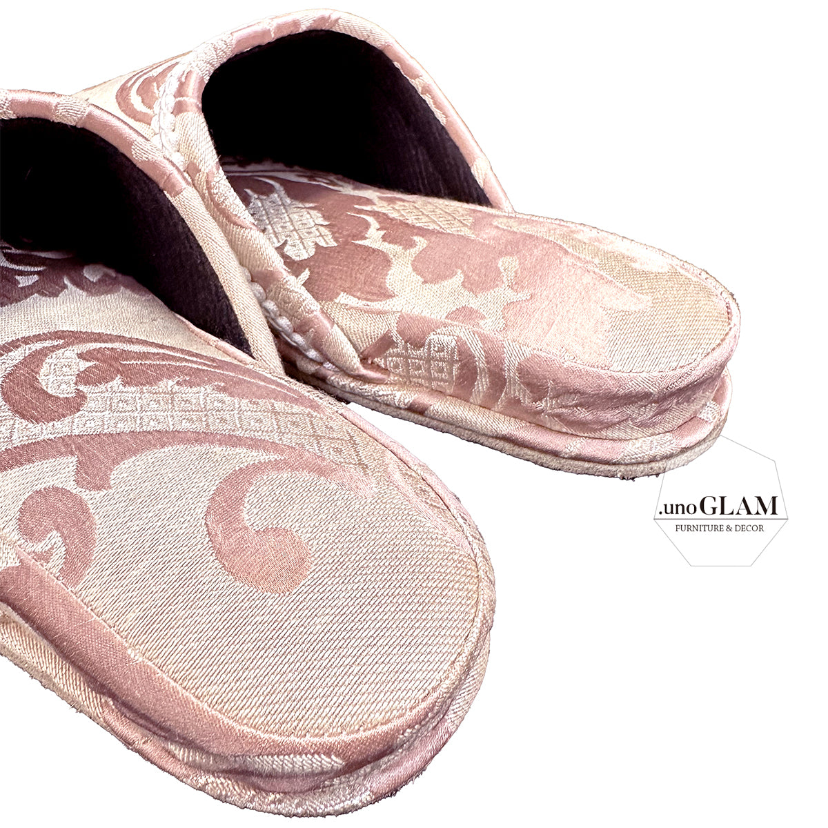 ベースはベビーピンクのアラベスク柄が全体にあしらわれた品格のあるスリッパです。さらにアクセントとしてスリッパの縁にブレードが施され、上品さを醸し出しています。