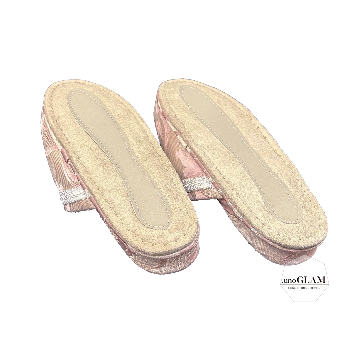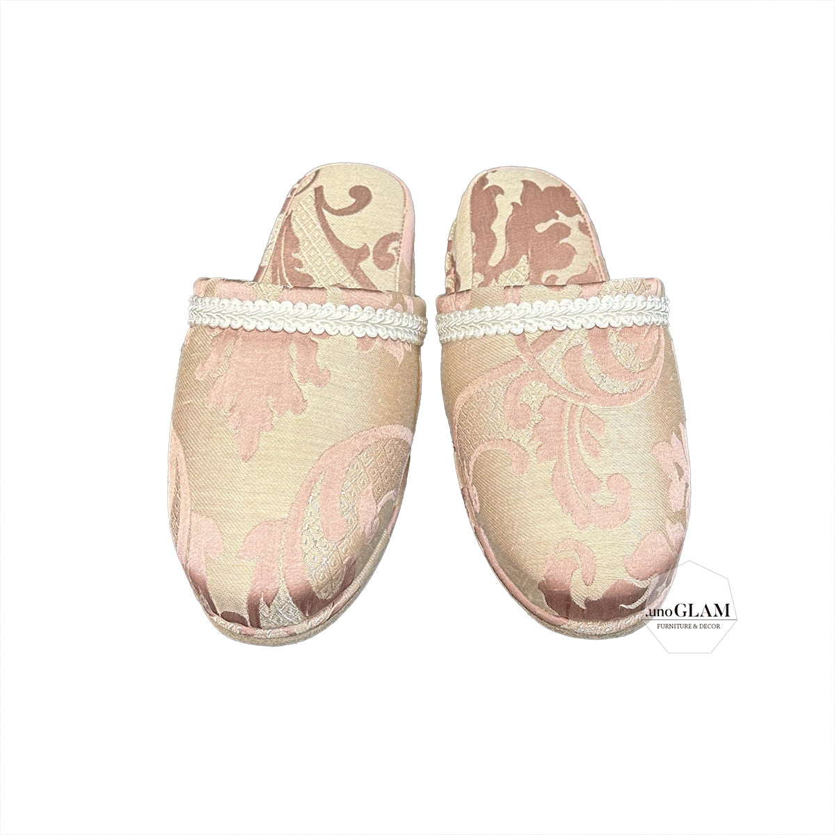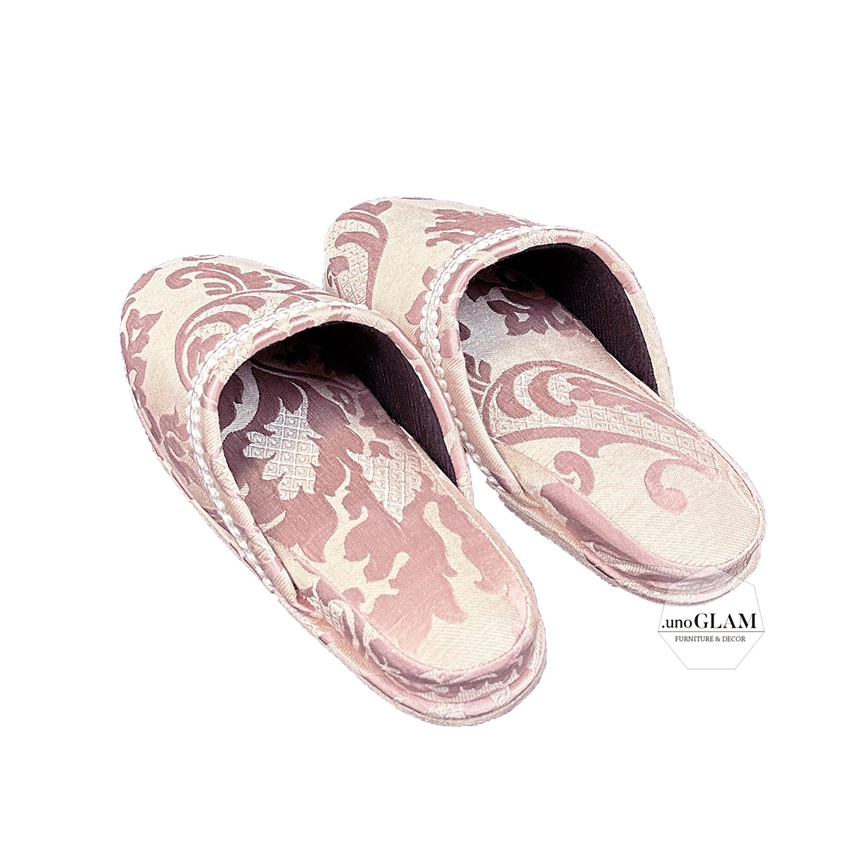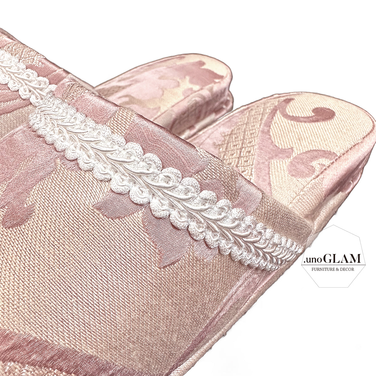 ベースはベビーピンクのアラベスク柄が全体にあしらわれた品格のあるスリッパです。さらにアクセントとしてスリッパの縁にブレードが施され、上品さを醸し出しています。