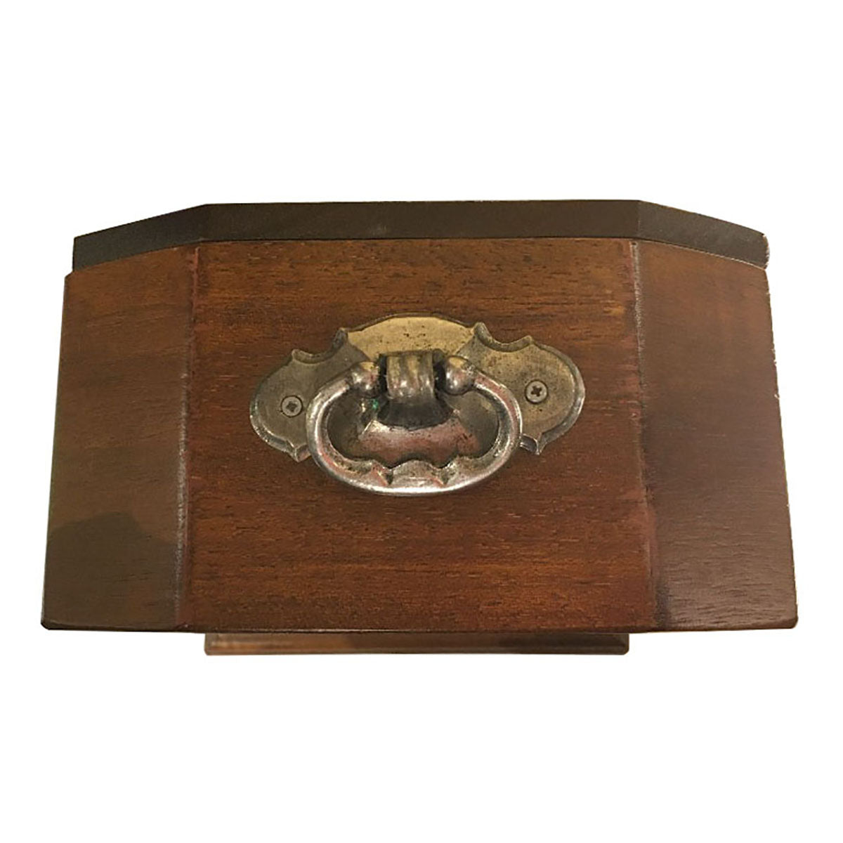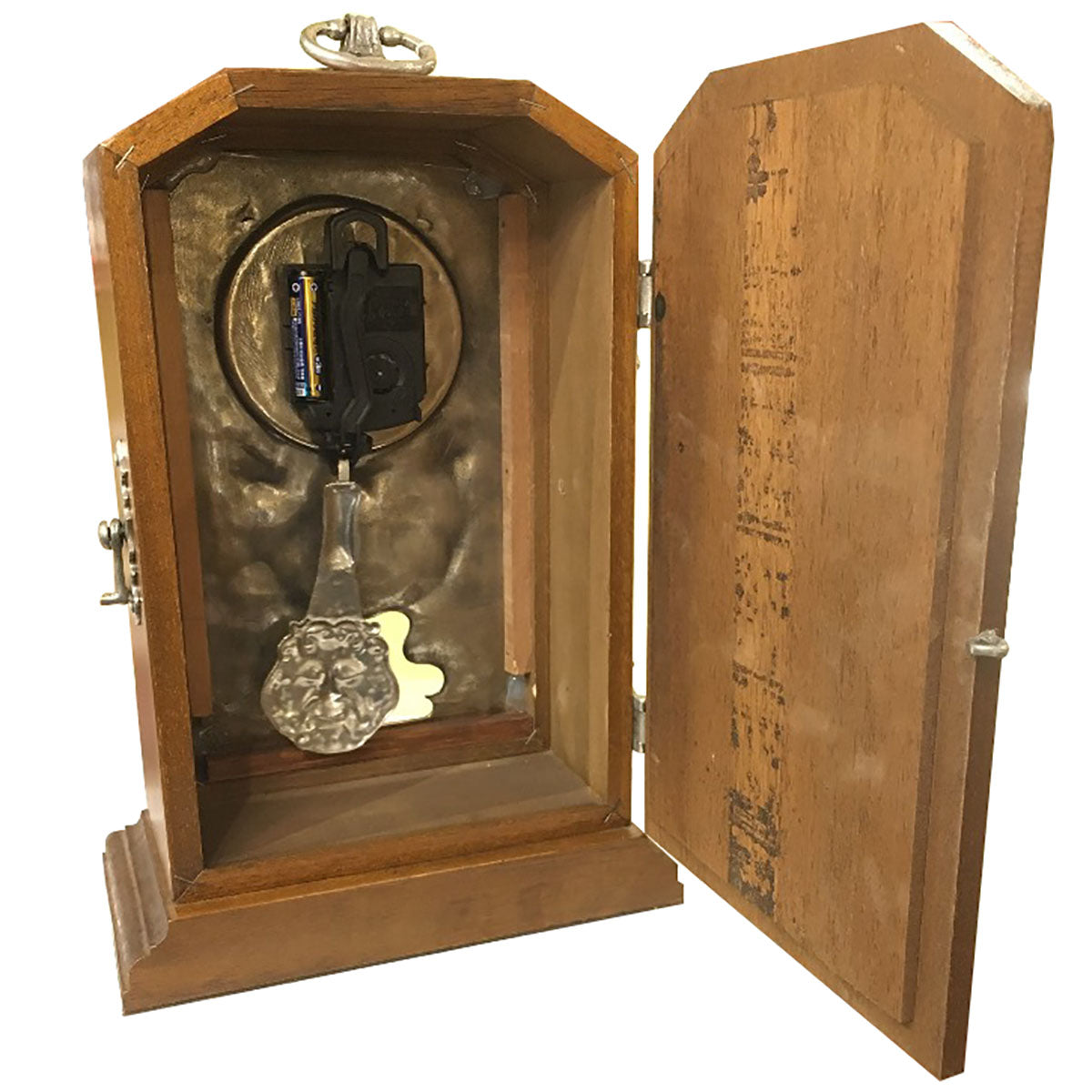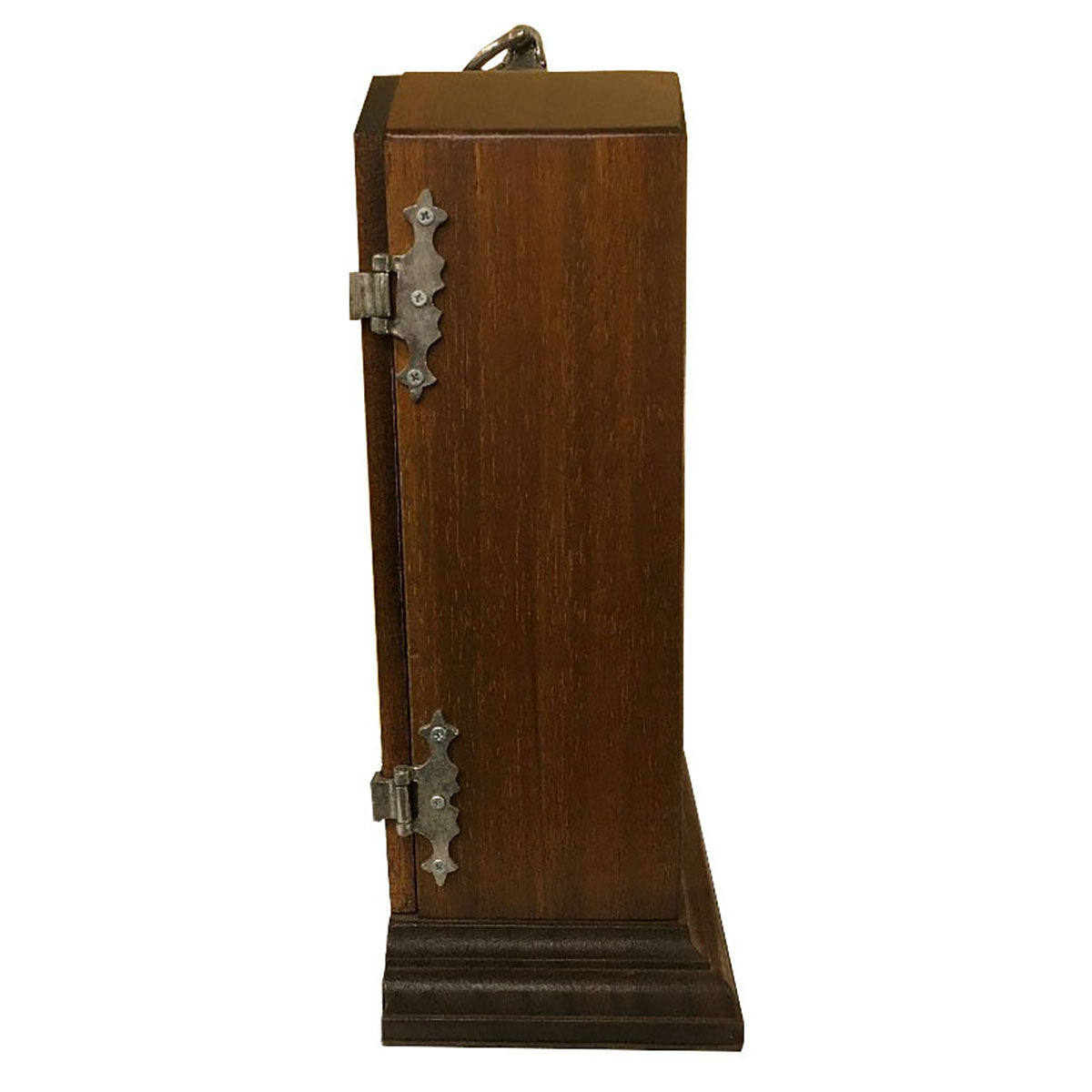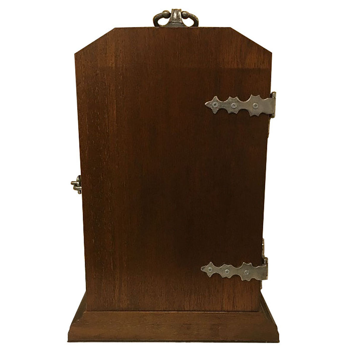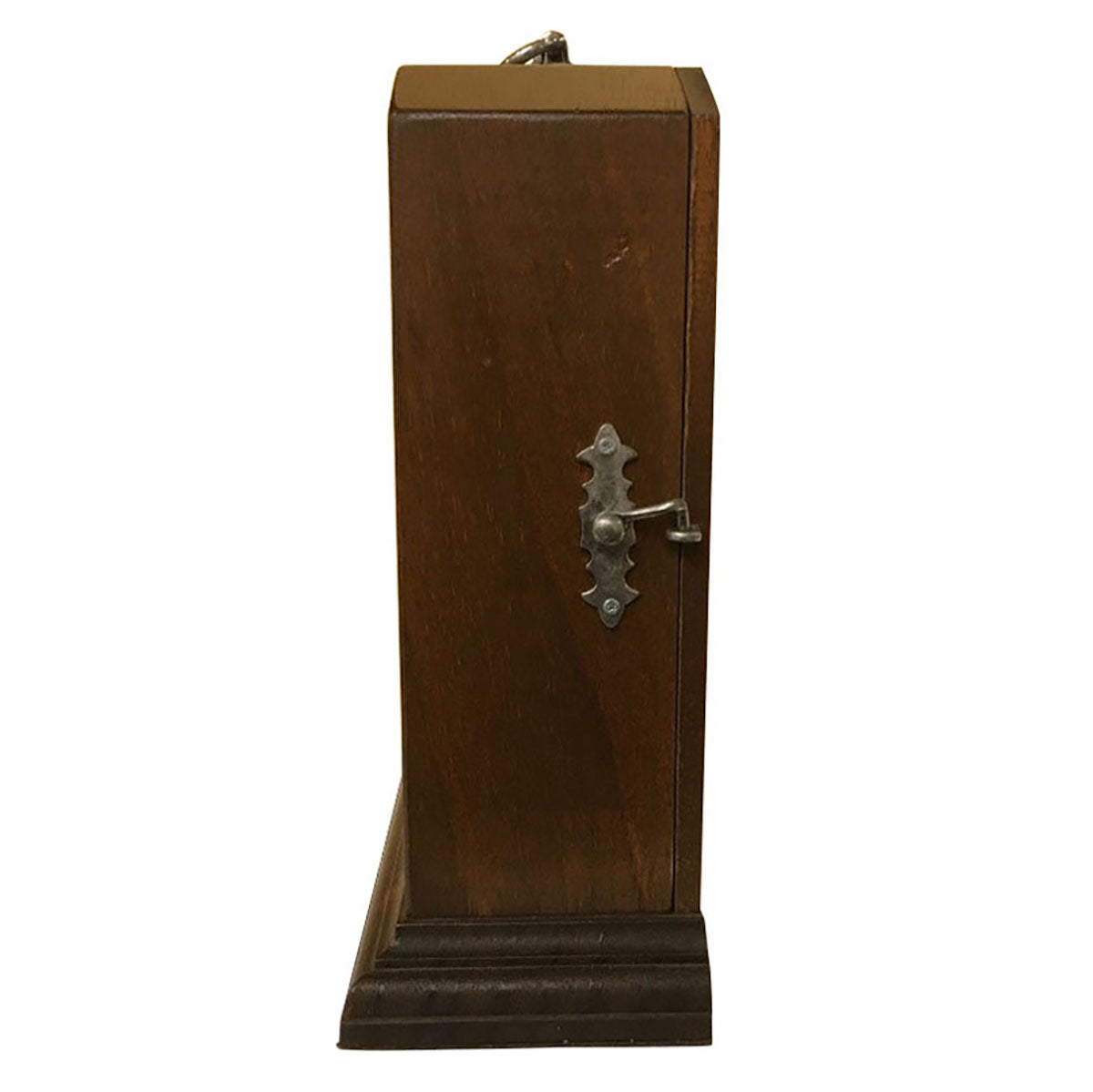 背面から側面にかけての蝶番や、時計上部の持ち手ハンドルにもピューターを使った遊び心のある装飾が施されていて、おしゃれなインテリアオブジェとしても活躍します。