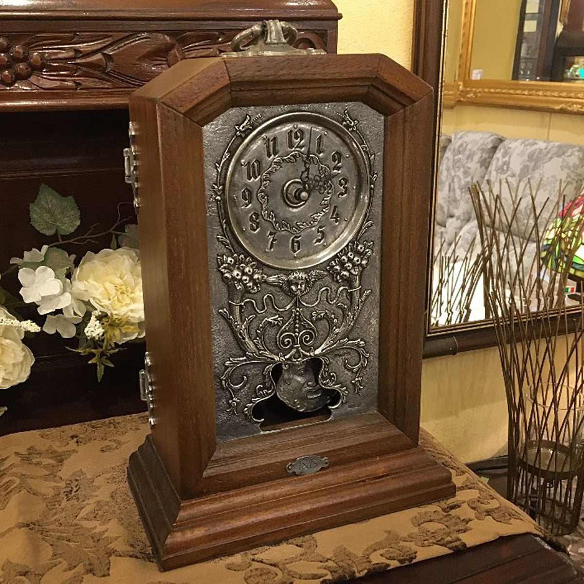 ヨーロピアンの雰囲気漂う、クラシカルなアンティーク風置き時計です。表面にはピューター(すず)がダイナミックに使われており、渋みのあるいい味を出しています。