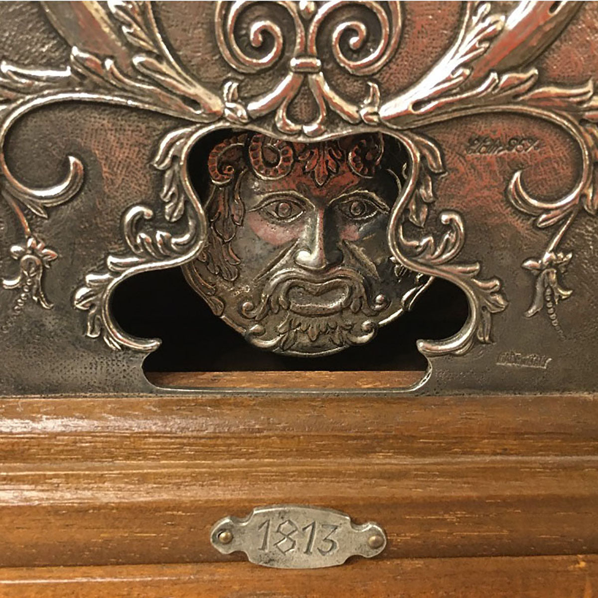 文字盤を含め、ピューターの細かく美しい装飾模様は、裏からハンマーなどで叩き出しており、卓越したイタリア職人の伝統の技を感じることができます。