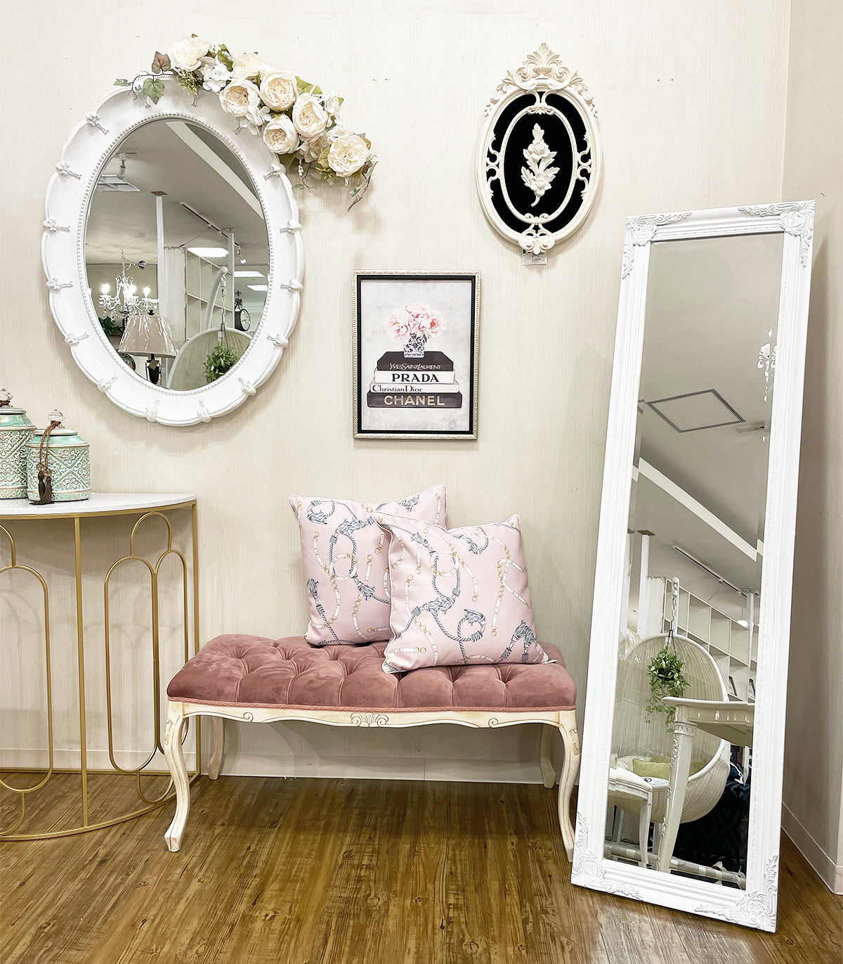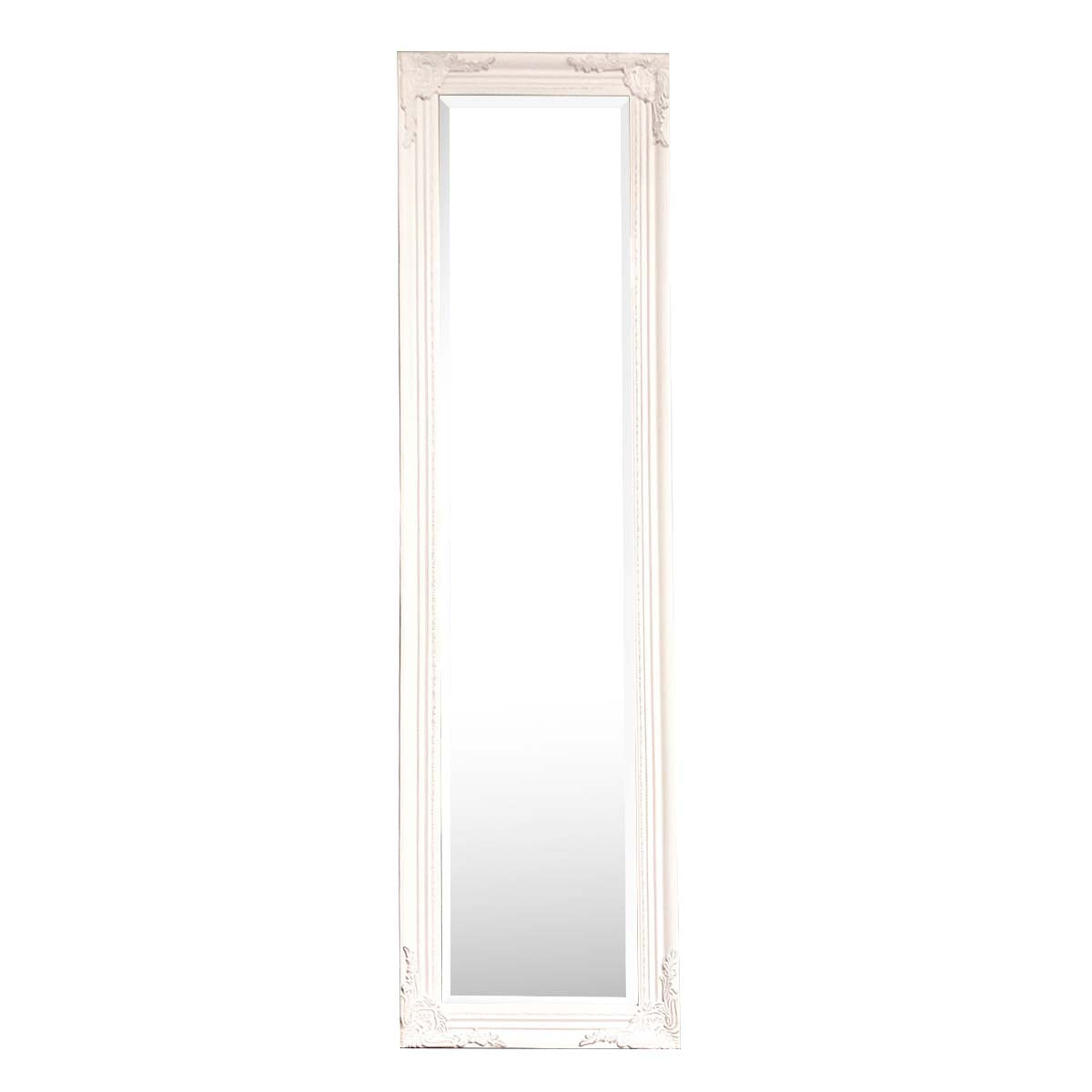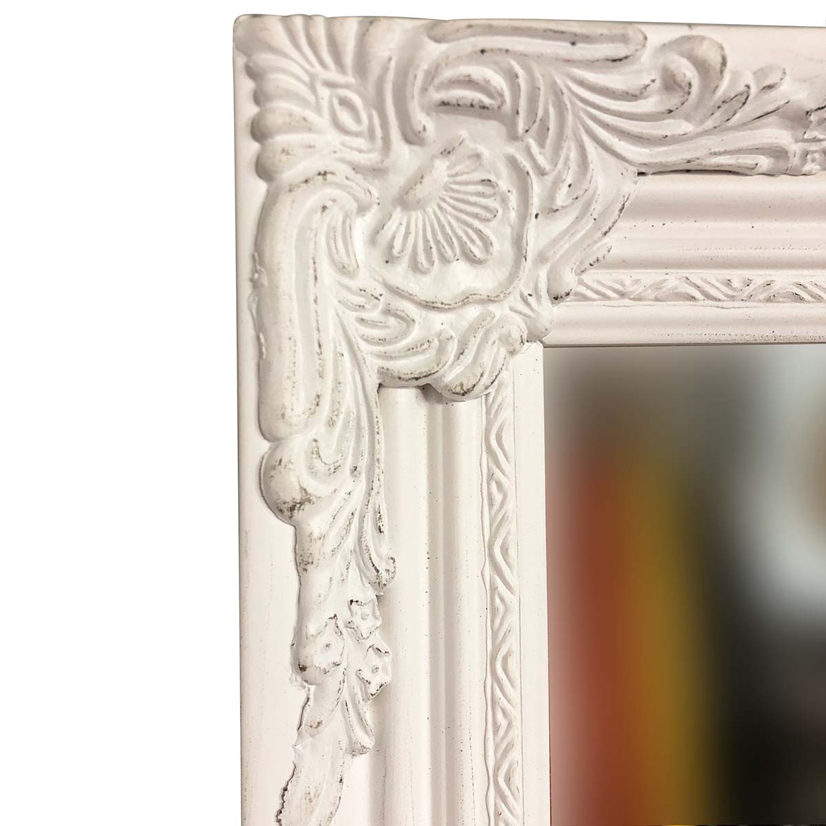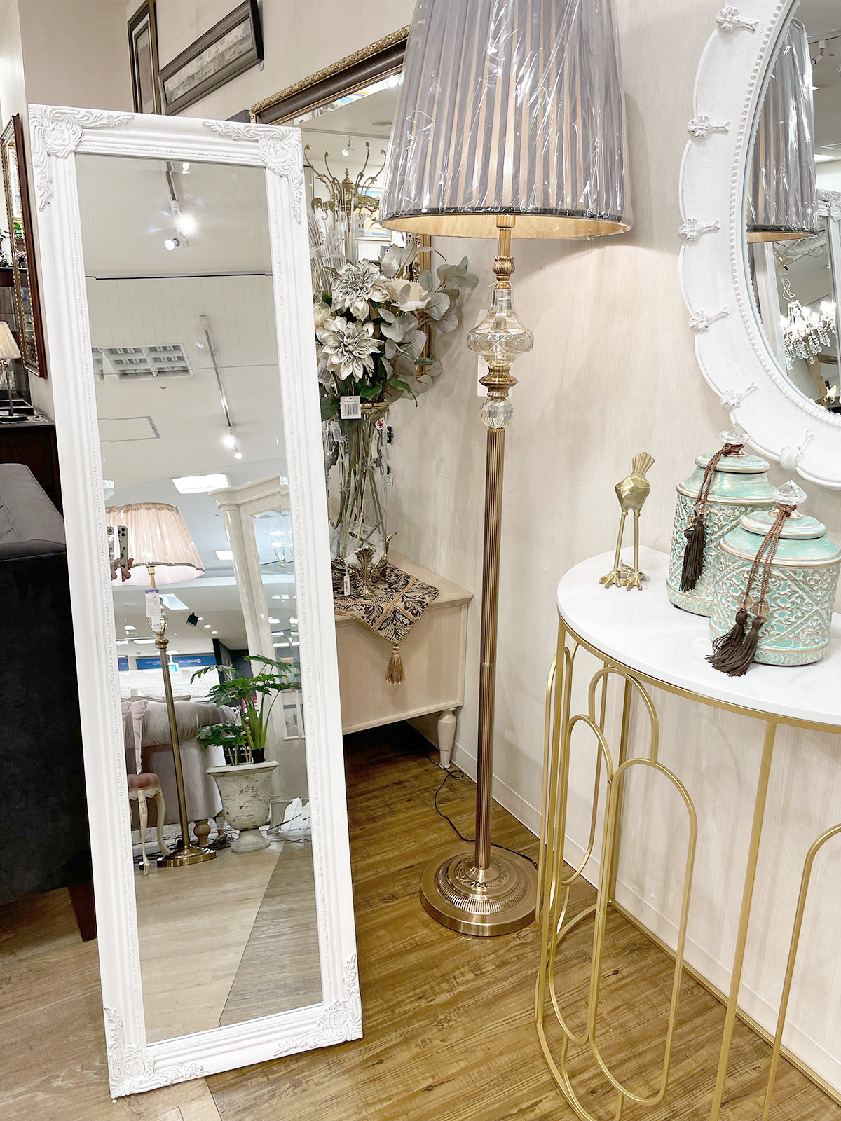 白色のウォールミラー(スタンド式ミラー)です。エレガントでアンティークなフレームデザインがおしゃれな姿見です。自立式なので好きな場所に自由に置くことができます。白の自立式のスタンドミラーはあまりなく、デザインの良さとお手頃なお値段で実店舗でも大人気のミラーです。