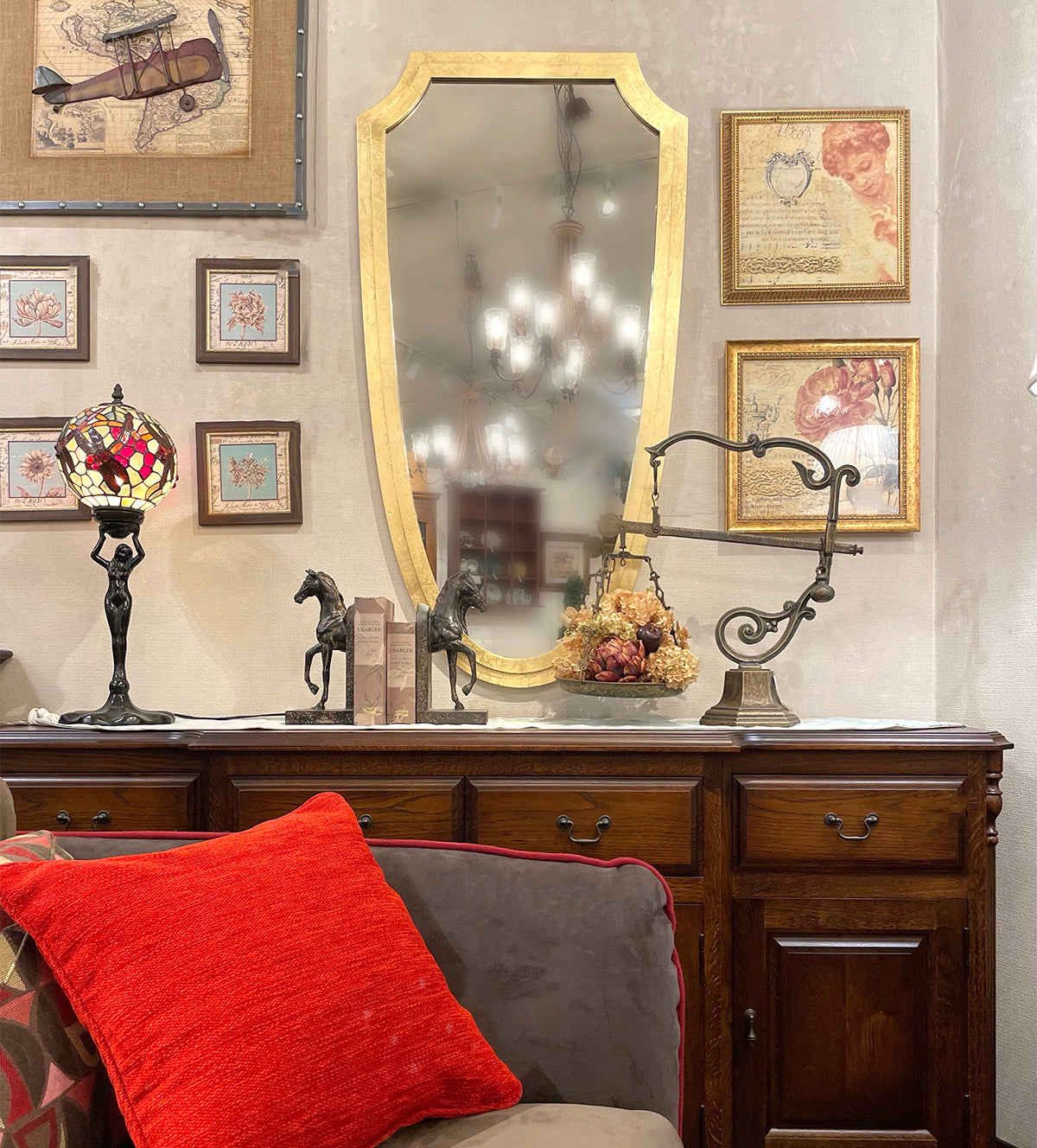 シンプルでモダン、リビングや玄関などにおしゃれに飾りたいゴールドミラーが入荷致しました。 古代の盾を思わせるダイナミックでユニークなフォルムのウォールミラーは他では見ることのできないデザインです。