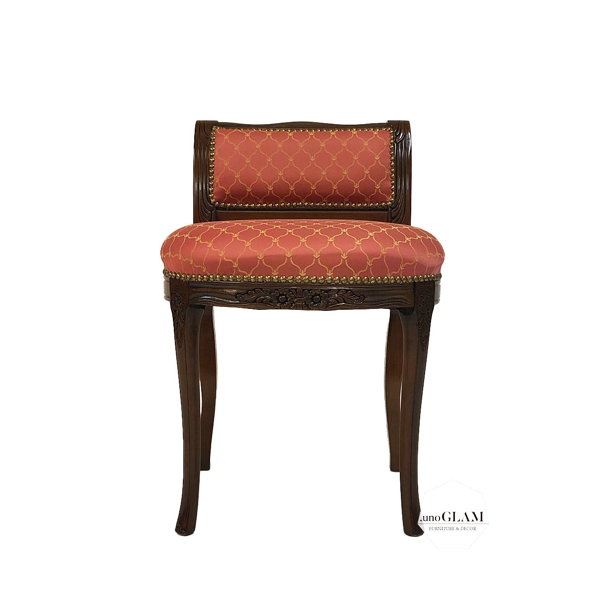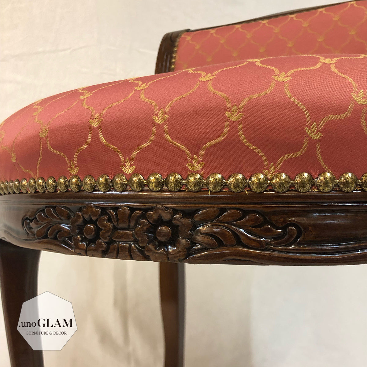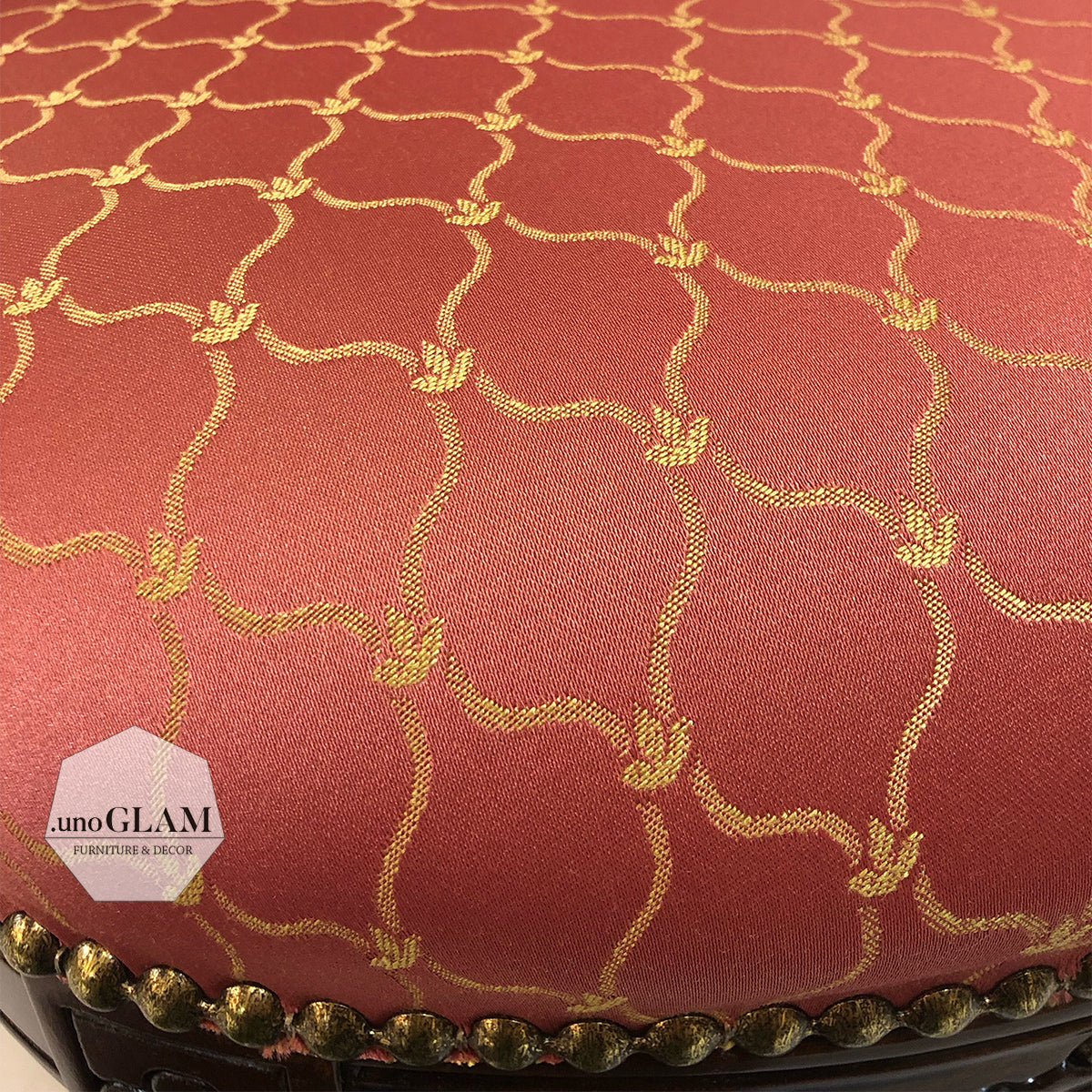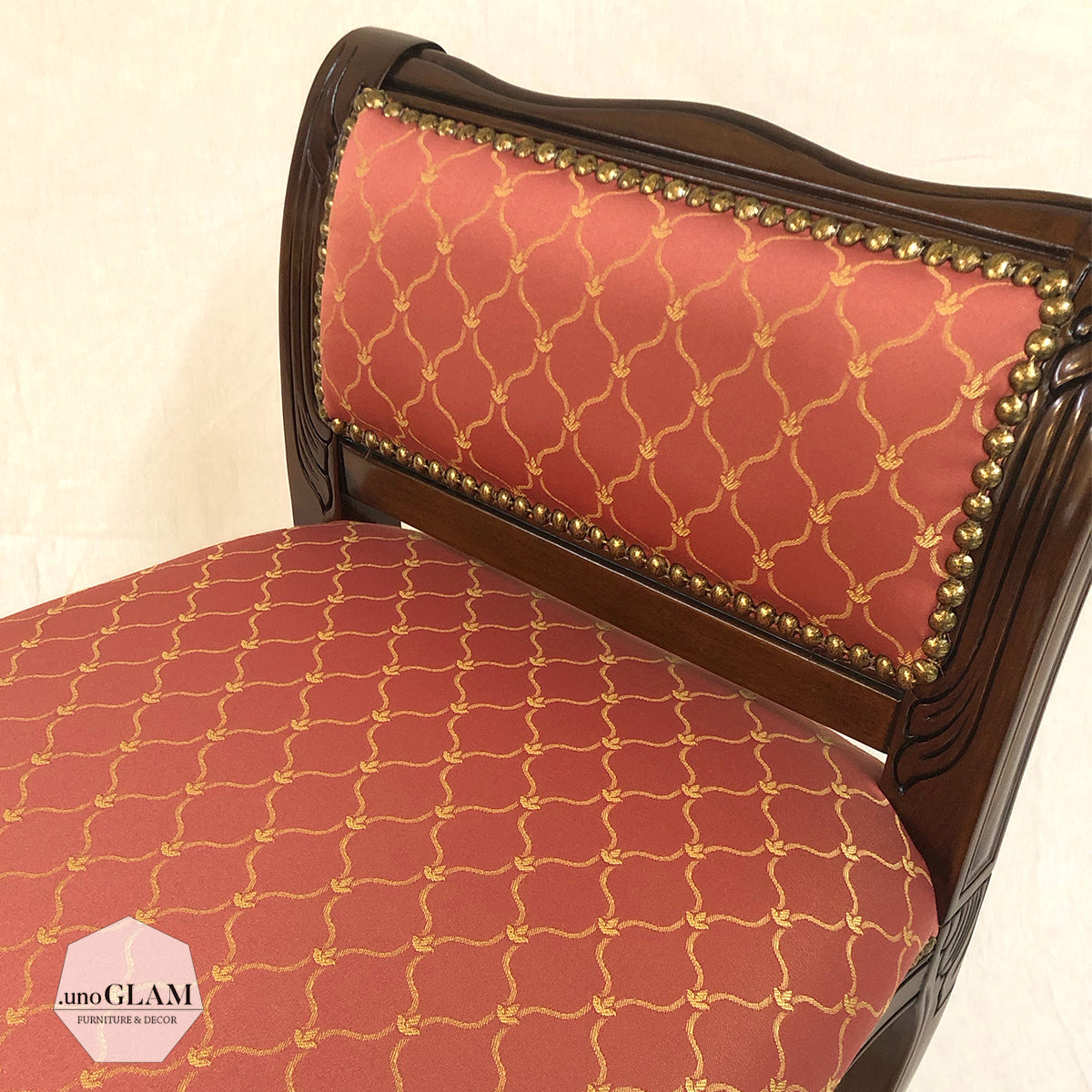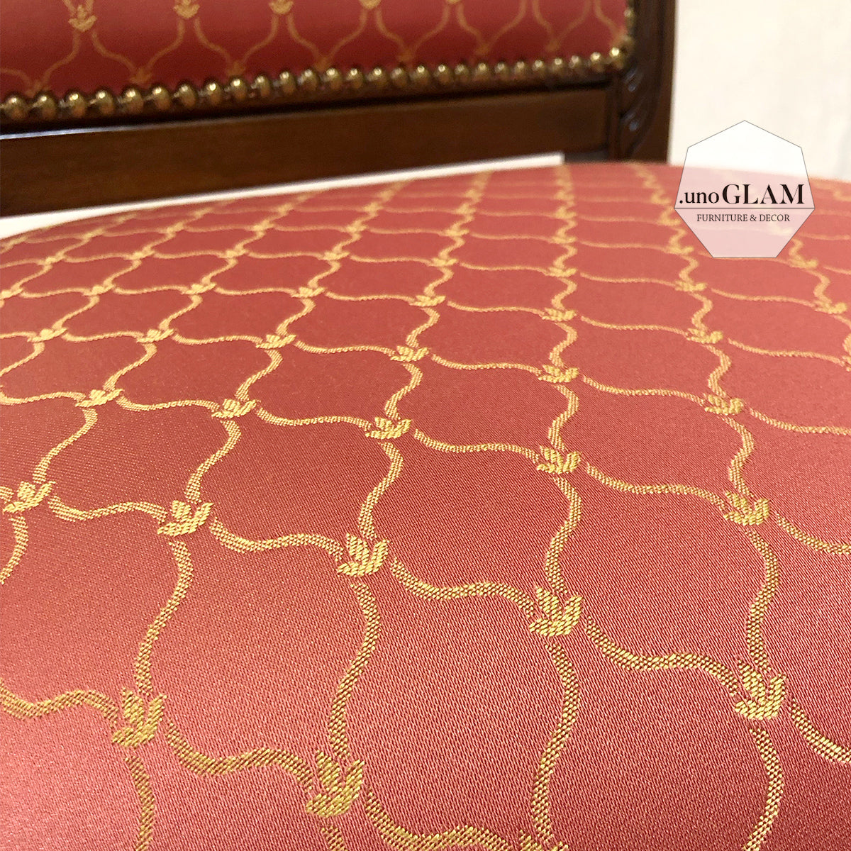 エンジ色の上品な張地と伝統的なイタリアンクラシックが愛らしい猫脚スタイルのチェア。ゴールドの格子模様がシンプルで上品な雰囲気を醸し出します。生地は張りがありパリッとした触り心地です。