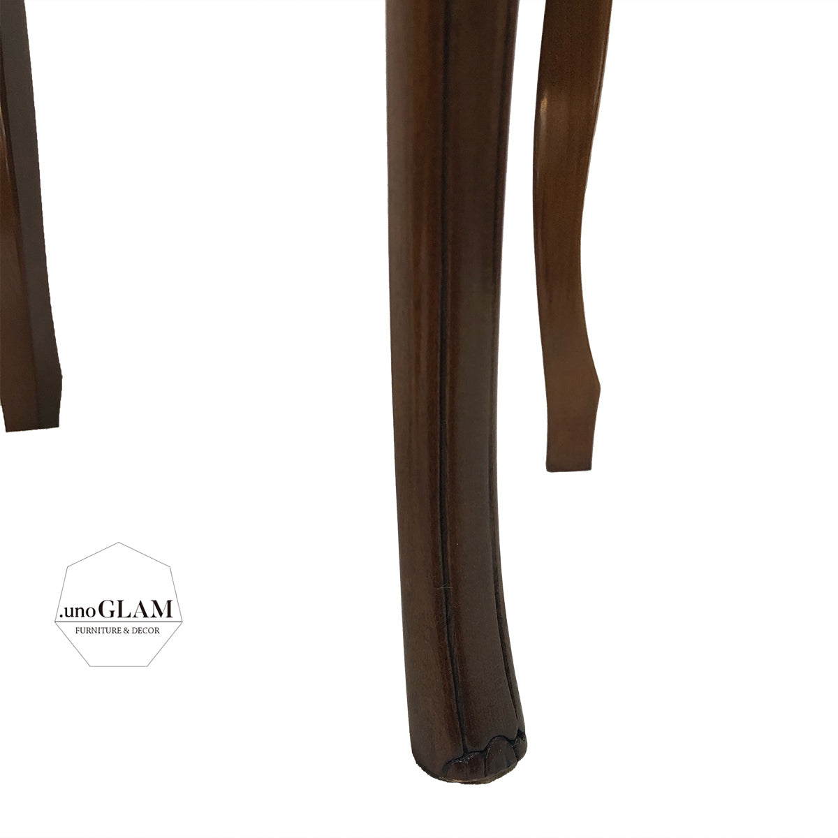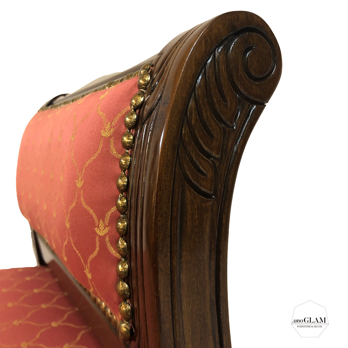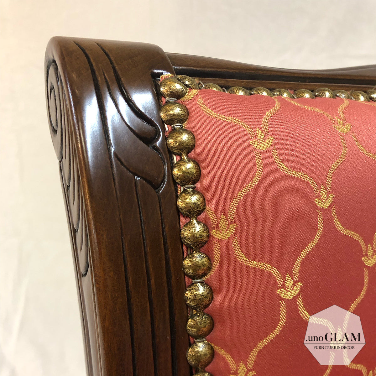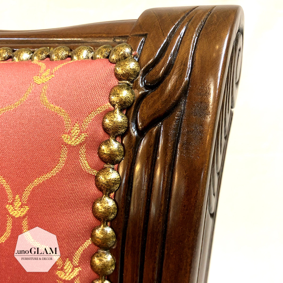 木部には装飾性のある彫刻掘りがほどこされています。また、座面と背クッション部はゴールド色の鋲打ちで仕上げており高級感があります。