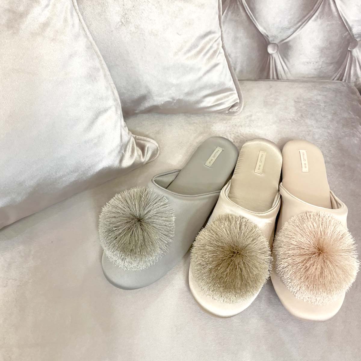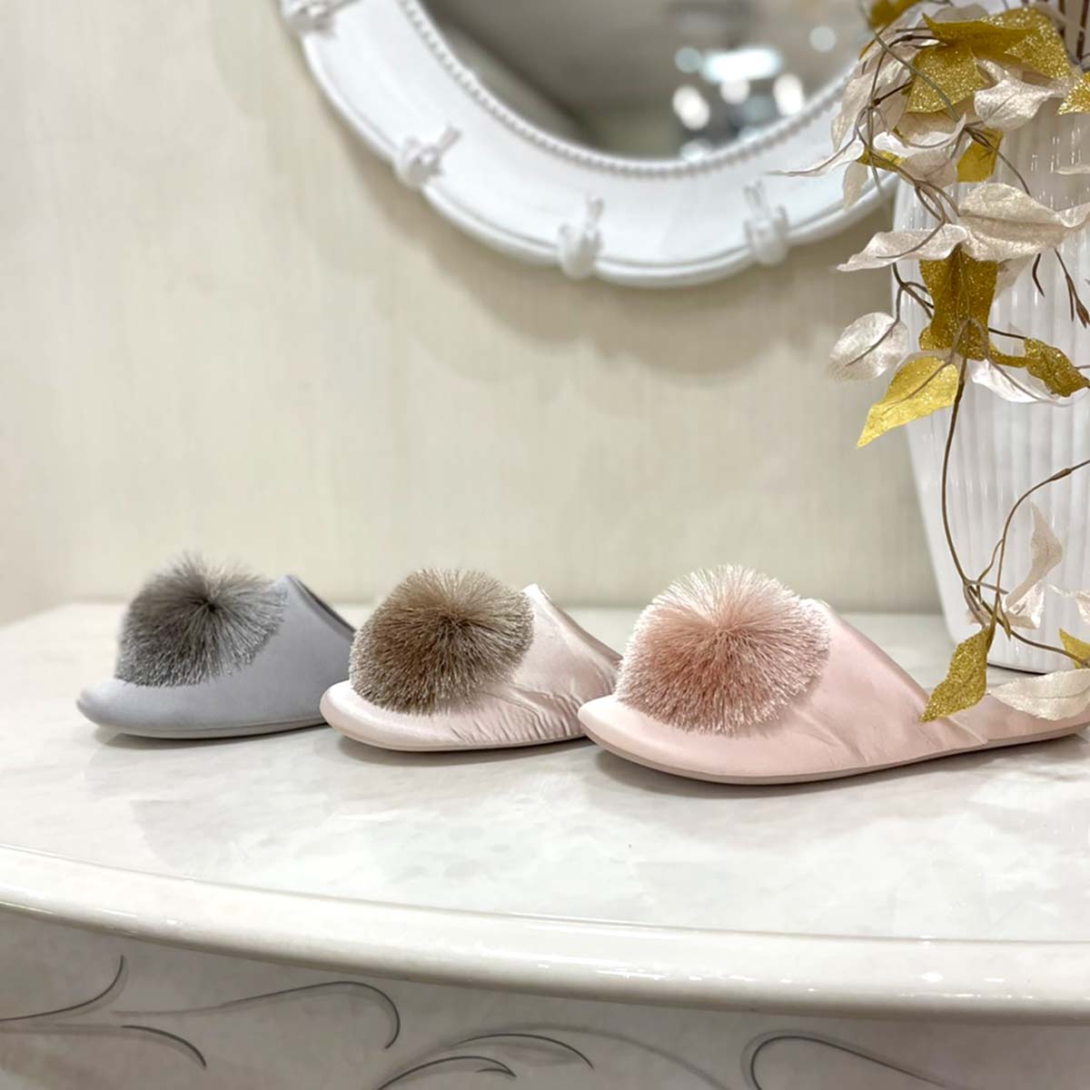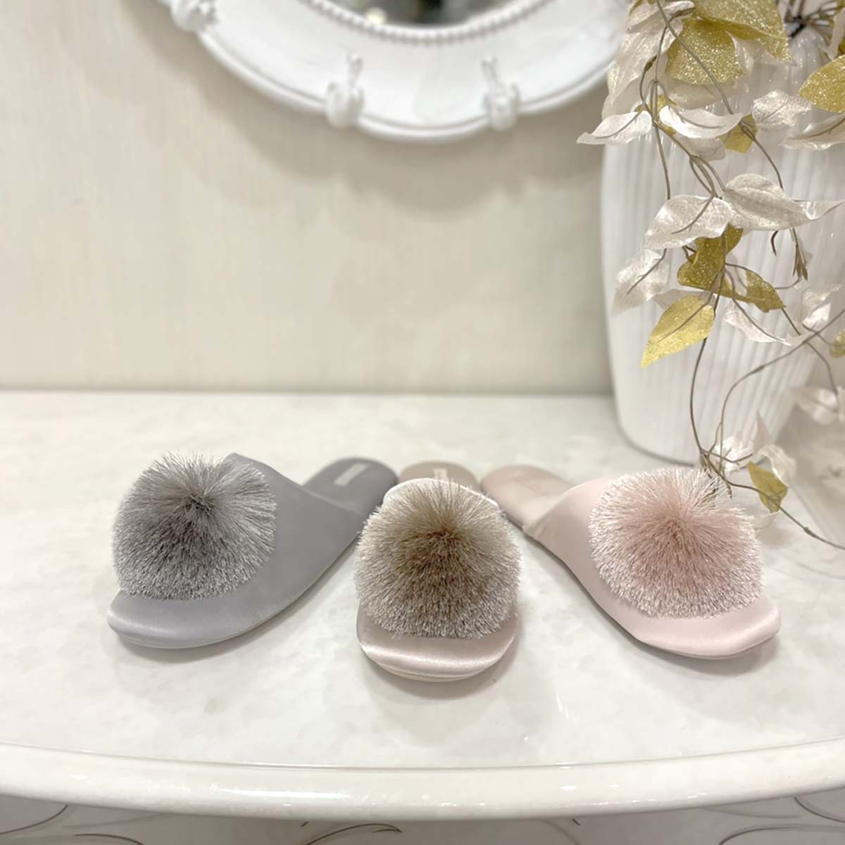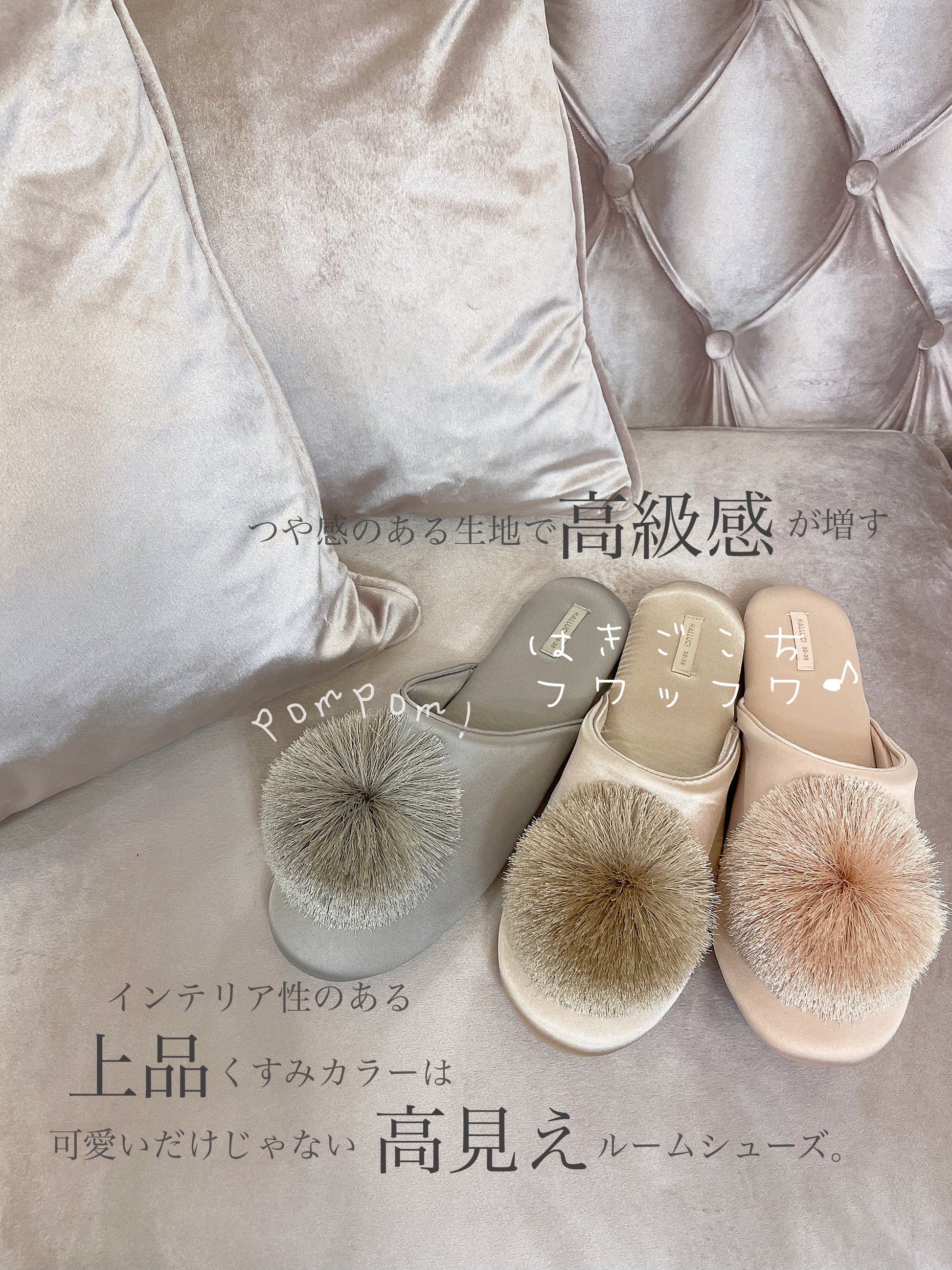 上品なくすみカラーとふわふわでボリューミーなBONBON飾りとが大人な雰囲気の、高級感のあるおしゃれなスリッパです。
