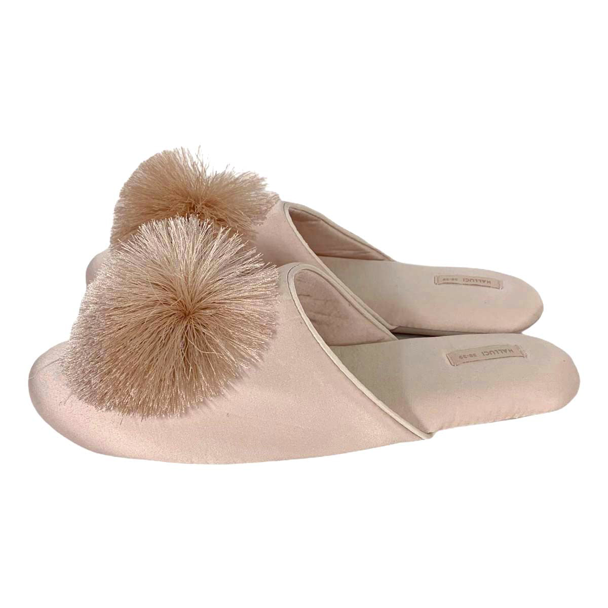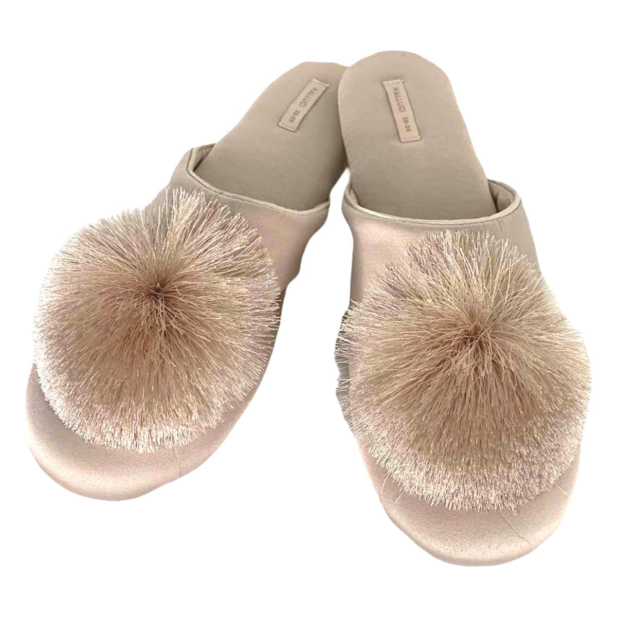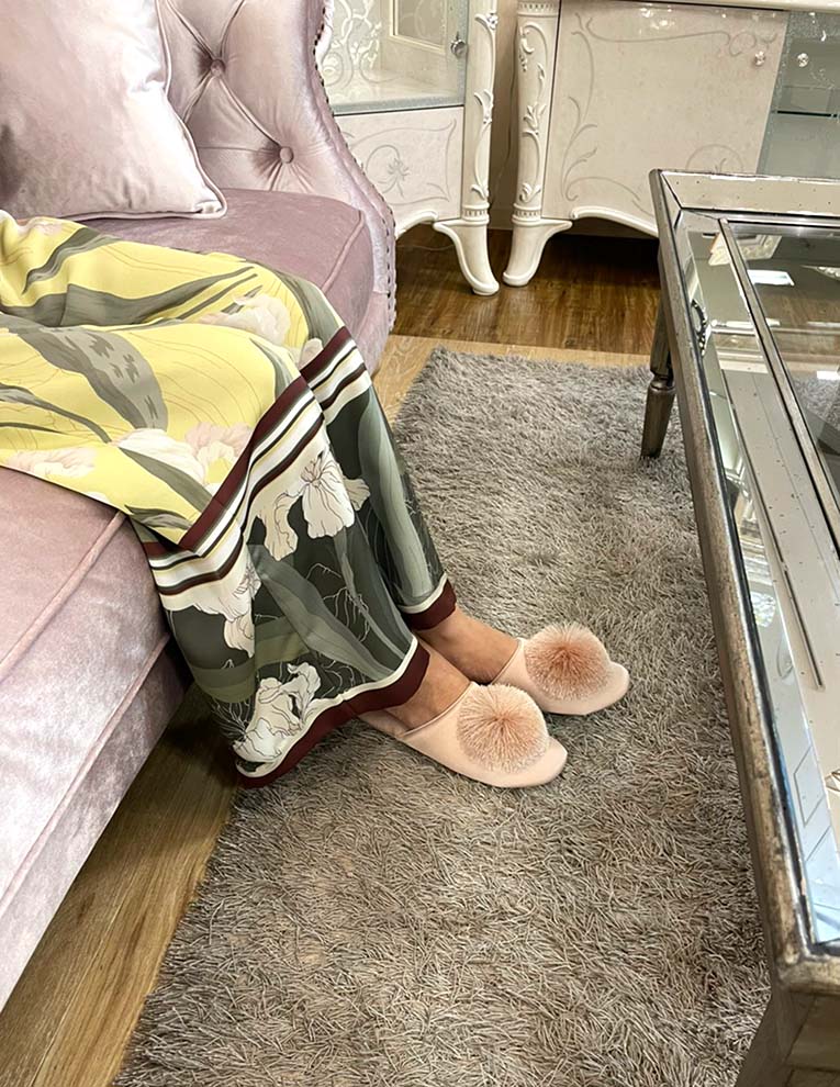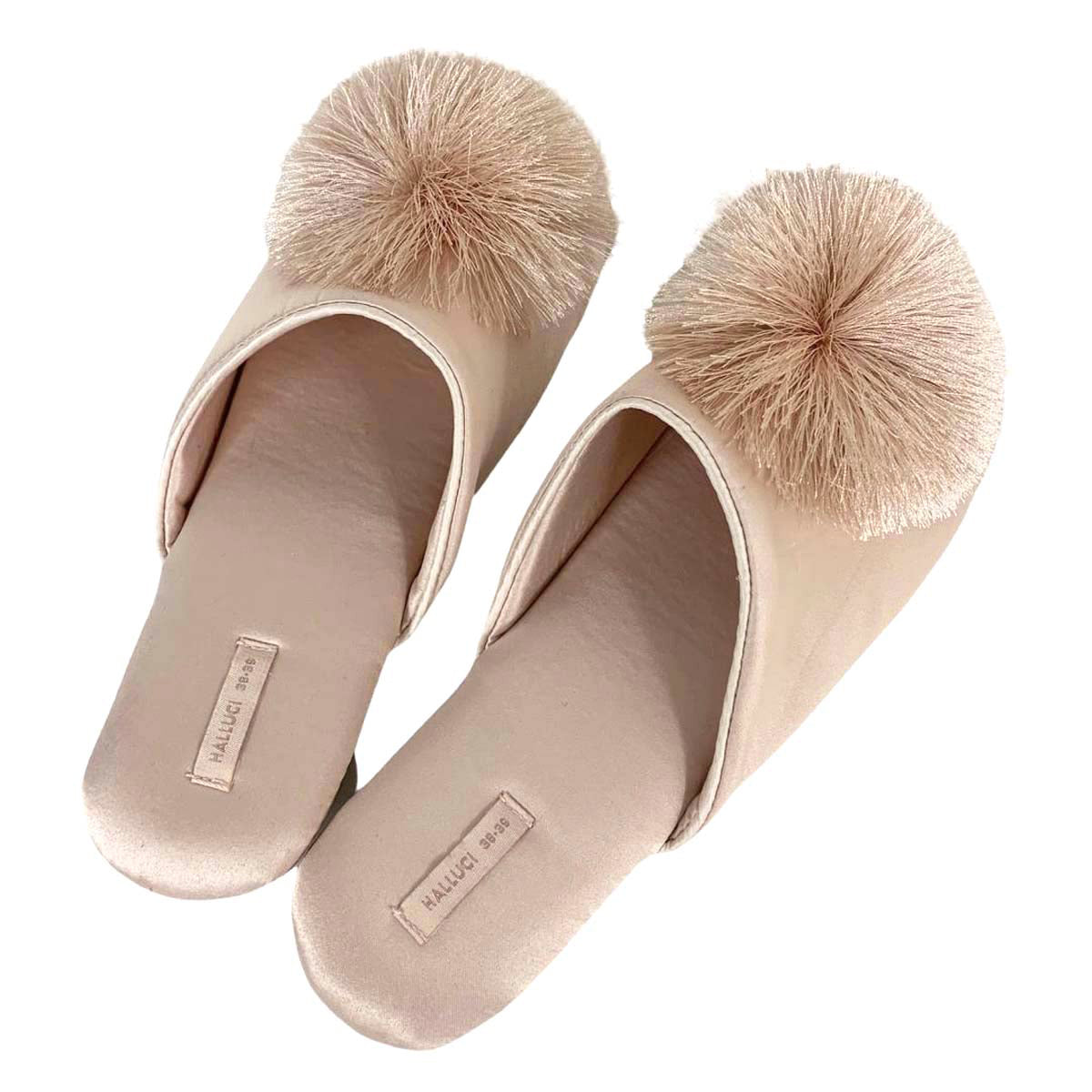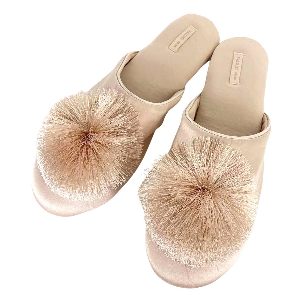 上品なくすみカラーとふわふわでボリューミーなBONBON飾りとが大人な雰囲気の、高級感のあるおしゃれなスリッパです。